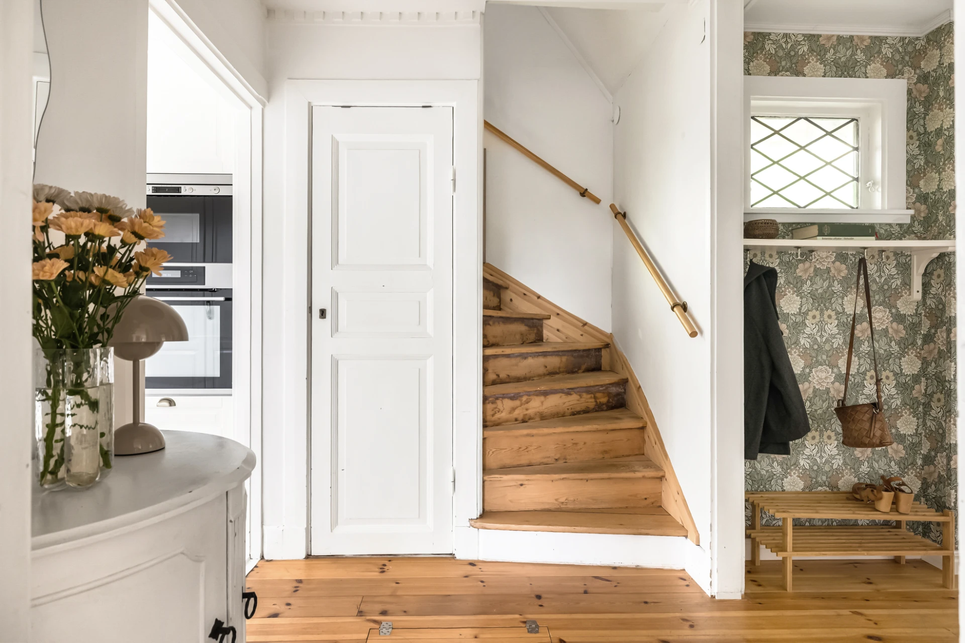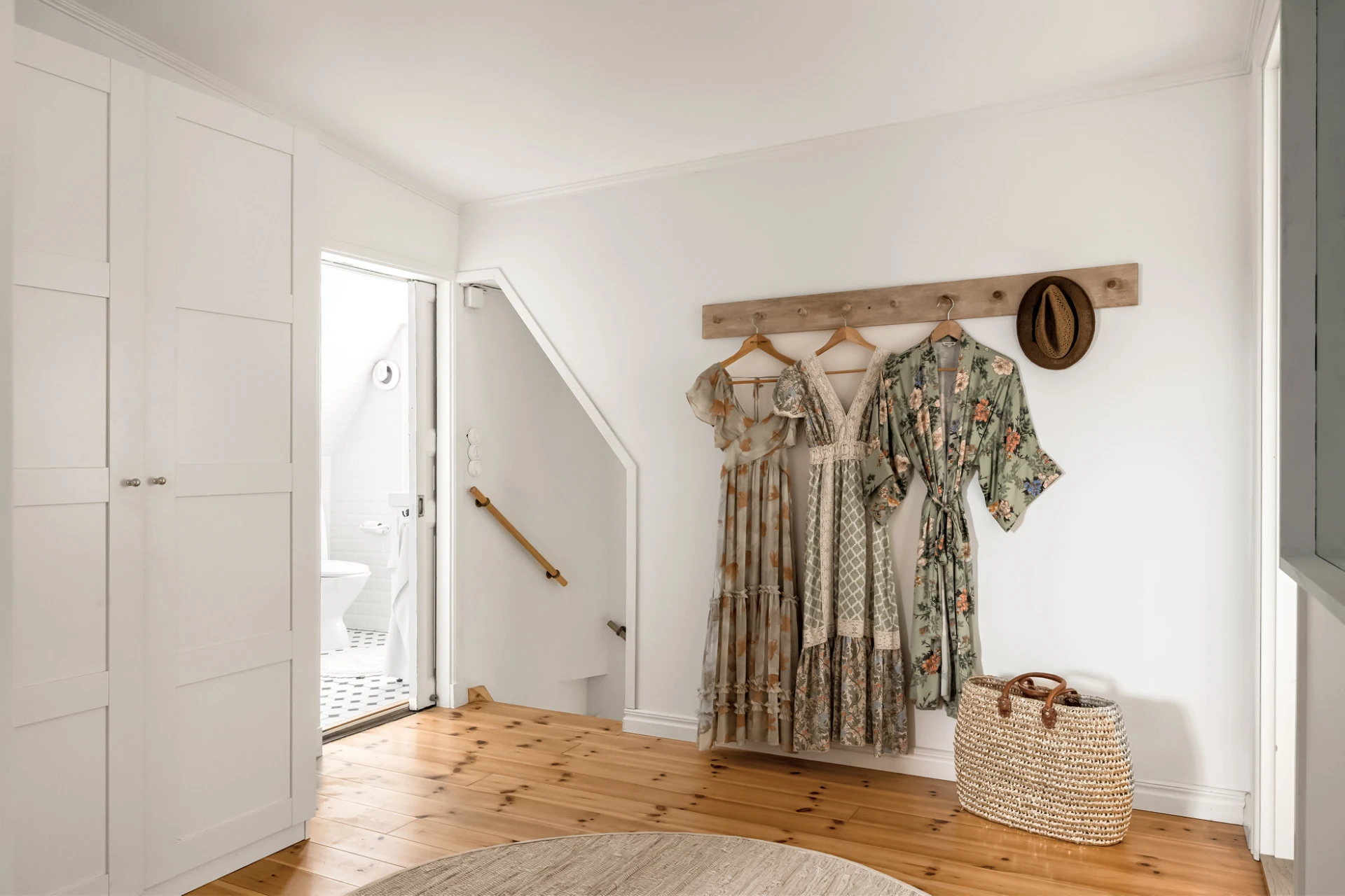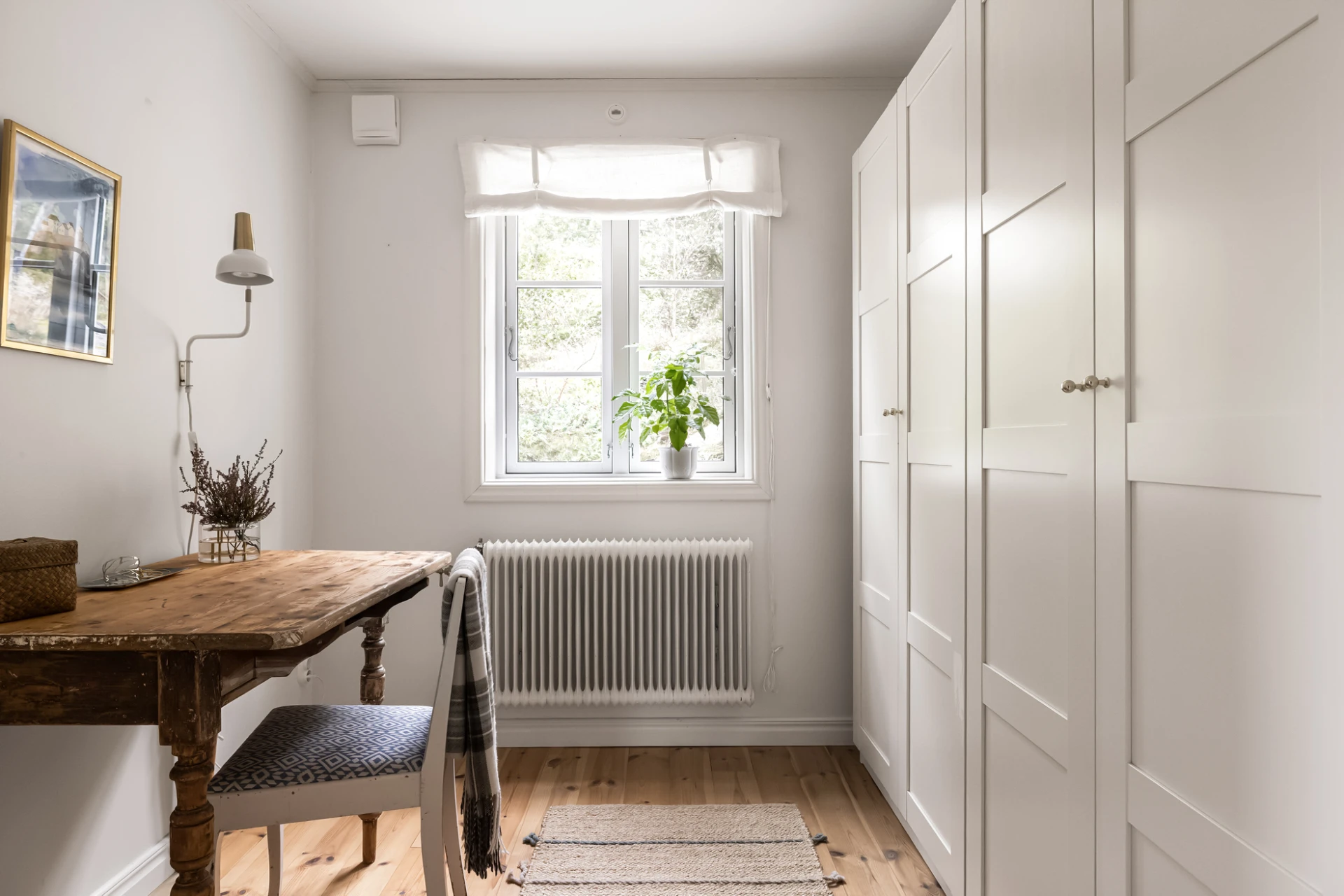 Furugolv och ljust målade väggar. Här finns förvaringsmöjligheter i garderober.