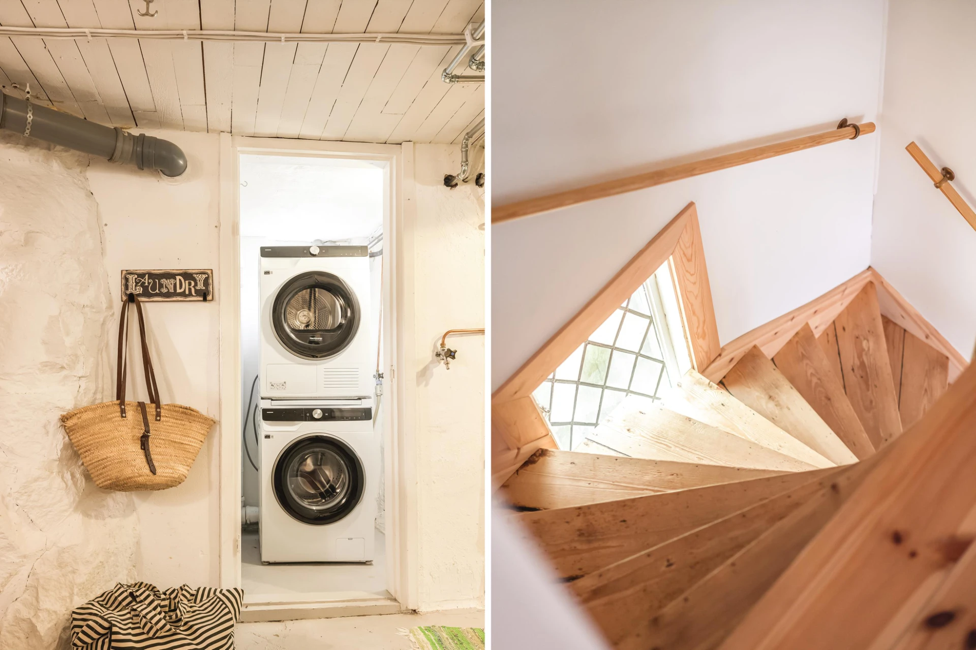 Strax innanför hallen finns en lucka som leder ner till bostadens källare. Här finns tvättstuga med tvättmaskin och ny torktumlare (Samsung, 2024), samt utrymme för att hänga upp tvätt. Källaren rymmer även en matkällare och bergvärmepump, och nås dessutom via en separat ytterdörr.
