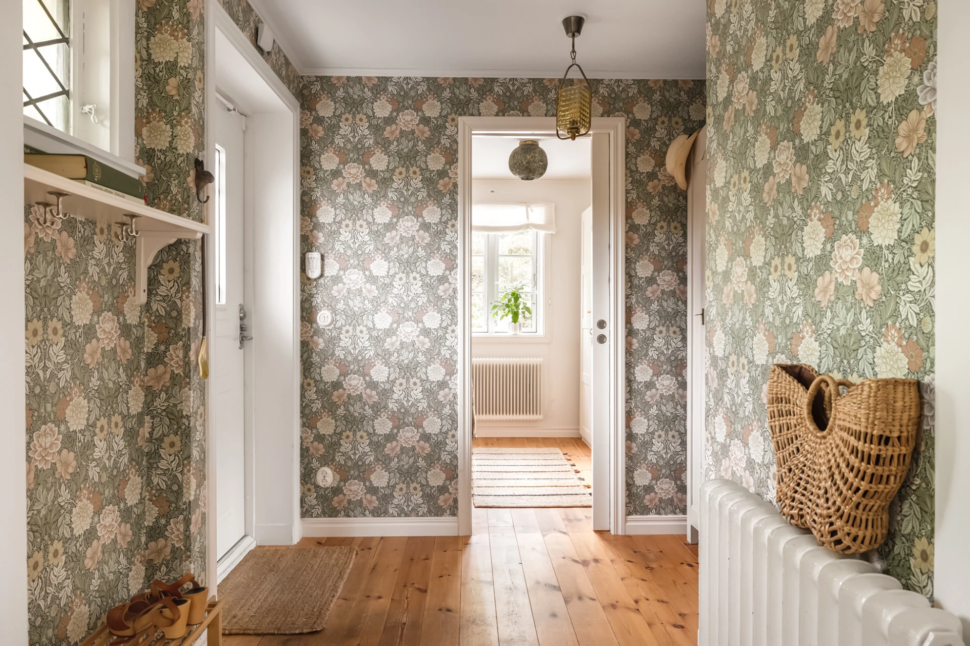 Furugolv och väggar i en mönstrad tapet. Här finns plats för avhängning av kläder samt garderober som ger ytterligare förvaring.