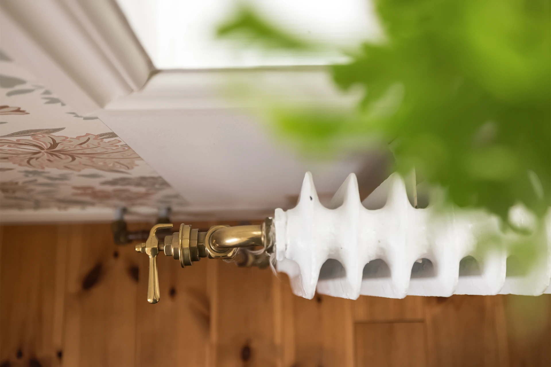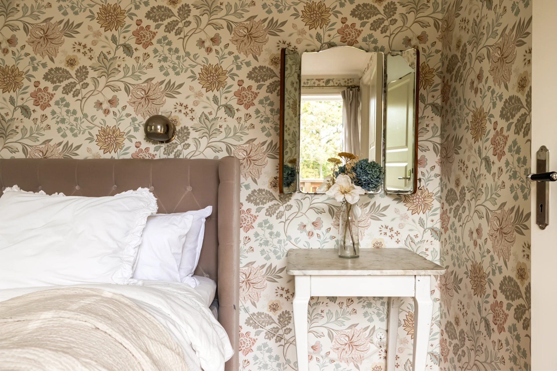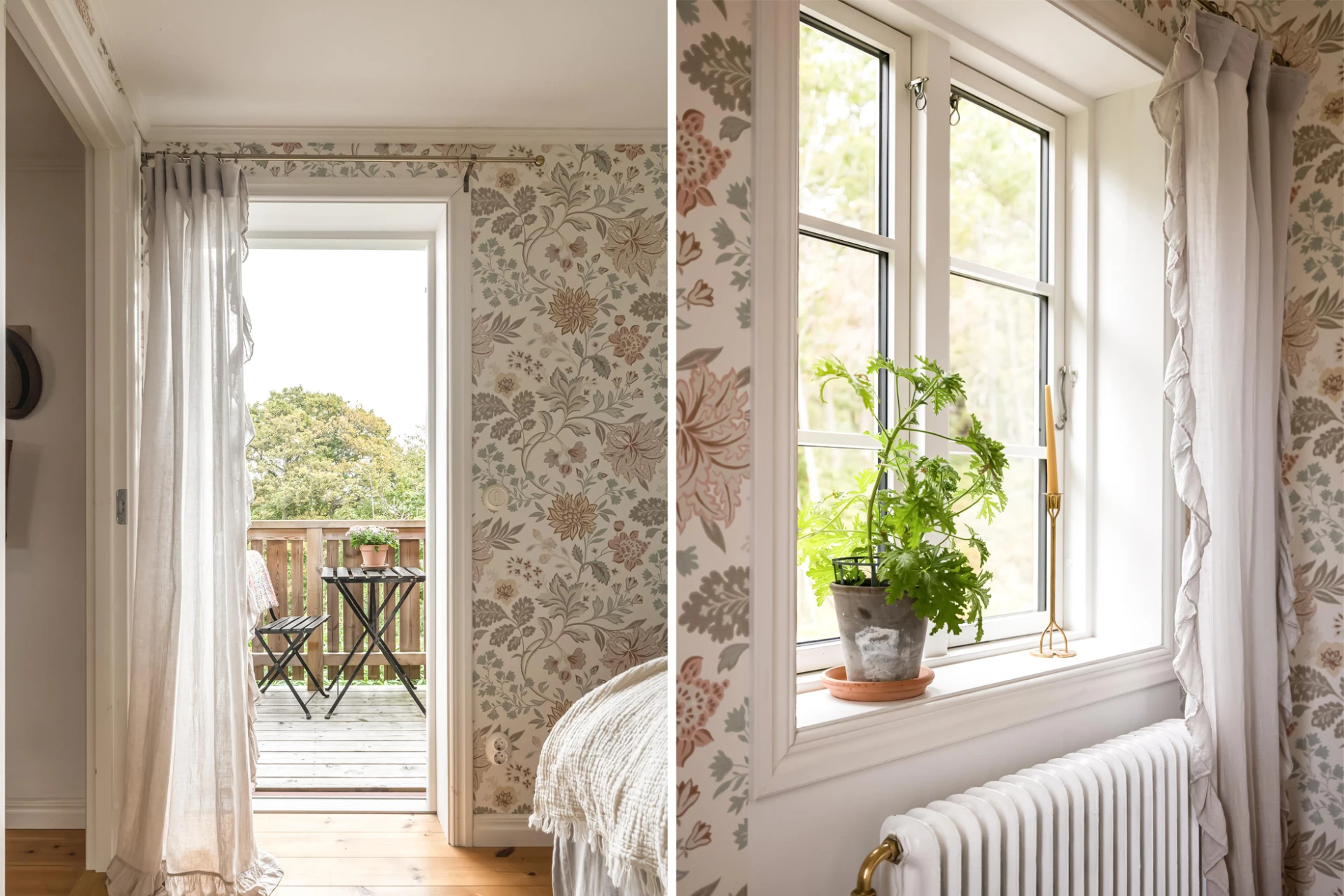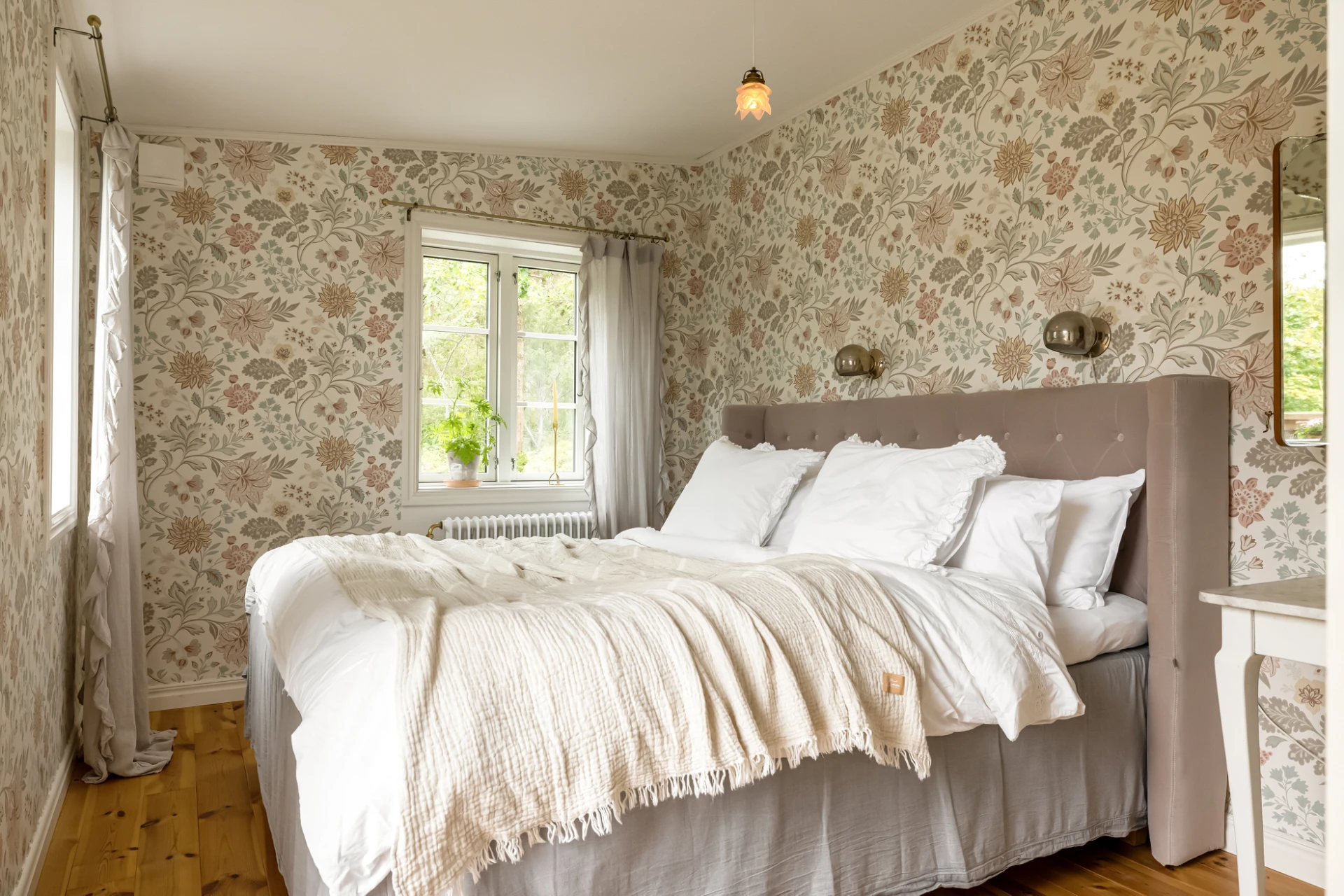 Furugolv och väggar i mönstrad tapet skapar ett trivsamt sovrum. Här finns plats för dubbelsäng med tillhörande möblemang och utgång till bostadens balkong med förmiddagssol.