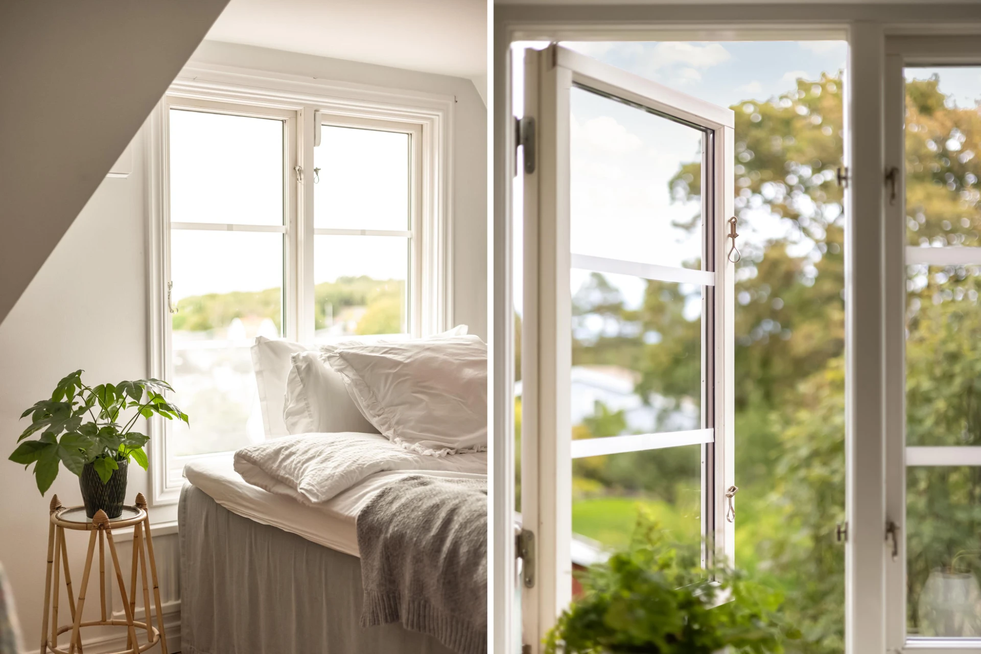 Furugolv och ljust målade väggar i en grå/beige nyans skapar ett ljust och rymligt sovrum. Här finns plats för större säng med tillhörande möblemang, samt arbetshörna för den som önskar.