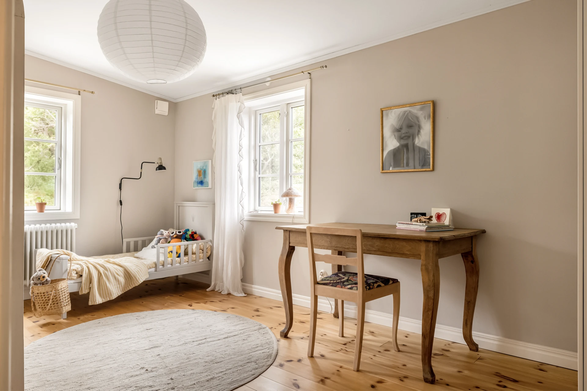 Furugolv och ljust målade väggar skapar ett ljust och trivsamt rum. Här finns plats för en arbetshörna med tillhörande möblemang och rummet kan även användas som gästrum eller sovrum. Goda förvaringsmöjligheter erbjuds i garderober.