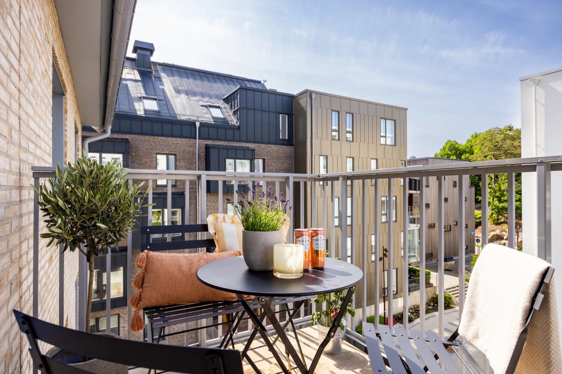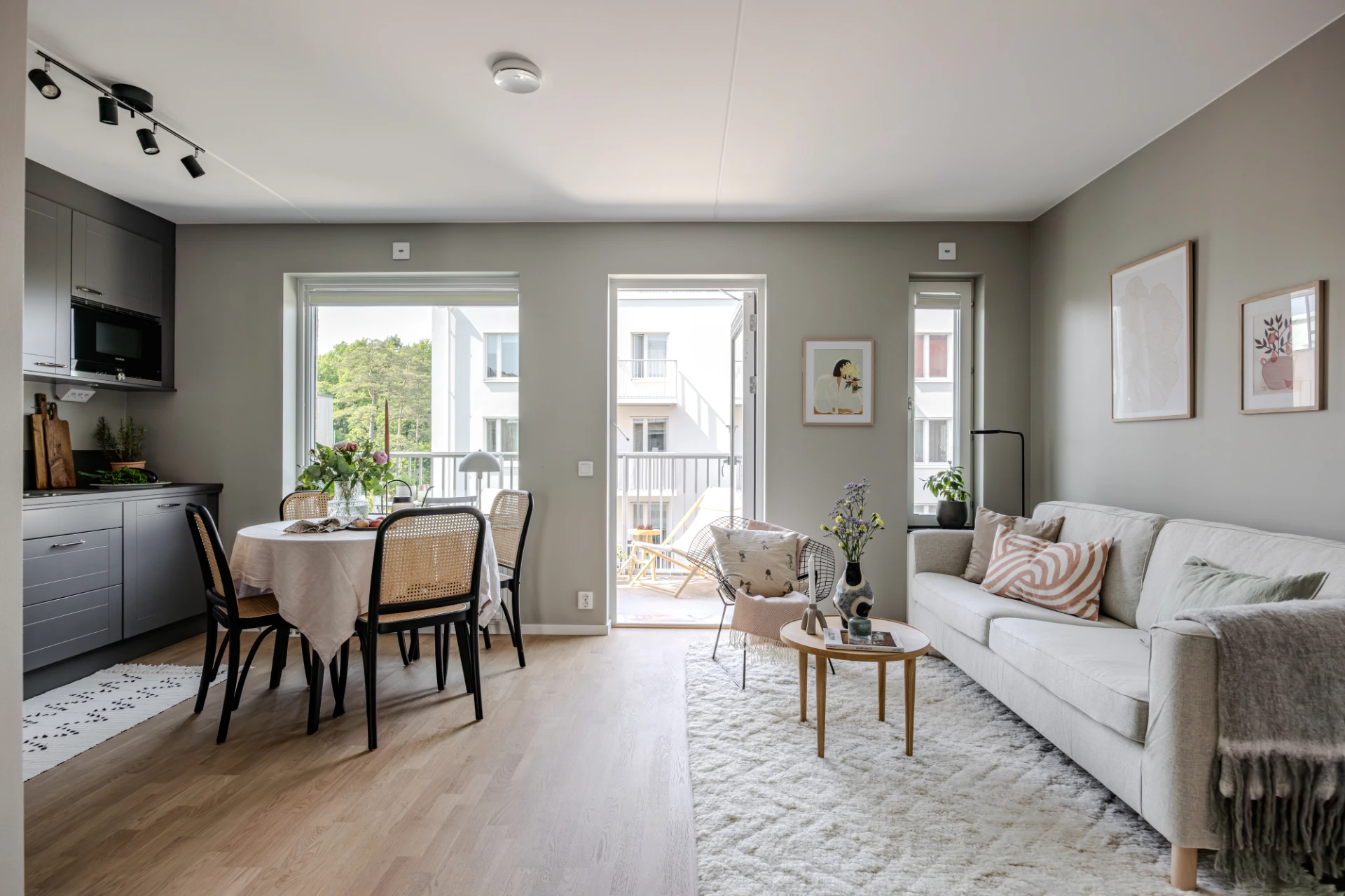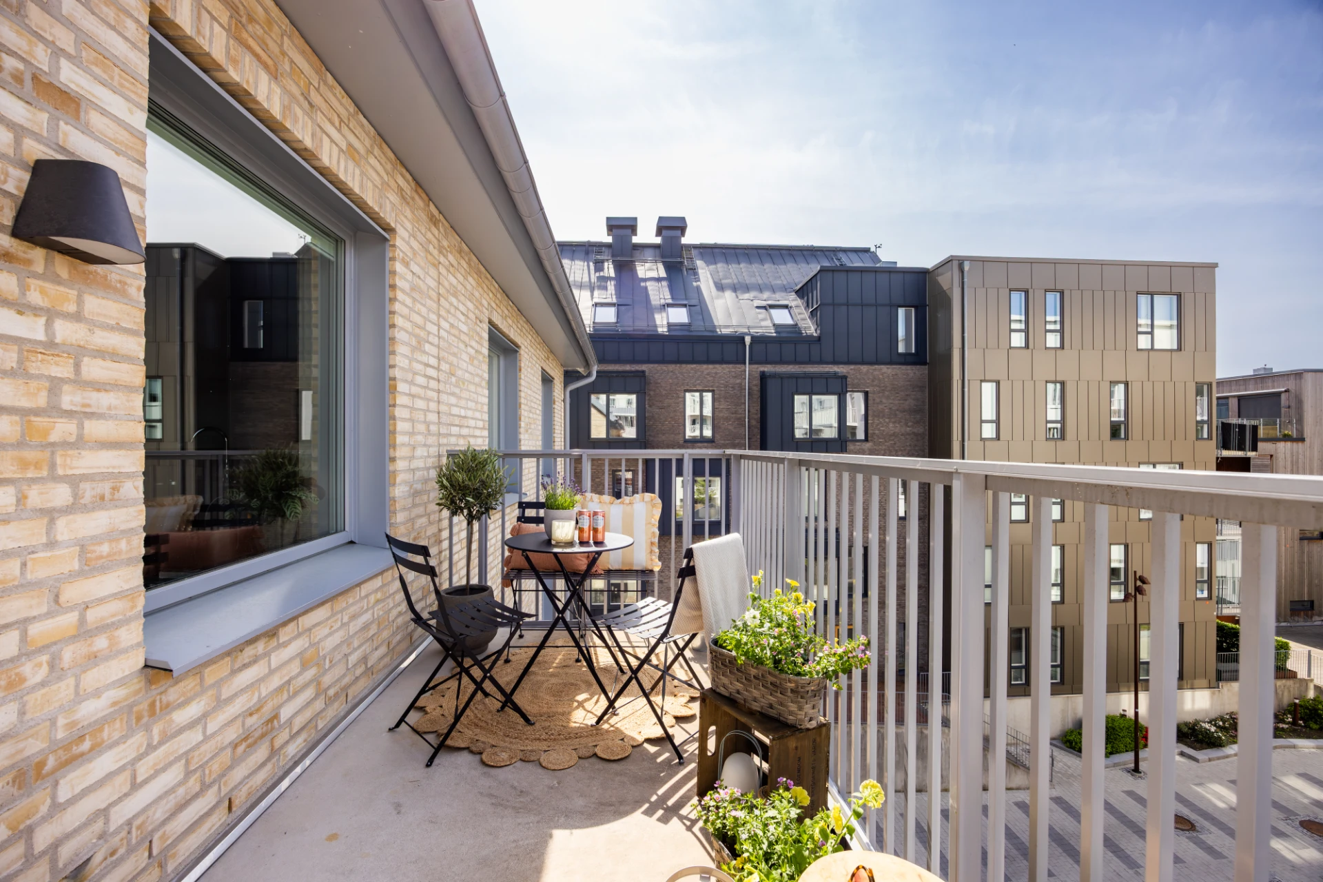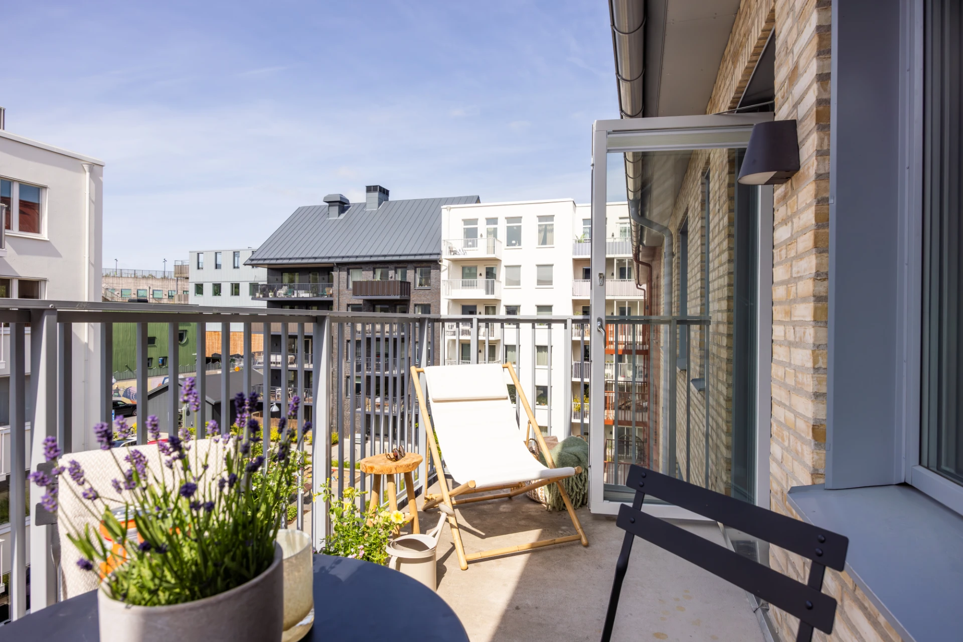 Vardagsrummet som sömlöst harmonierar med köket är perfekt planerad yta. Här finns plats för soffa med tillhörande möblemang. Från vardagsrummet nås bostadens höjdpunkt, den rymliga balkongen med gott om eftermiddagssol. Balkongen förlänger bostaden under säsong och rymmer såväl sittmöblemang som odling för den som så önskar.