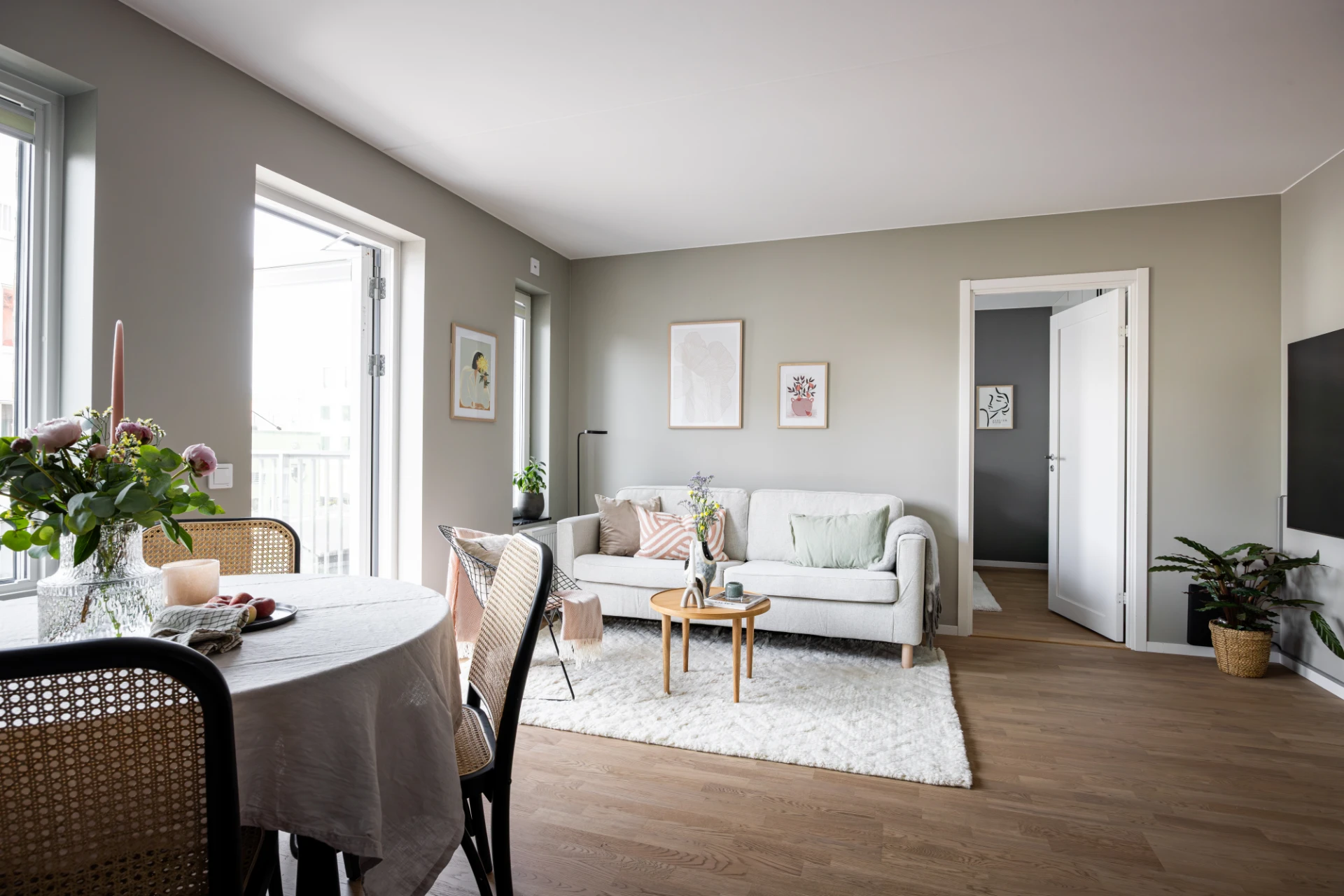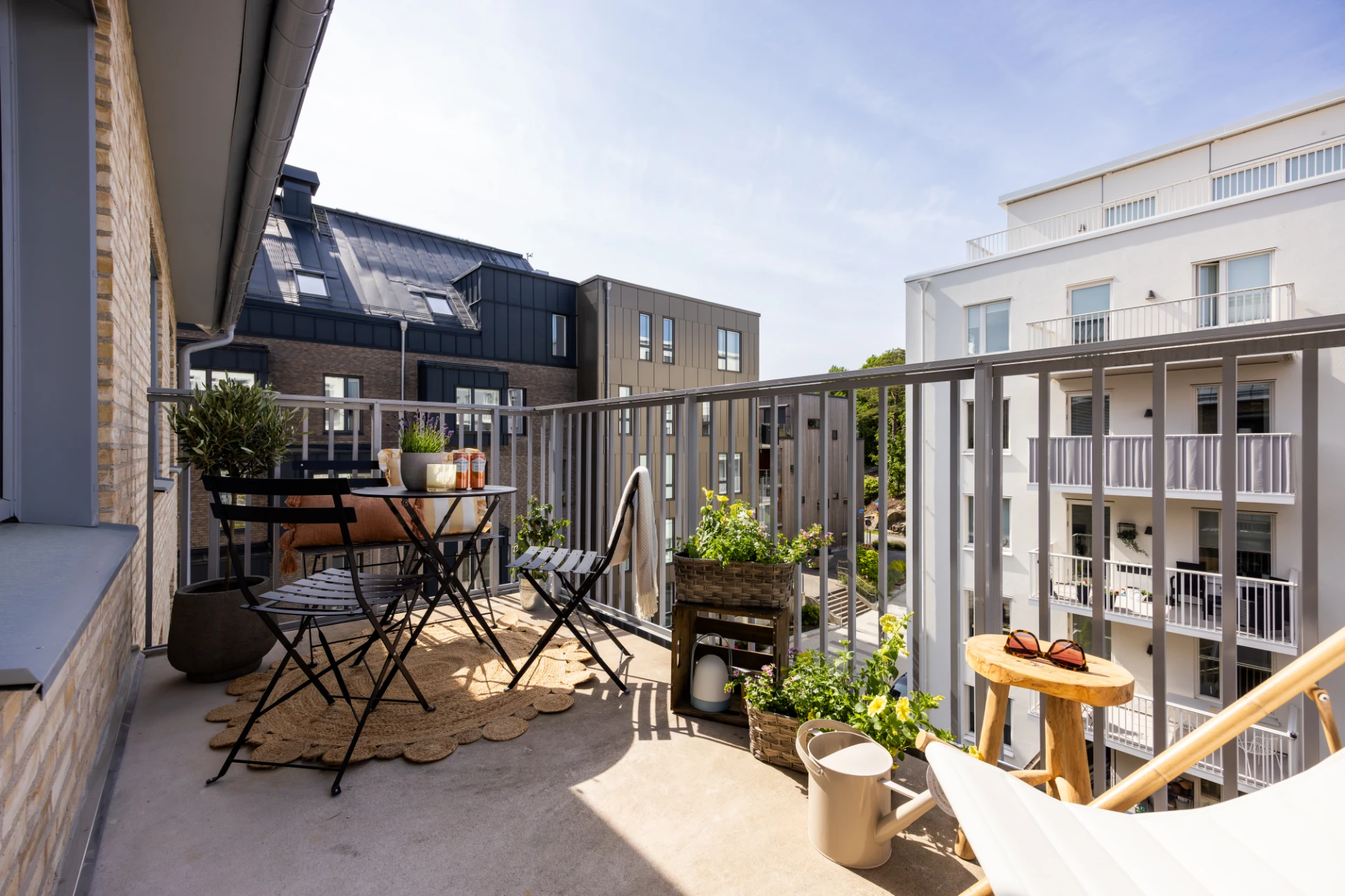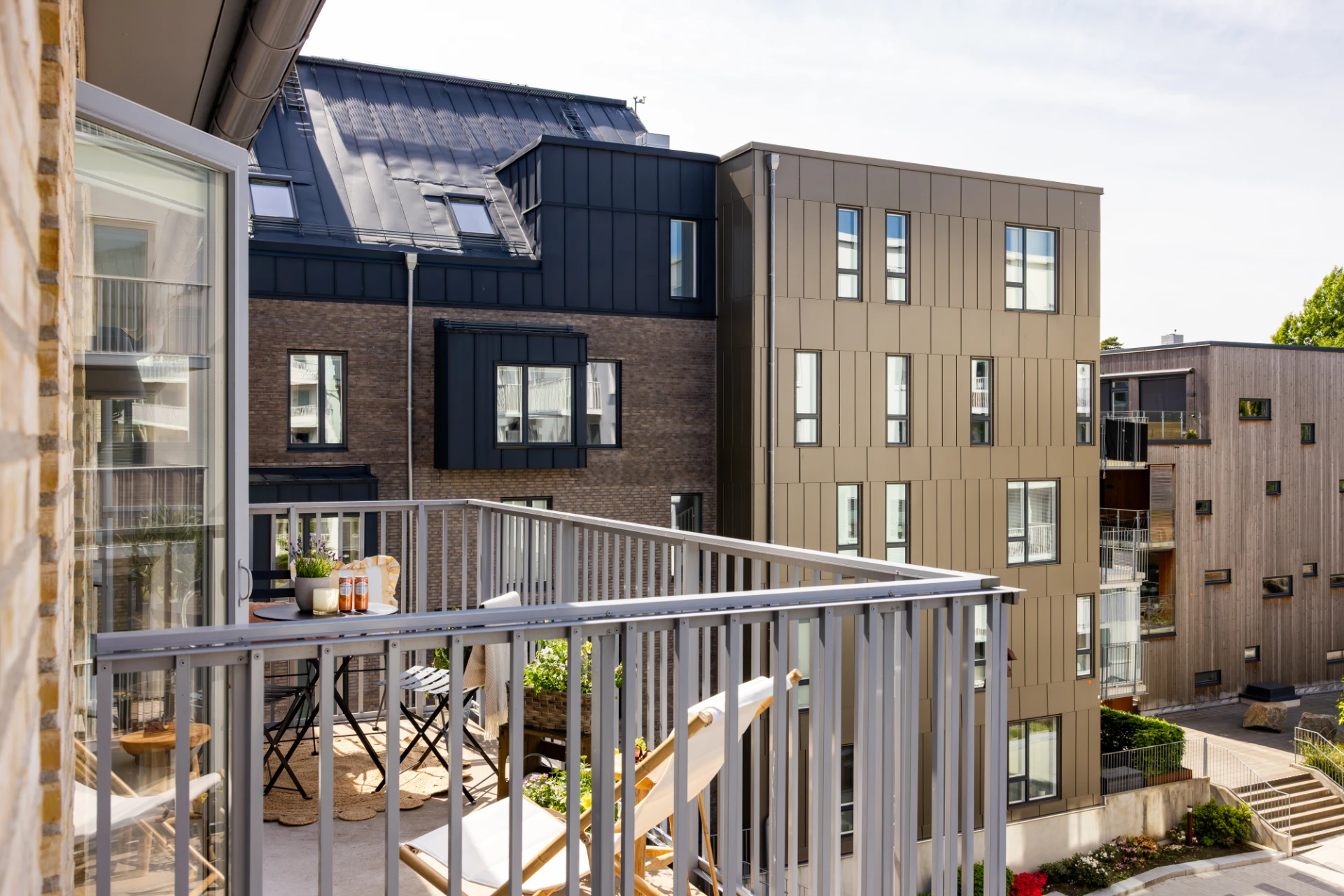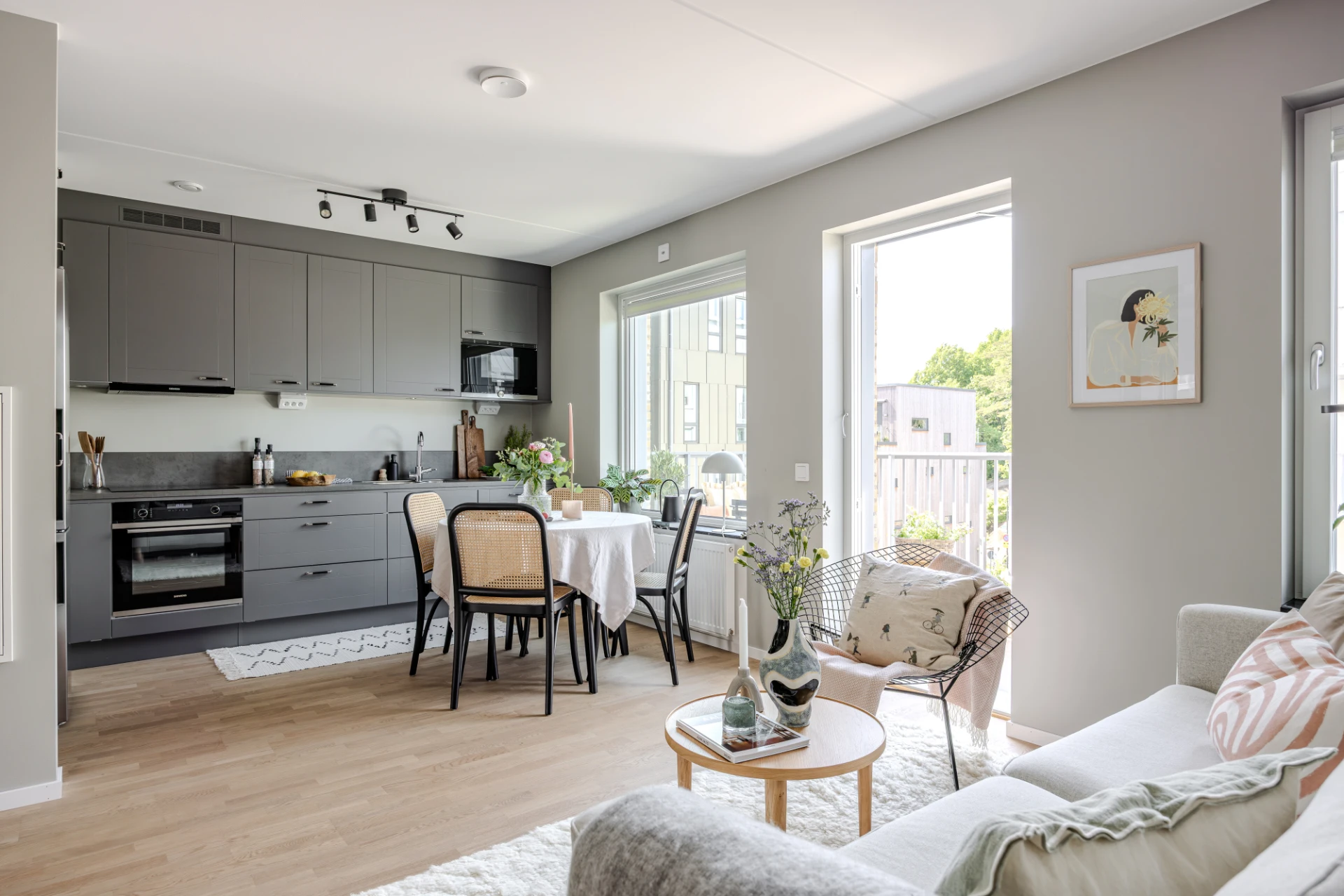 Vardagsrummet som sömlöst harmonierar med köket är perfekt planerad yta. Här finns plats för soffa med tillhörande möblemang. Från vardagsrummet nås bostadens höjdpunkt, den rymliga balkongen med gott om eftermiddagssol. Balkongen förlänger bostaden under säsong och rymmer såväl sittmöblemang som odling för den som så önskar.