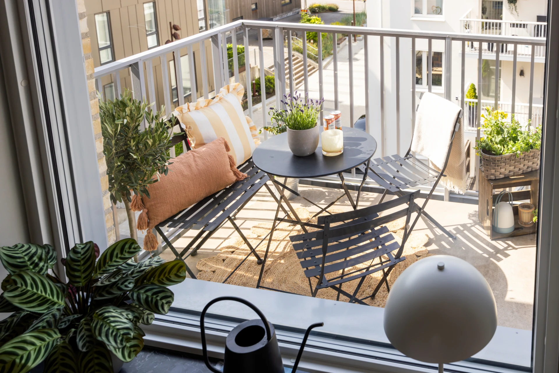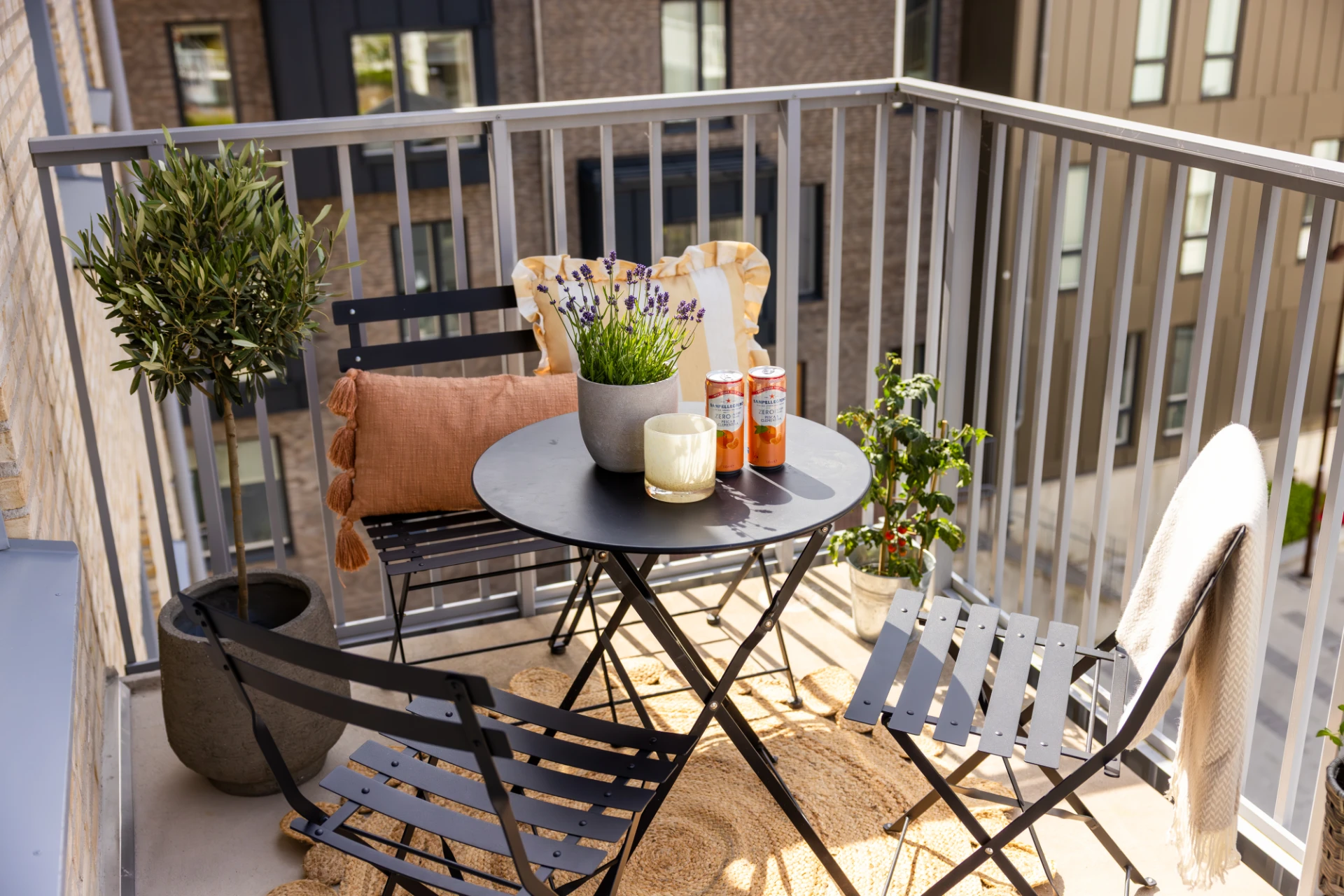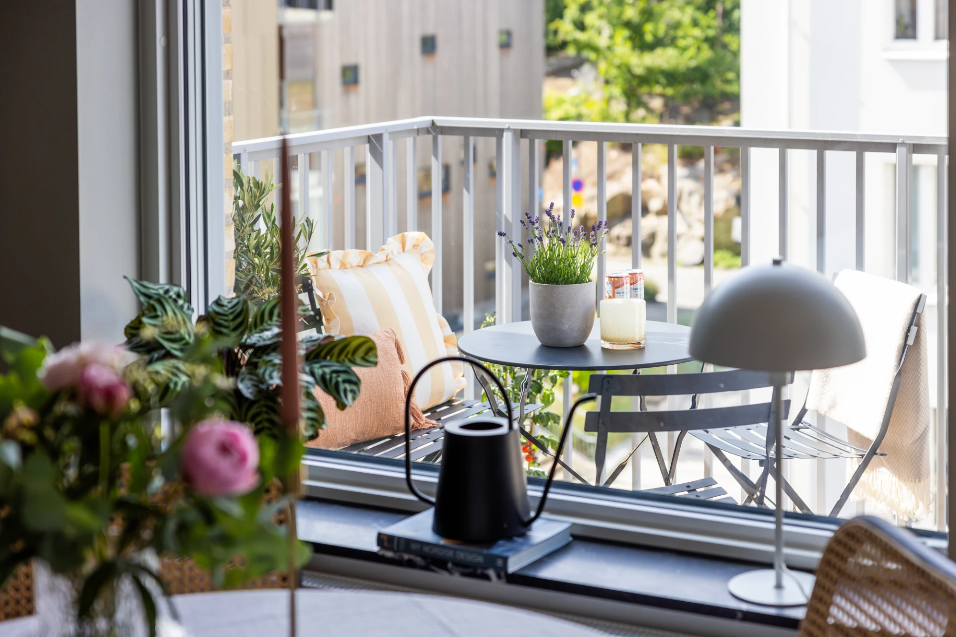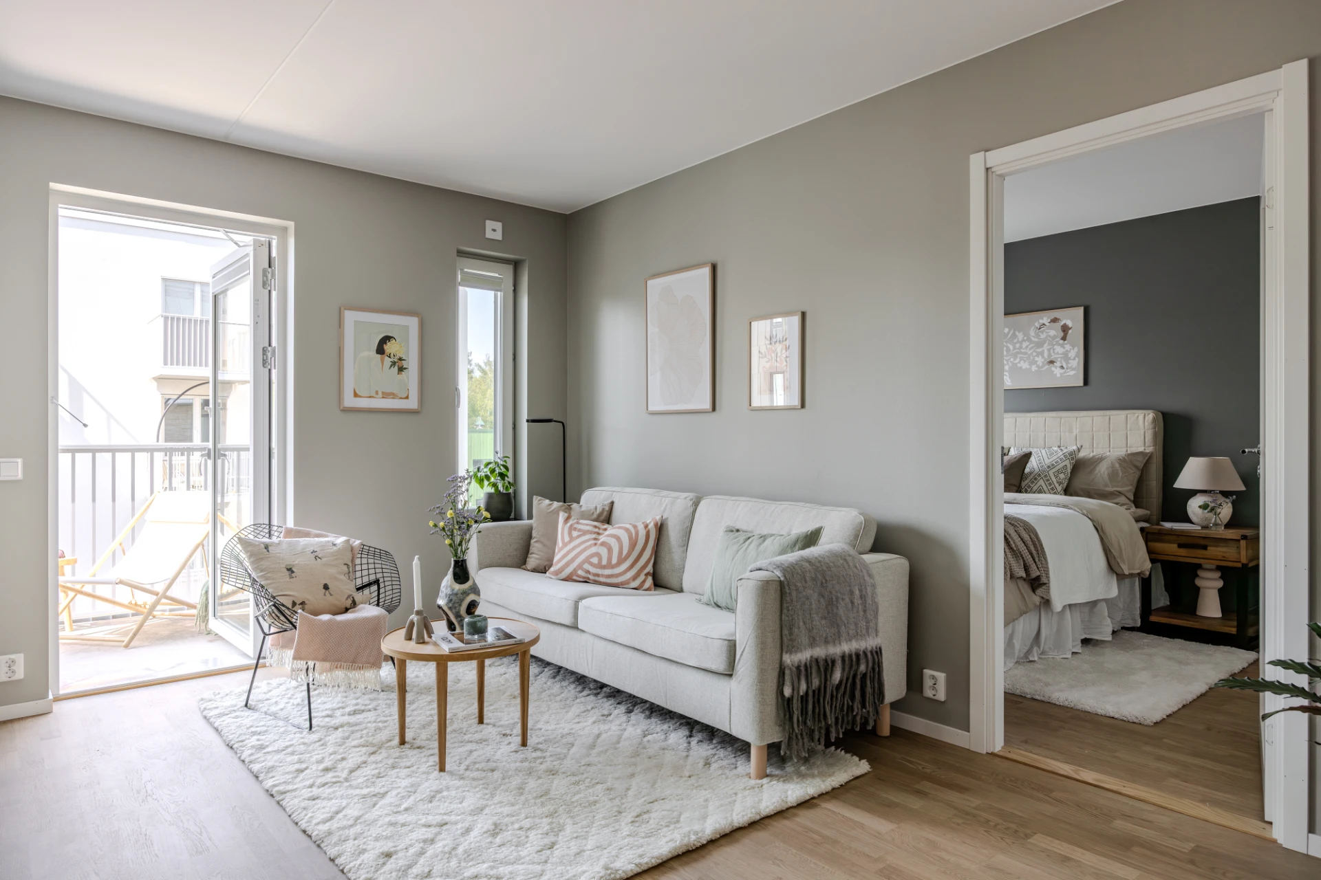 Vardagsrummet som sömlöst harmonierar med köket är perfekt planerad yta. Här finns plats för soffa med tillhörande möblemang. Från vardagsrummet nås bostadens höjdpunkt, den rymliga balkongen med gott om eftermiddagssol. Balkongen förlänger bostaden under säsong och rymmer såväl sittmöblemang som odling för den som så önskar.