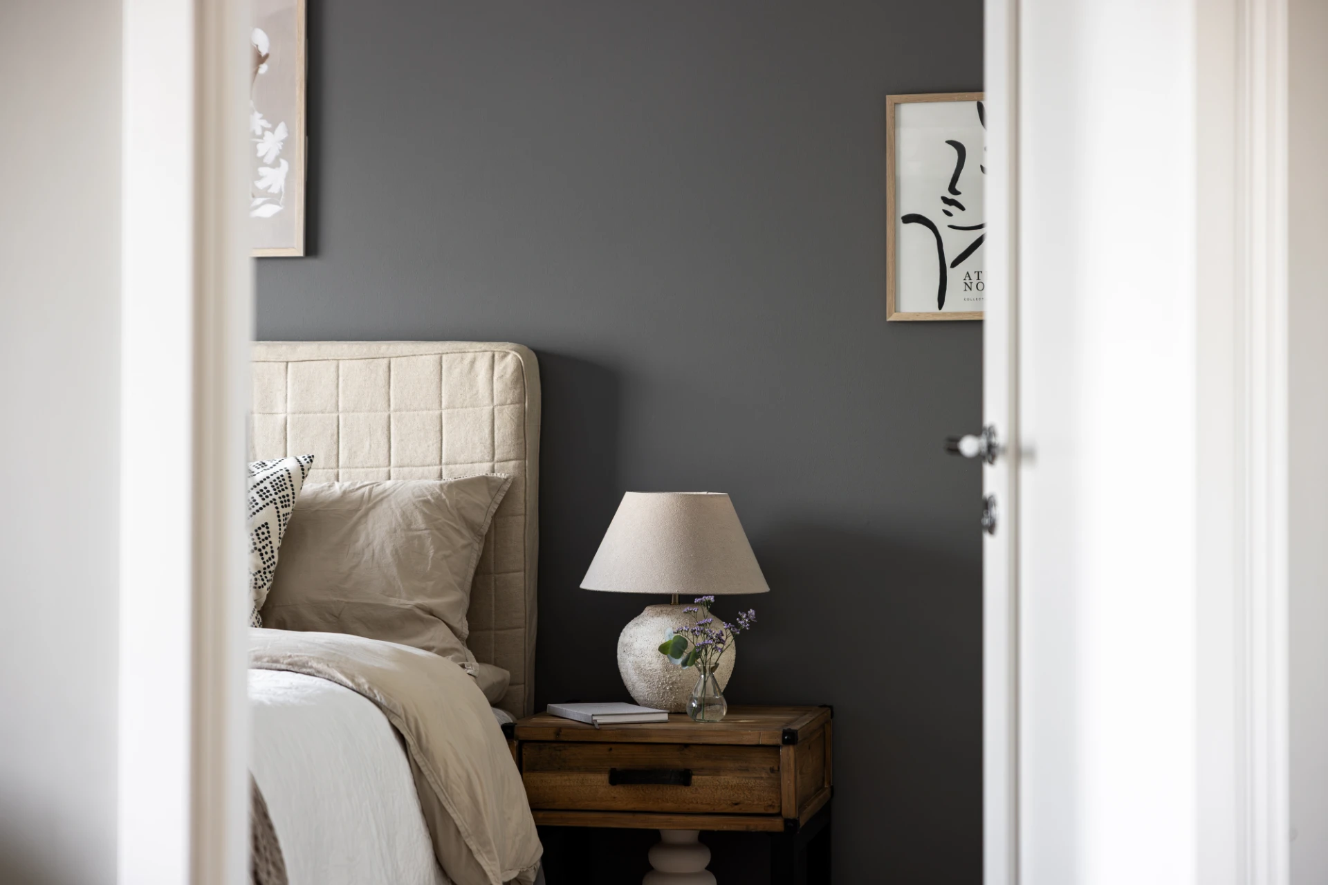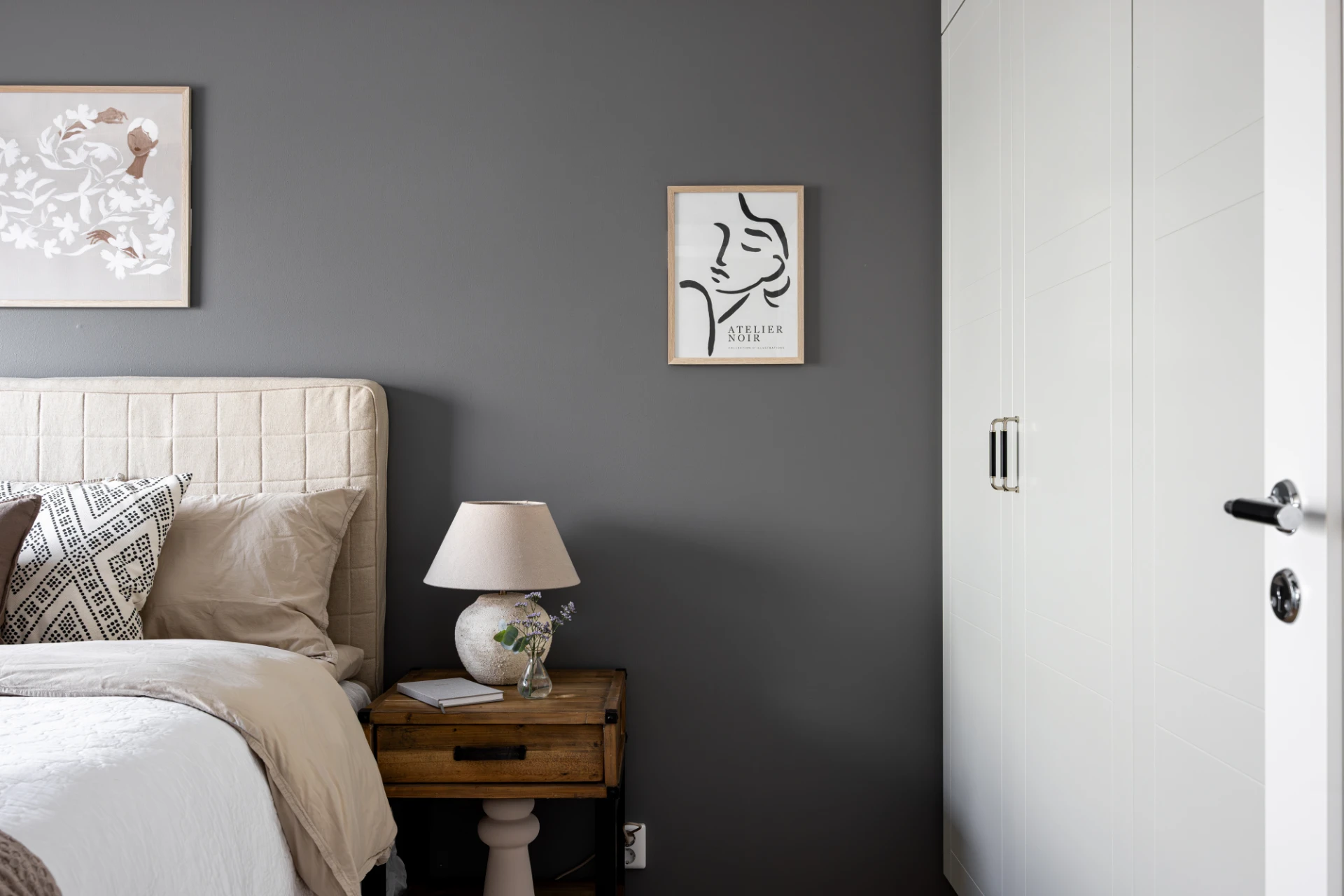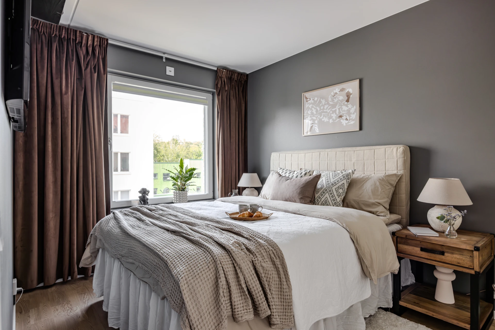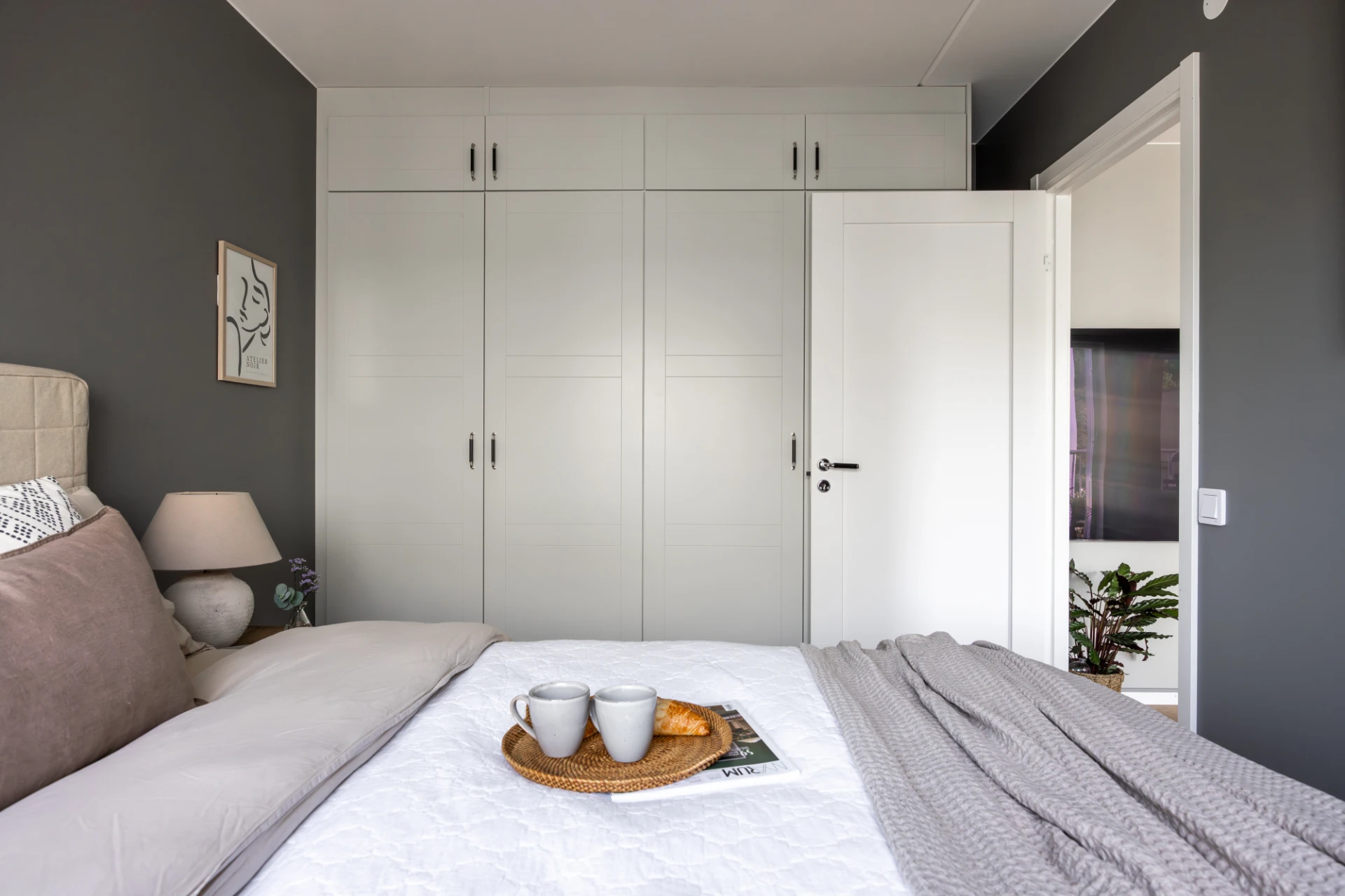 Här finns gott om plats för dubbelsäng med tillhörande möblemang. Ett stort fönster skänker härligt ljus. Förvaring i garderobsvägg sköter förvaringen för hela hushållet.
