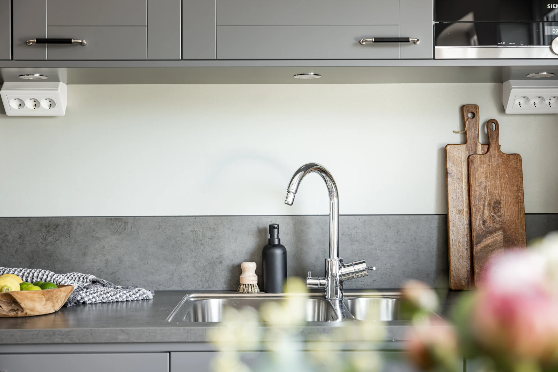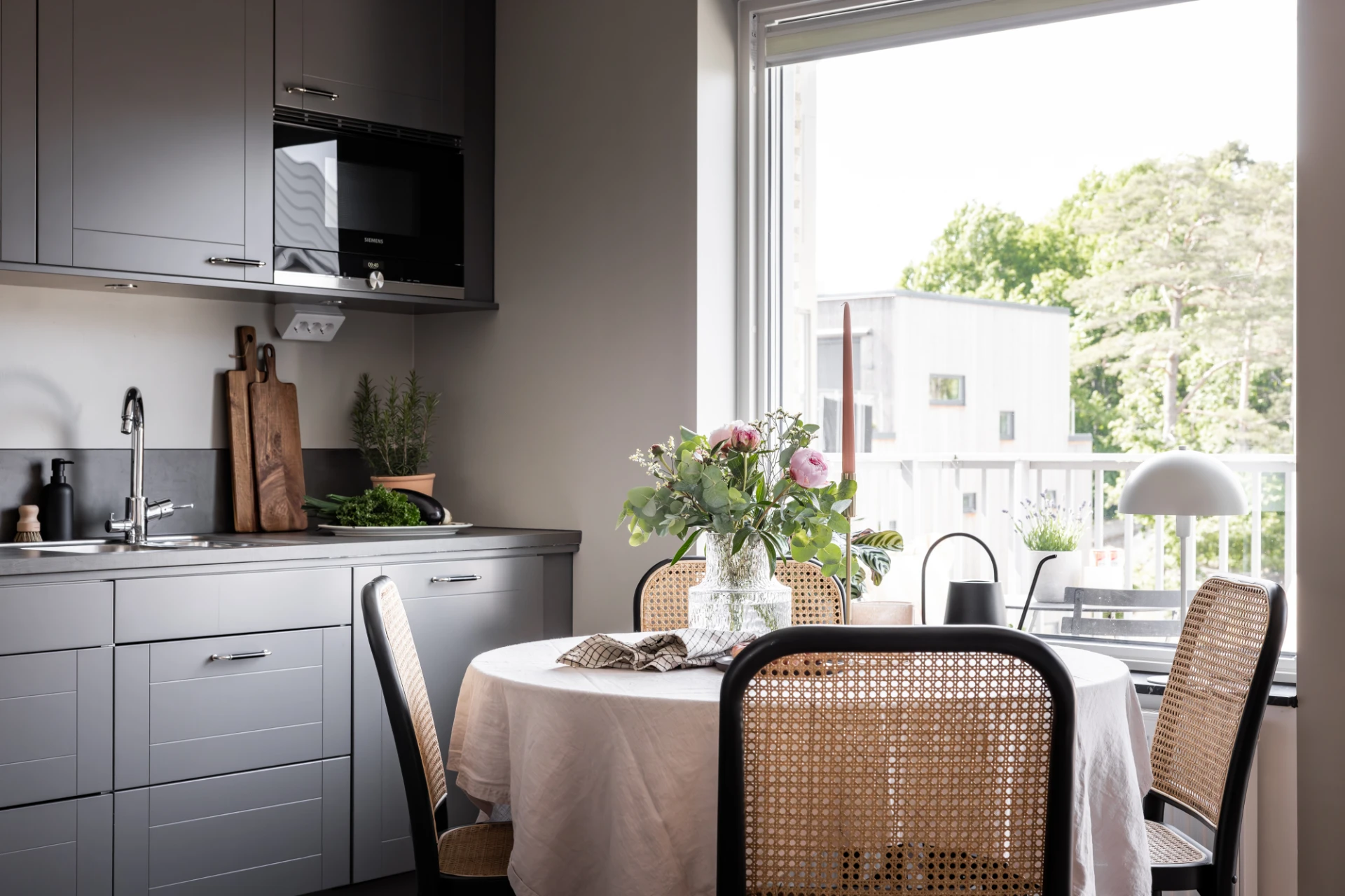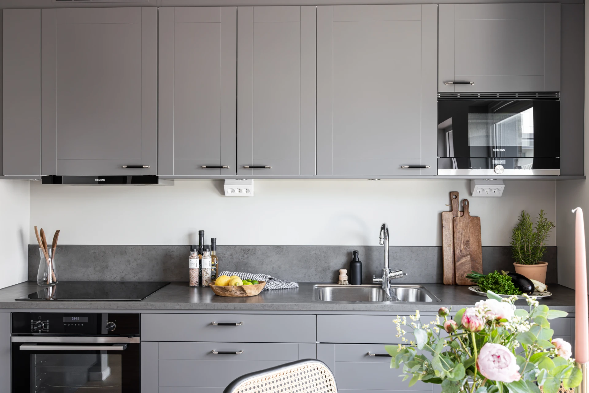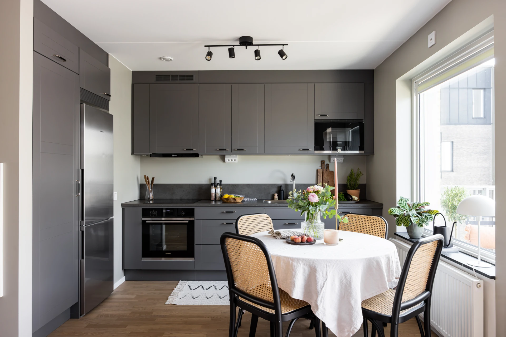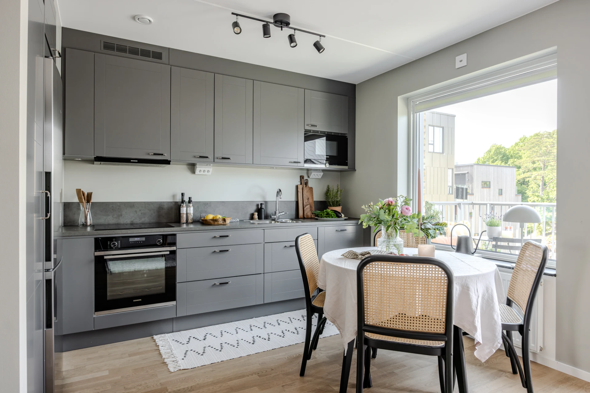 Köket från HTH i stilrent grå ton är rymligt och erbjuder gott om förvaring och bänkyta. Bänkskiva i grått förlängs stilrent med samma material för stänkskydd. Den tekniska utrustningen består av inbyggd micro, ugn, spishäll med tillhörande fläkt, diskmaskin samt kombinerad kyl&frys.