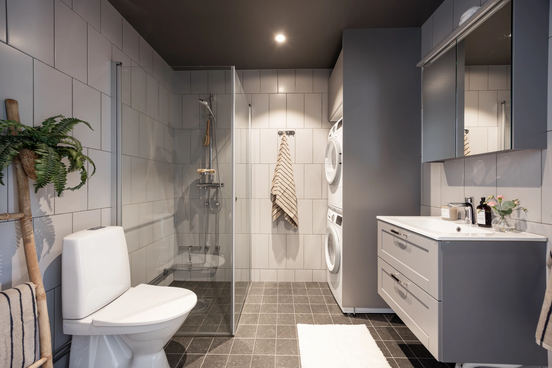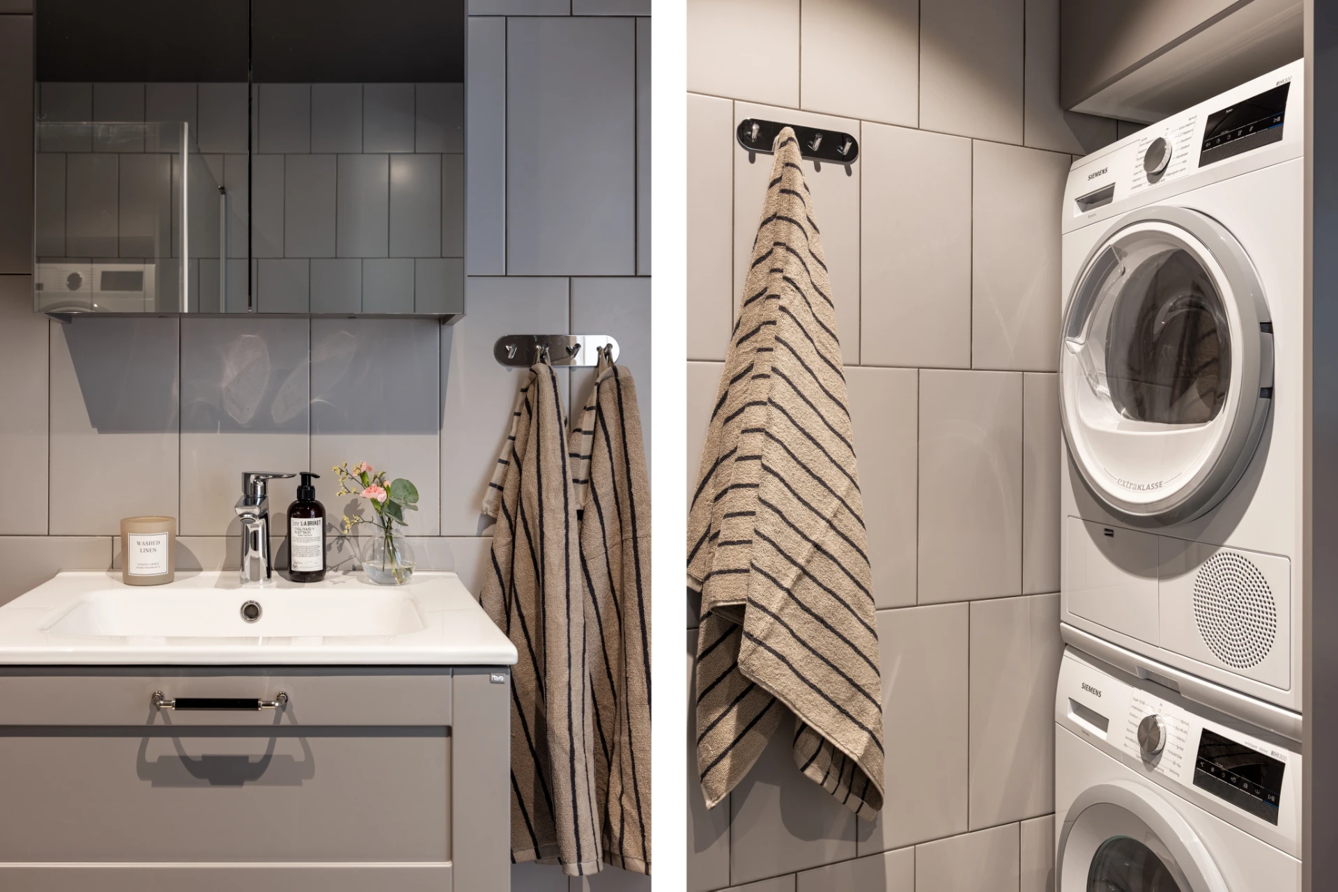 Helkaklat badrum i vitt med grå klinker. Trädetaljer likt köket som binder ihop bostaden på ett smakfullt sätt. Badrummet rymmer WC, duschhörna, handfat med kommod, spegelskåp, tvättmaskin och torktumlare