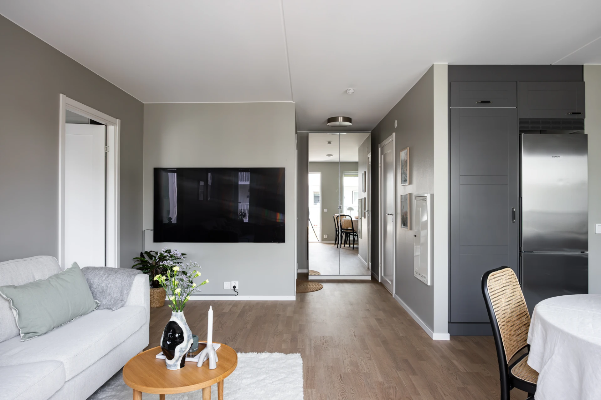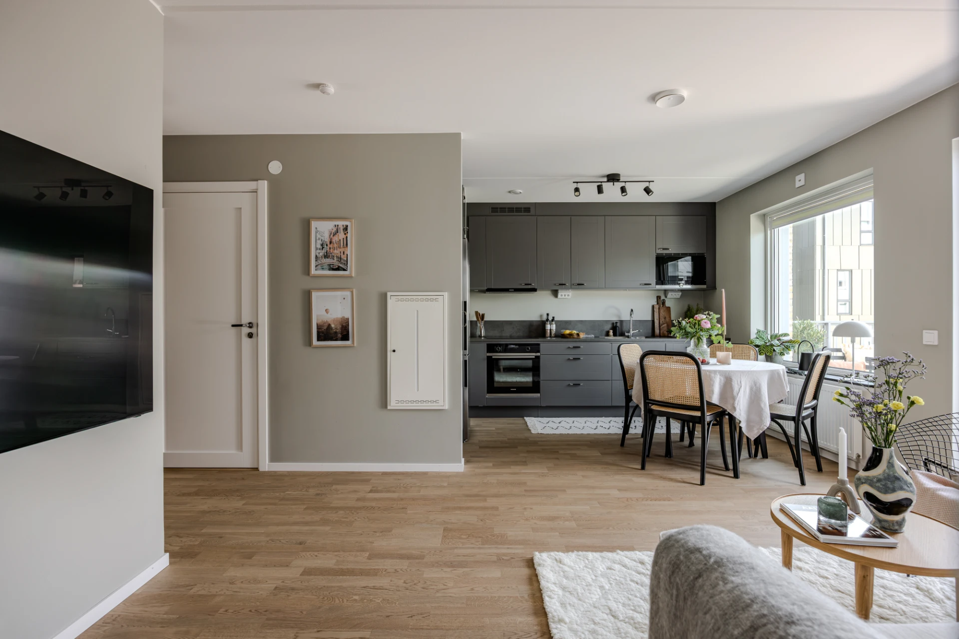 Välkommen till denna stilrena och smart planerade tvårummare om 41 kvm, belägen högst upp i huset på eftertraktade Hovås Allé 11. Här bor du med ett lugnt, högt och insynsfritt läge, där ljuset flödar in genom stora fönsterpartier och skapar en härlig rymd tillsammans med den öppna planlösningen. Den generösa balkongen blir som ett extra rum under årets varmare månader – perfekt för avkopplande frukostar i solen eller middagar i kvällsljuset. Bostaden präglas av moderna materialval, genomgående stilrena ytskikt och en planlösning som maximerar varje kvadratmeter. Det sociala köket ligger i öppen anslutning till vardagsrummet och bjuder in till umgänge med vänner och familj. Här finns gott om plats för både matlagning och samvaro. Sovrummet är rofyllt med bra förvaring i garderober, och även i hallen erbjuds utmärkta förvaringsmöjligheter.
