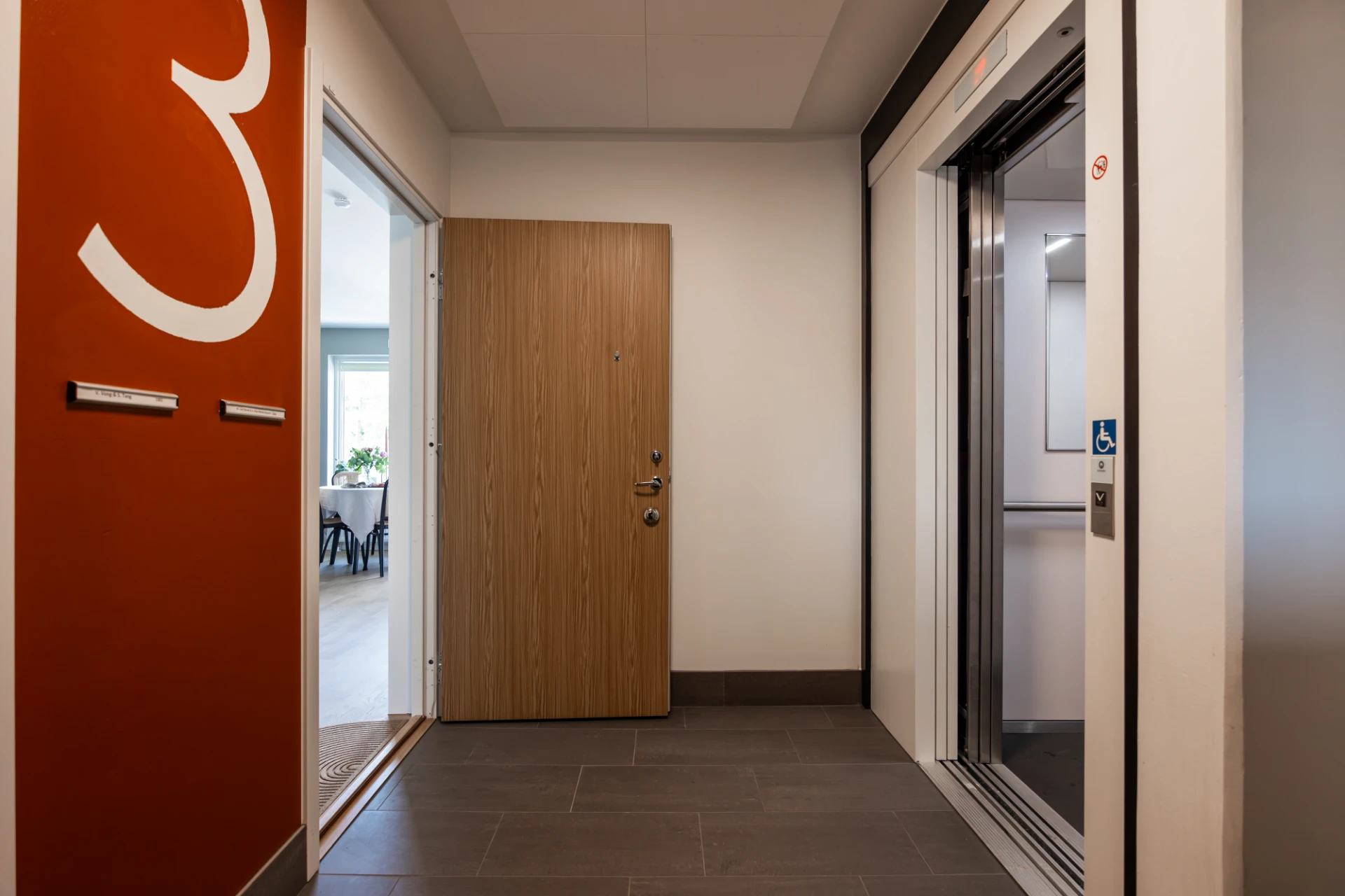Välkommen upp med hissen till högsta våningen och kliv in i en rymlig hall med plats för förvaring i dubbelgarderob med spegeldörrar. Väggarna är genomgående målade i ljus kulör och golvet pryds av vacker parkett vilket är genomgående för hela bostaden.