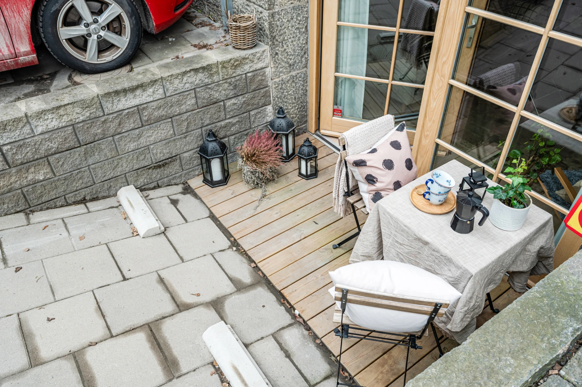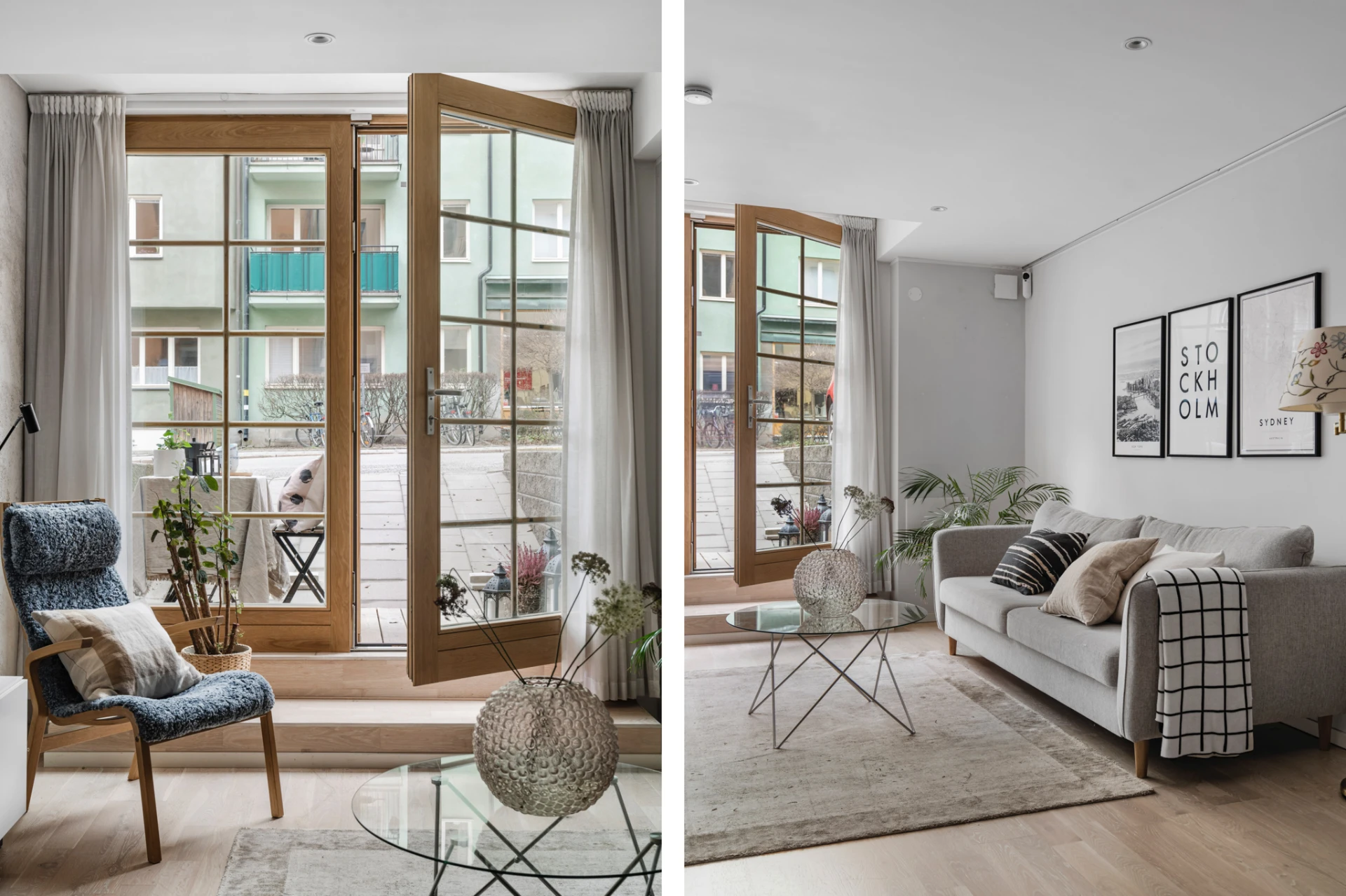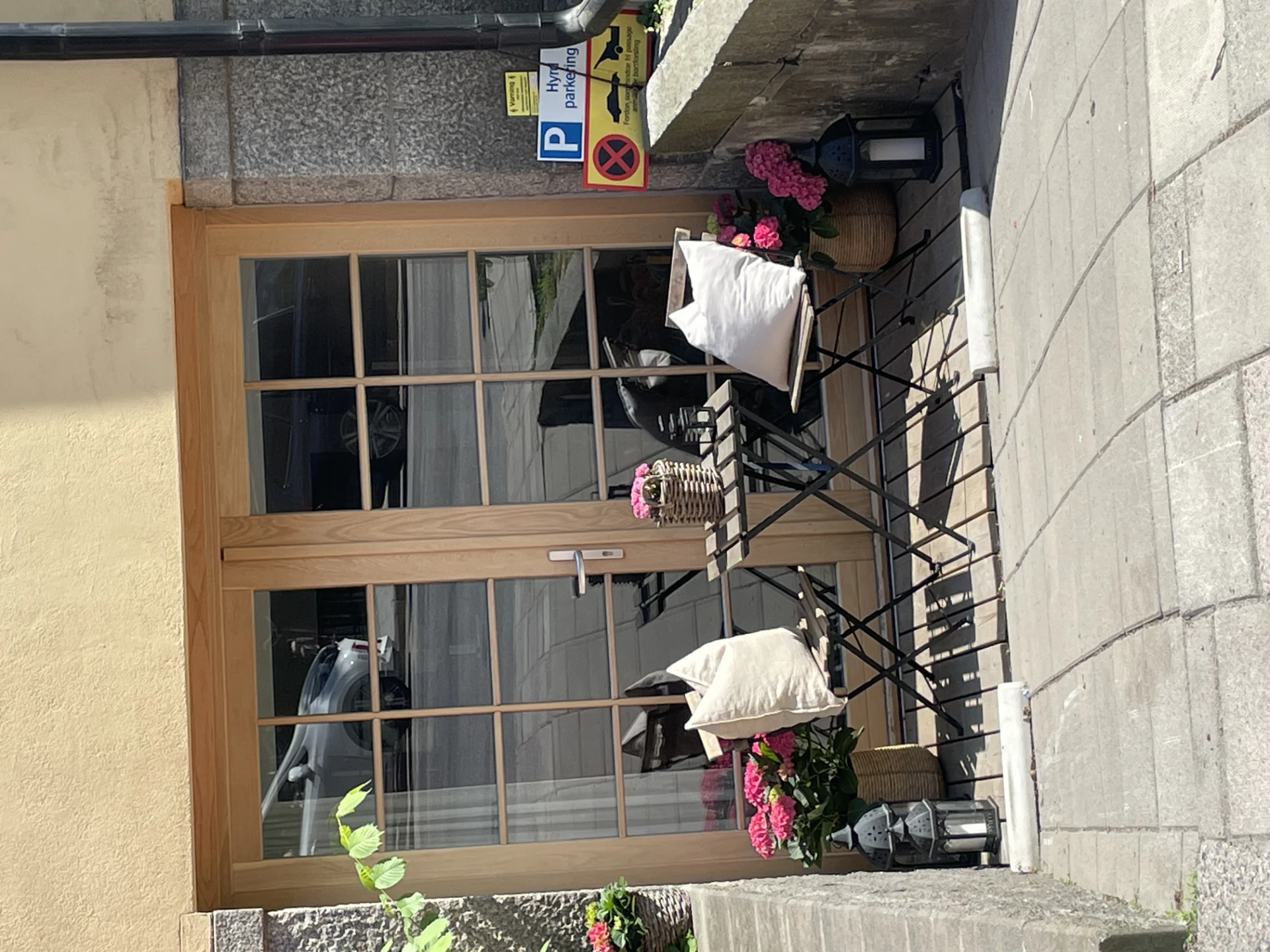 - Stora glasade dubbeldörrar (förstärkt säkerhetsglas) i vardagsrum och fullstora fönster i sovrum