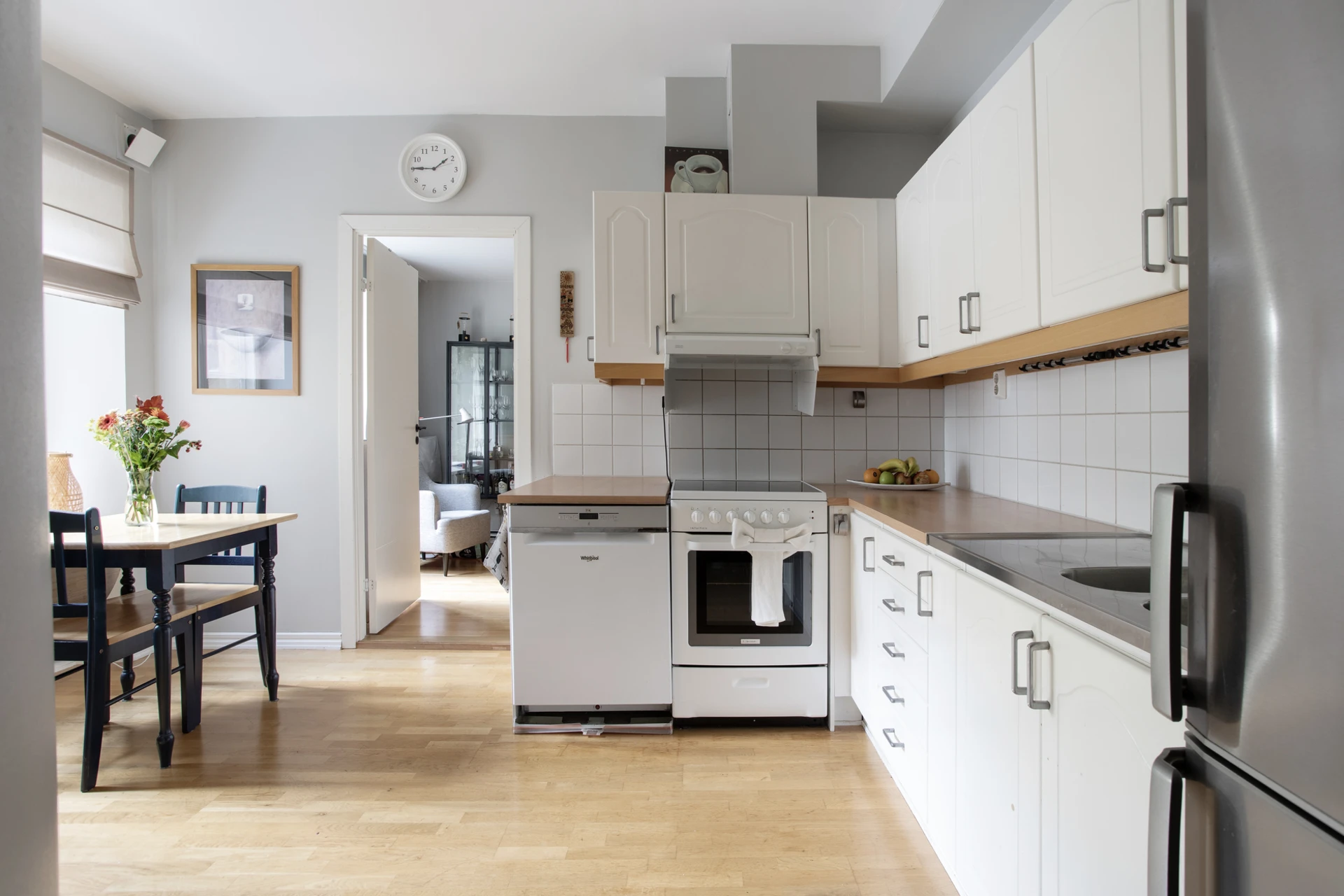 Parkettgolv och väggar målade i ljusgrå kulör. Köksinredningen går i vitt med kakel över en bänkskiva i träfanér. Den maskinella utrustningen består av en kombinerad kyl och frys, diskmaskin, spis med ugn samt fläkt. Köket erbjuder plats för ett matbord för upp till sex personer.