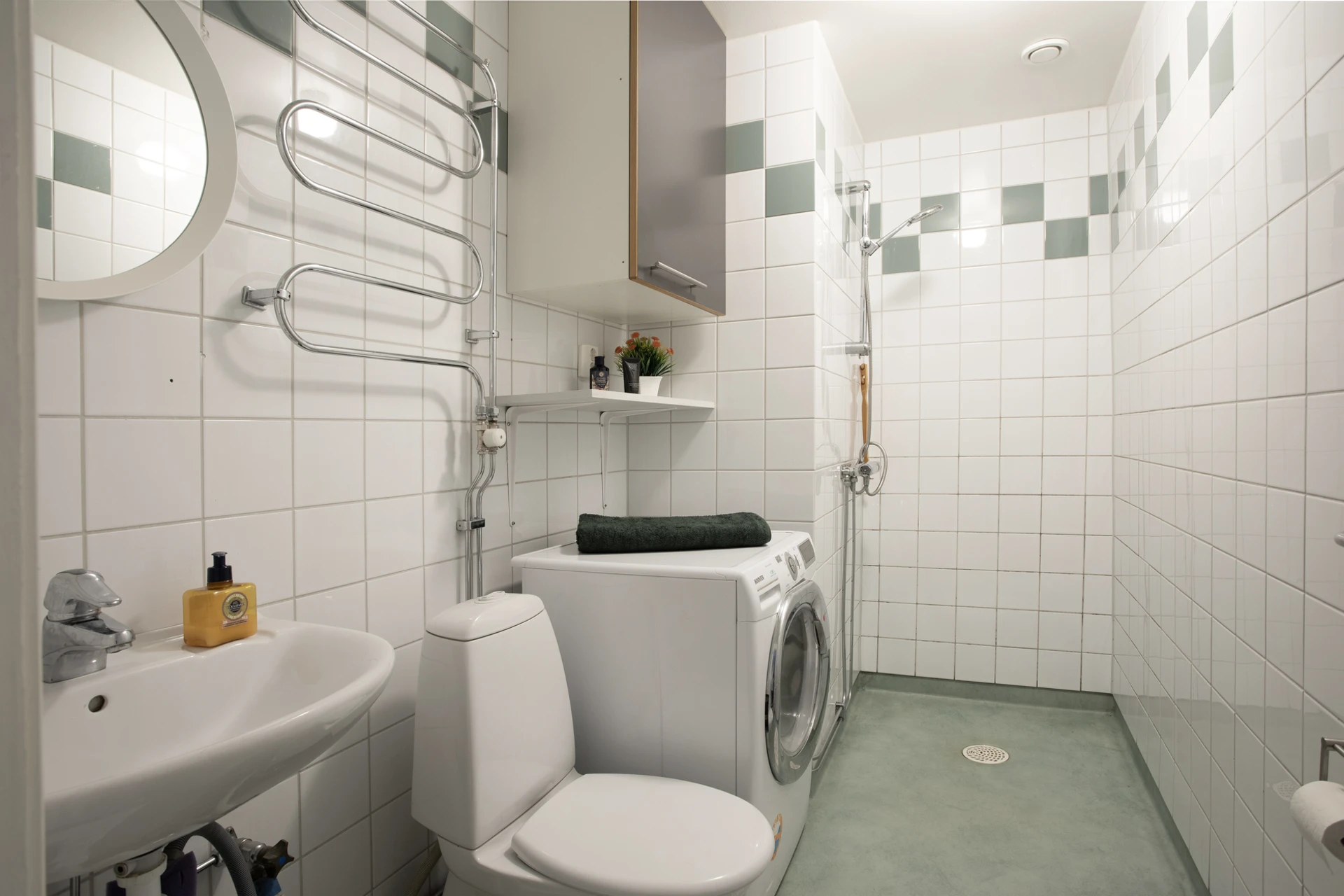 Vinylgolv i grön färg, samt helkaklade vita väggar med en grön detalj. Här finns wc-stol, dusch, handfat, spegel, handdukstork, förvaringsskåp samt tvättmaskin.