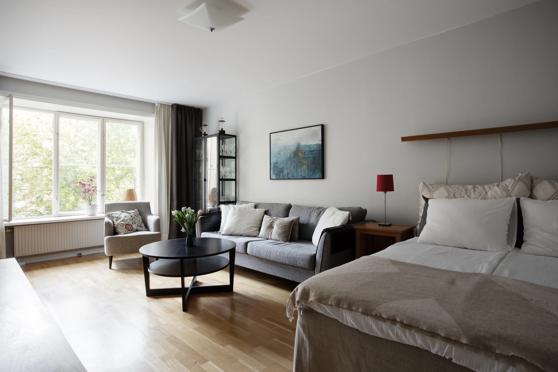 Parkettgolv och väggar målade i ljusgrå kulör. Rummet erbjuder plats för en soffgrupp med tillhörande möblemang samt en dubbelsäng. Härliga ljusinsläpp från stora fönsterpartier.