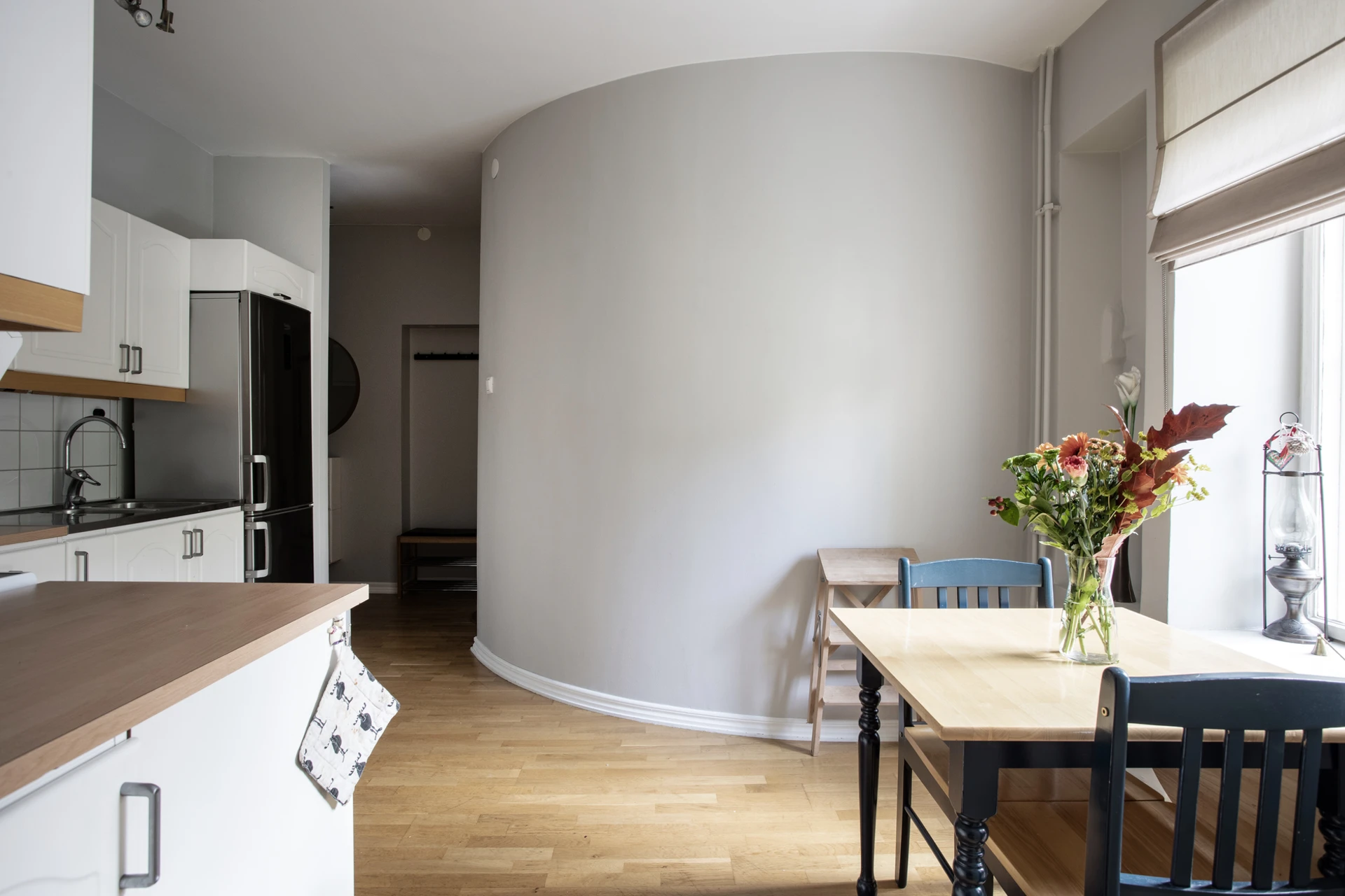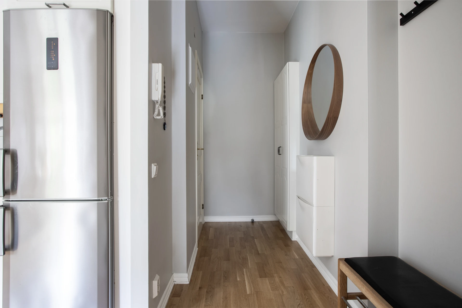 Parkettgolv och väggar målade i ljusgrå kulör. Plats för avhängning samt förvaring i en inbyggd garderob.