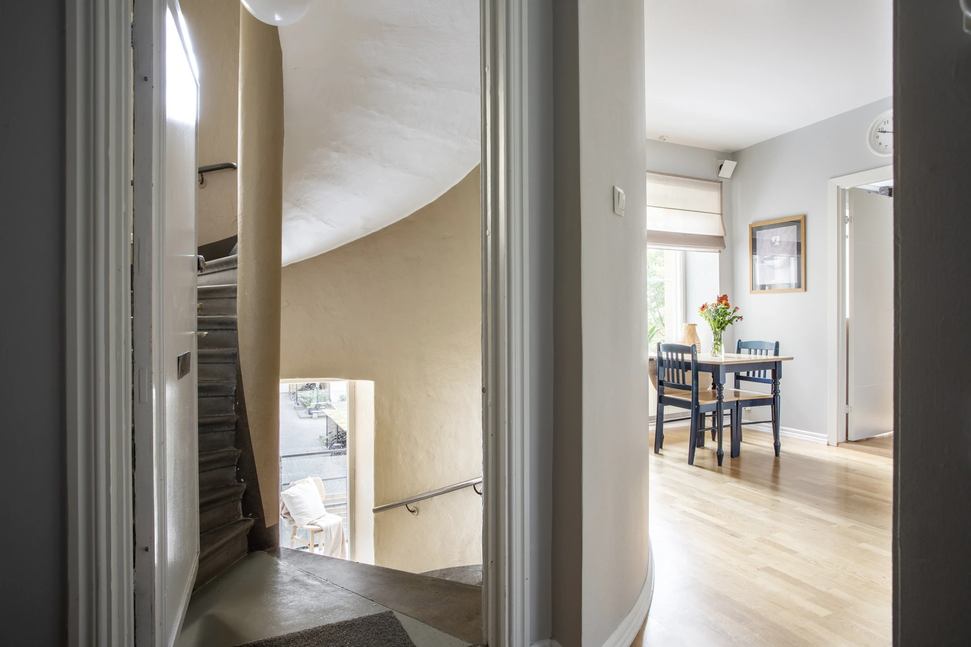 Balkong i västerläge når man en halv trappa ner via trappuppgången.