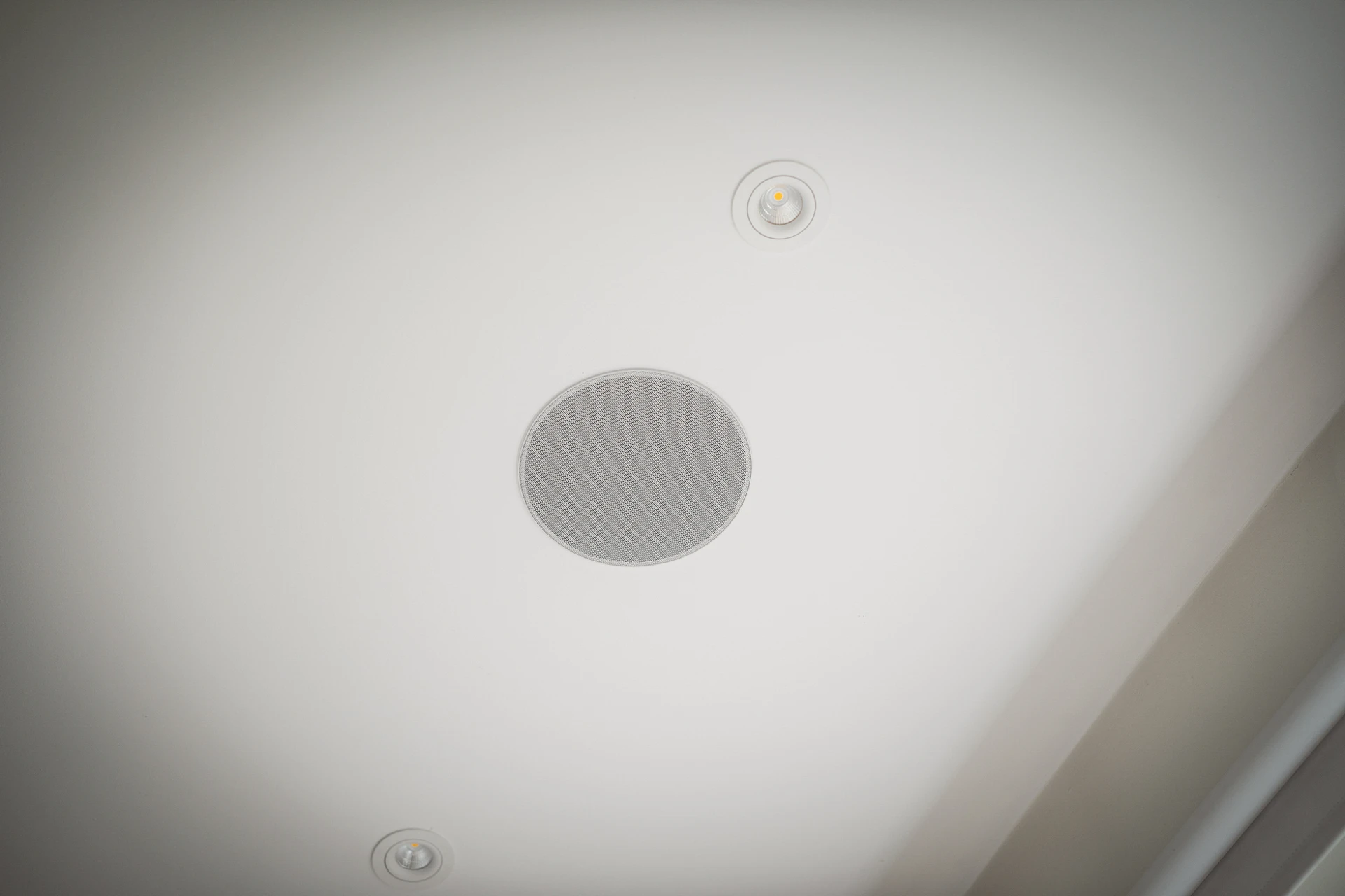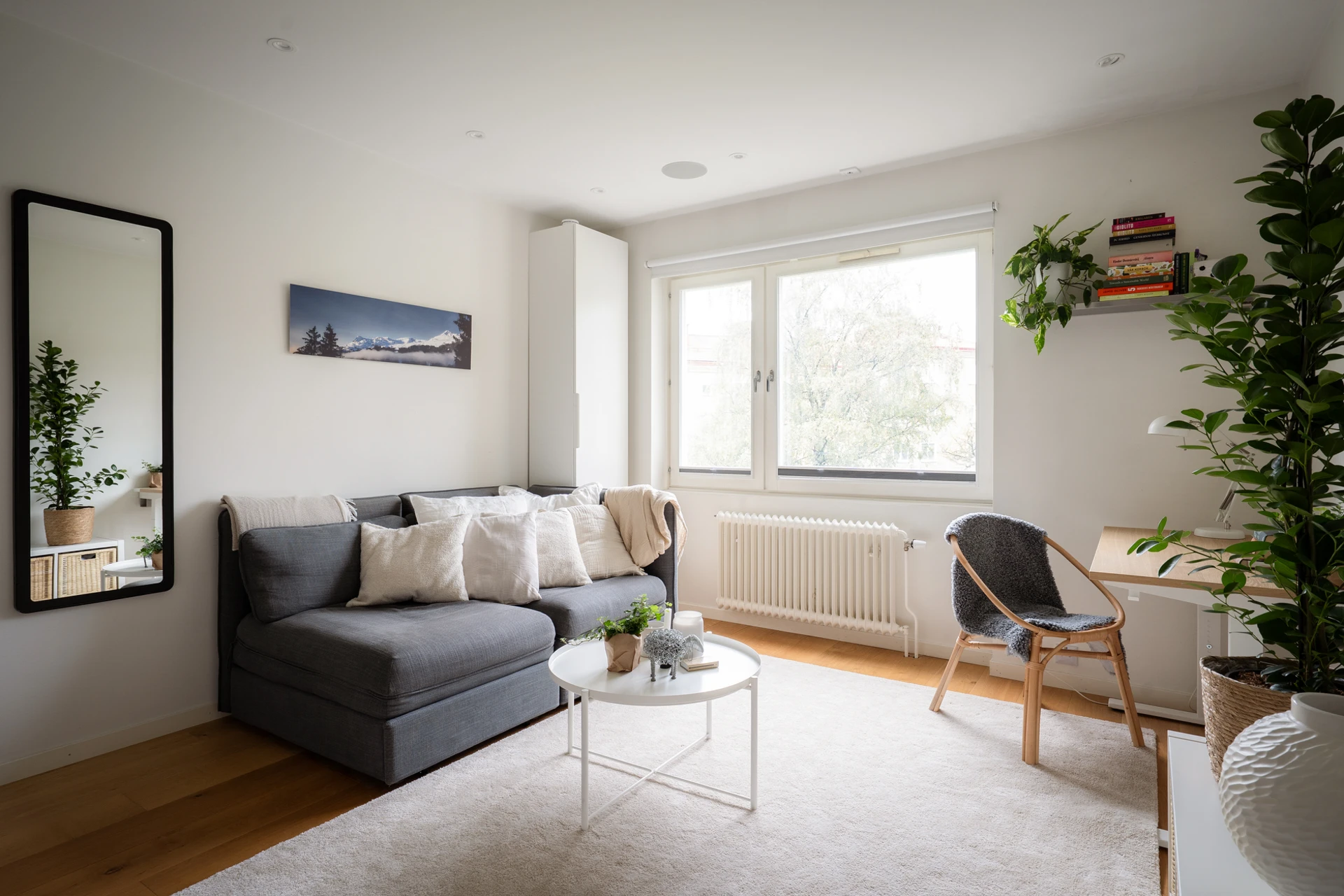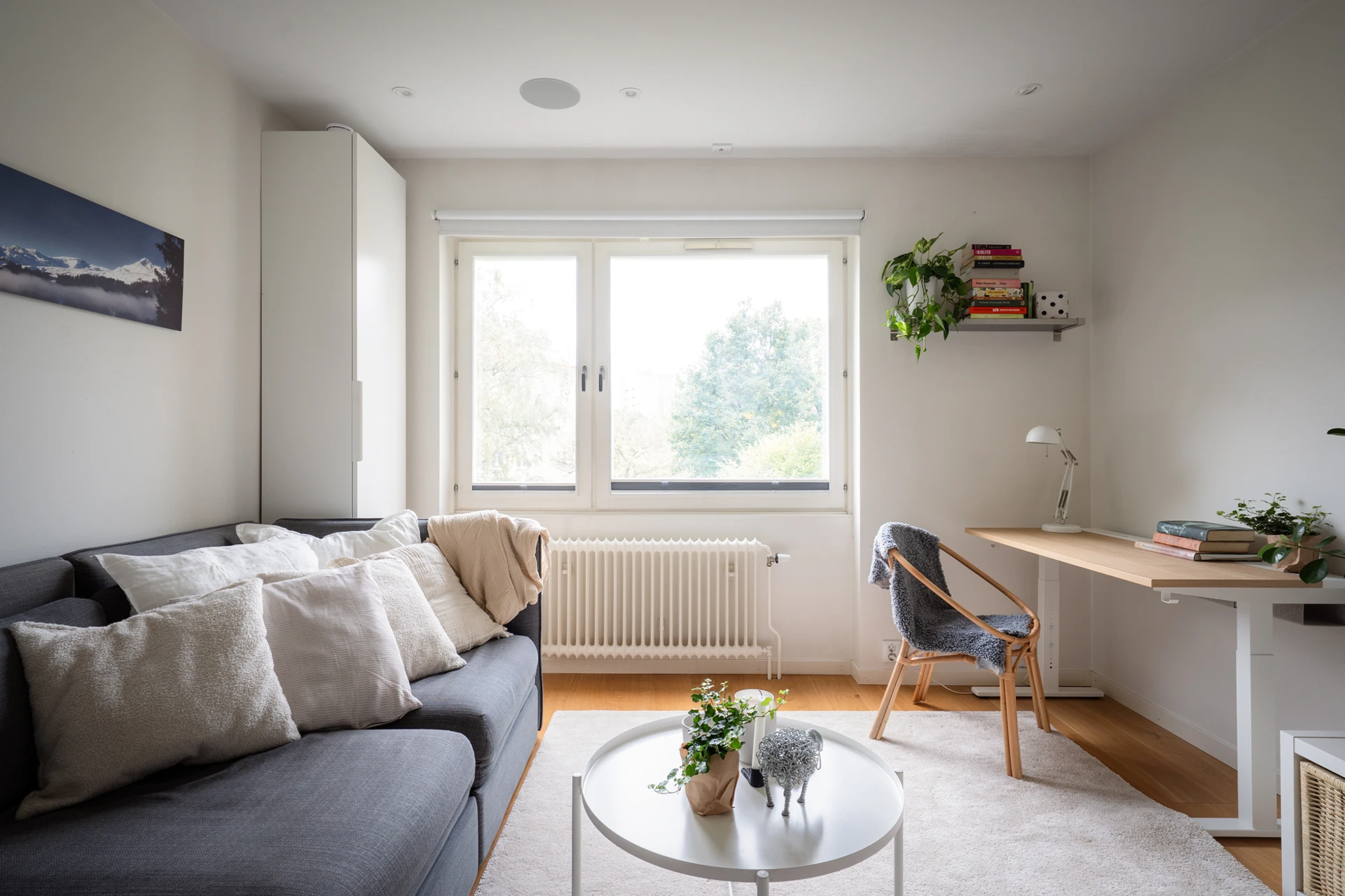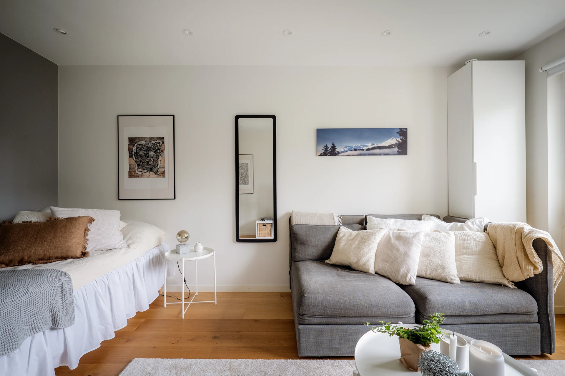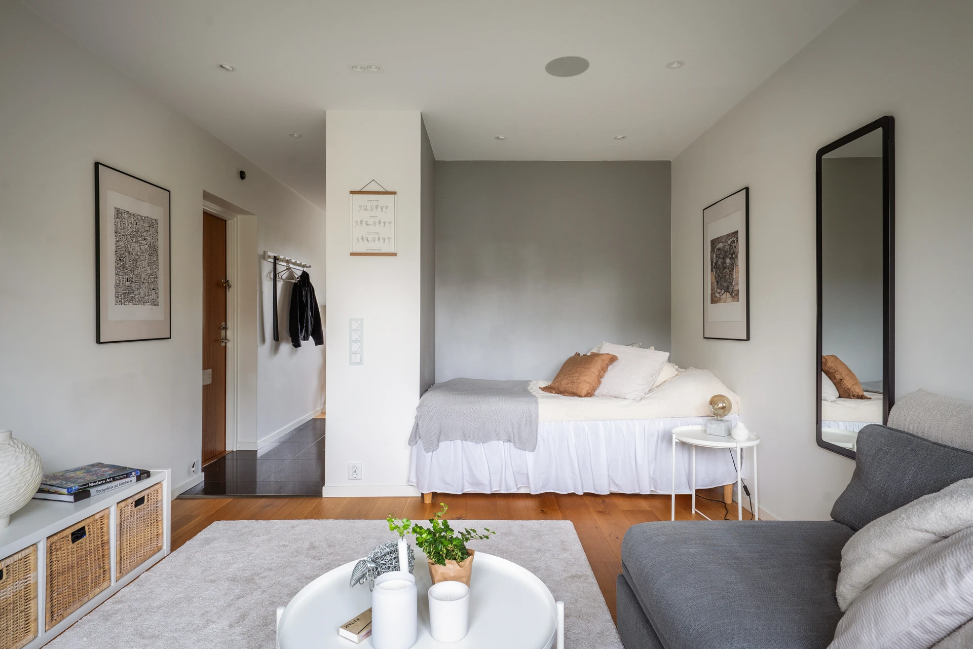 Trägolv och vita väggar med en fondvägg i grått vid sovalkoven. Här finns plats för soffgrupp med tillhörande möblemang samt en säng i alkoven. I taket sitter infällda spotlights med dimmerfunktion och inbyggda högtalare.