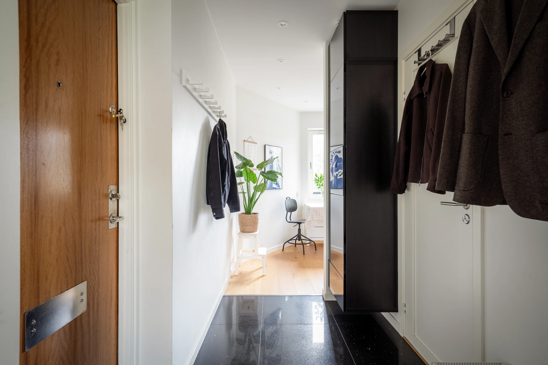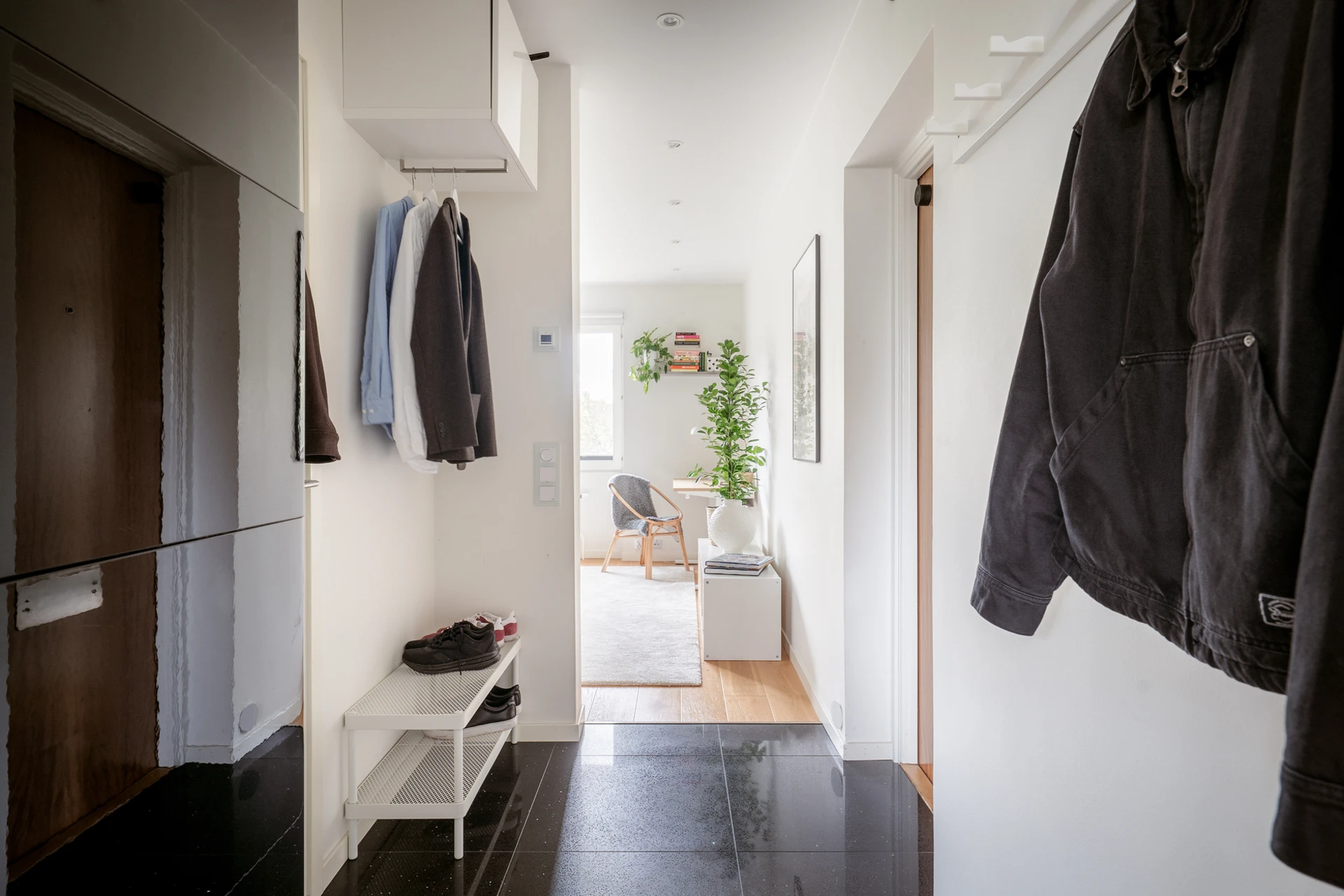 Klinkergolv och vita väggar. Plats för kappavhängning vid hatthylla innanför entrén och förvaring i en vägghängd förvaringsmöbel. I taket sitter infällda spotlights med dimmerfunktion.