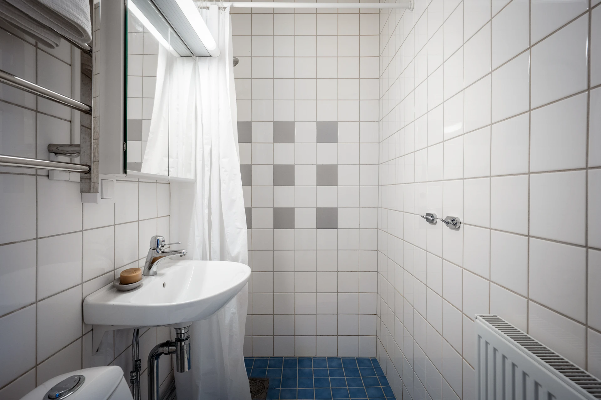 Klinkergolv och helkaklade väggar. Badrumsinredningen består av WC-stol, handfat, spegelskåp med belysning, handdukstork och dusch med draperi.
