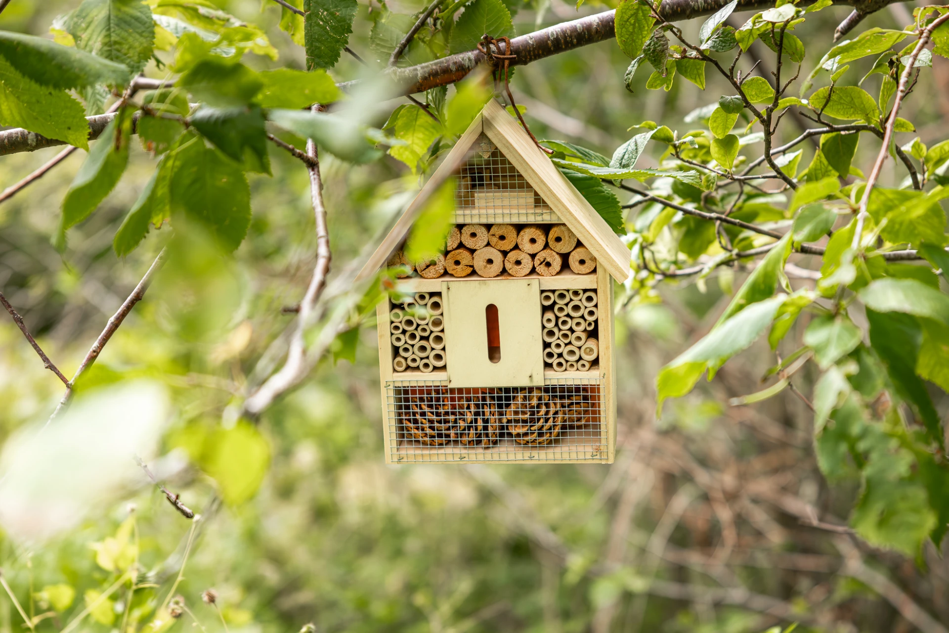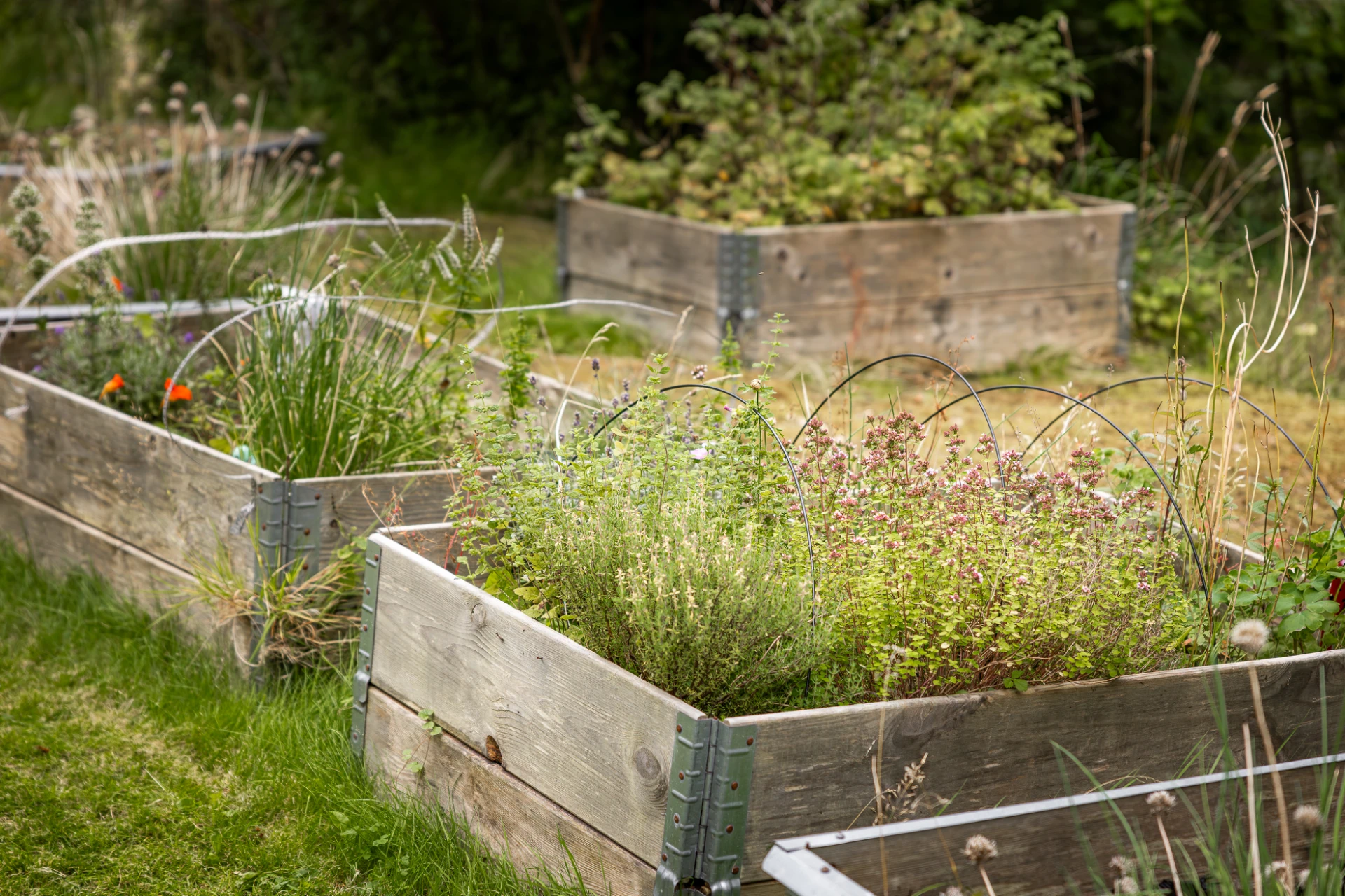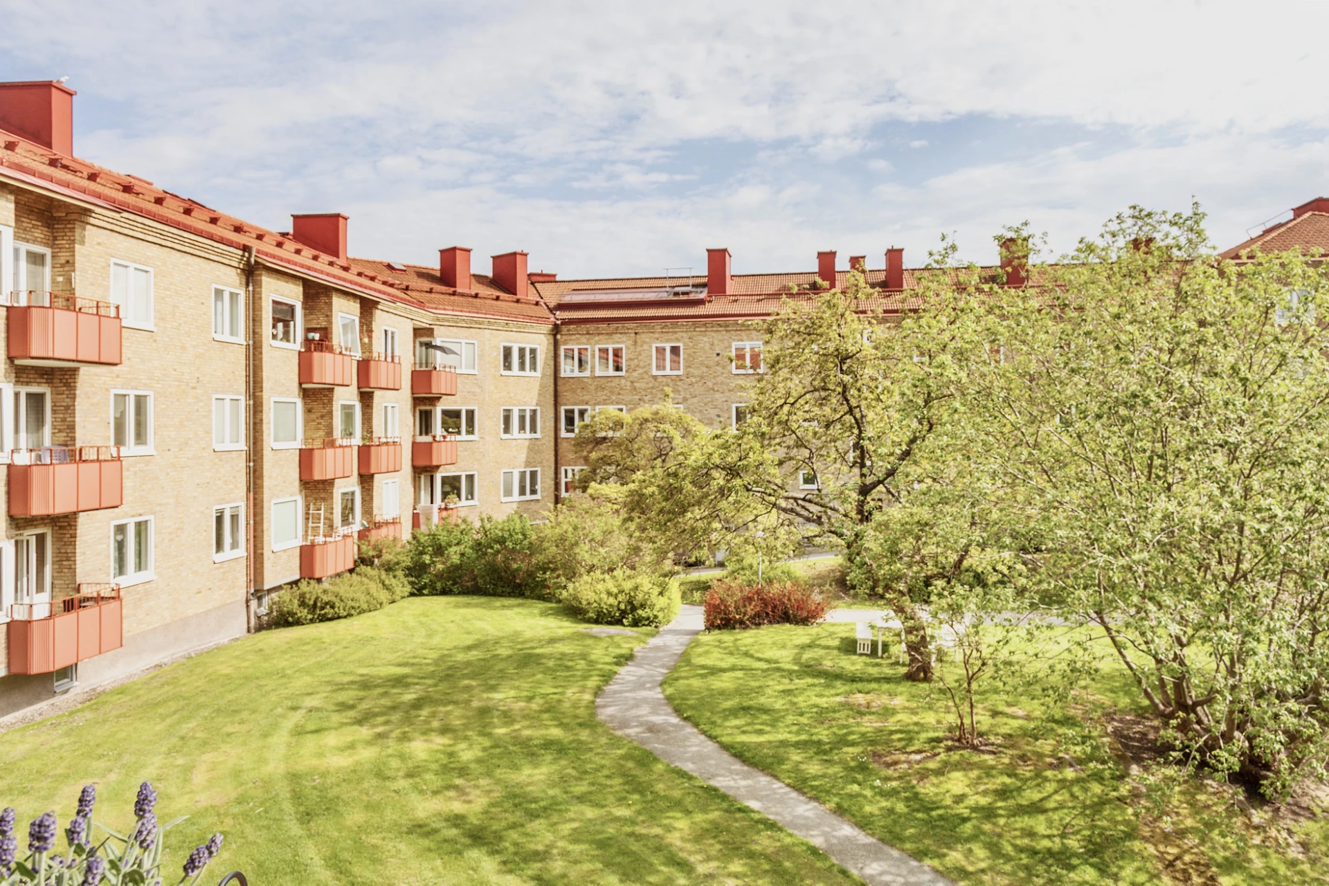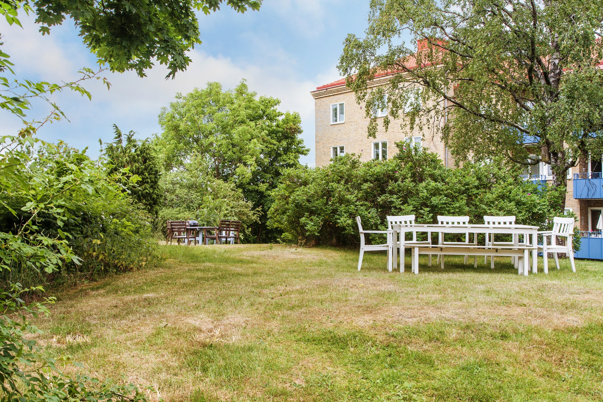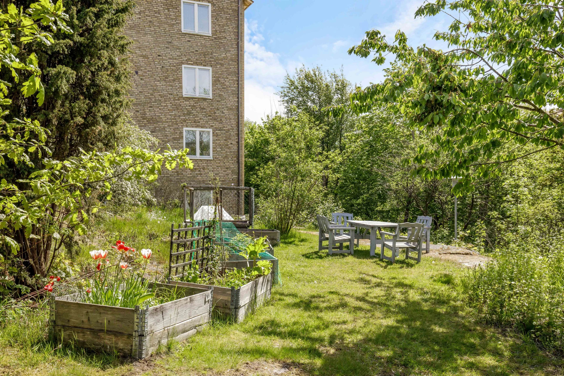 Lummiga innergårdar med vackra omgivande träd och stor gräsyta med utemöbler, grillplatser samt odlingslådor.