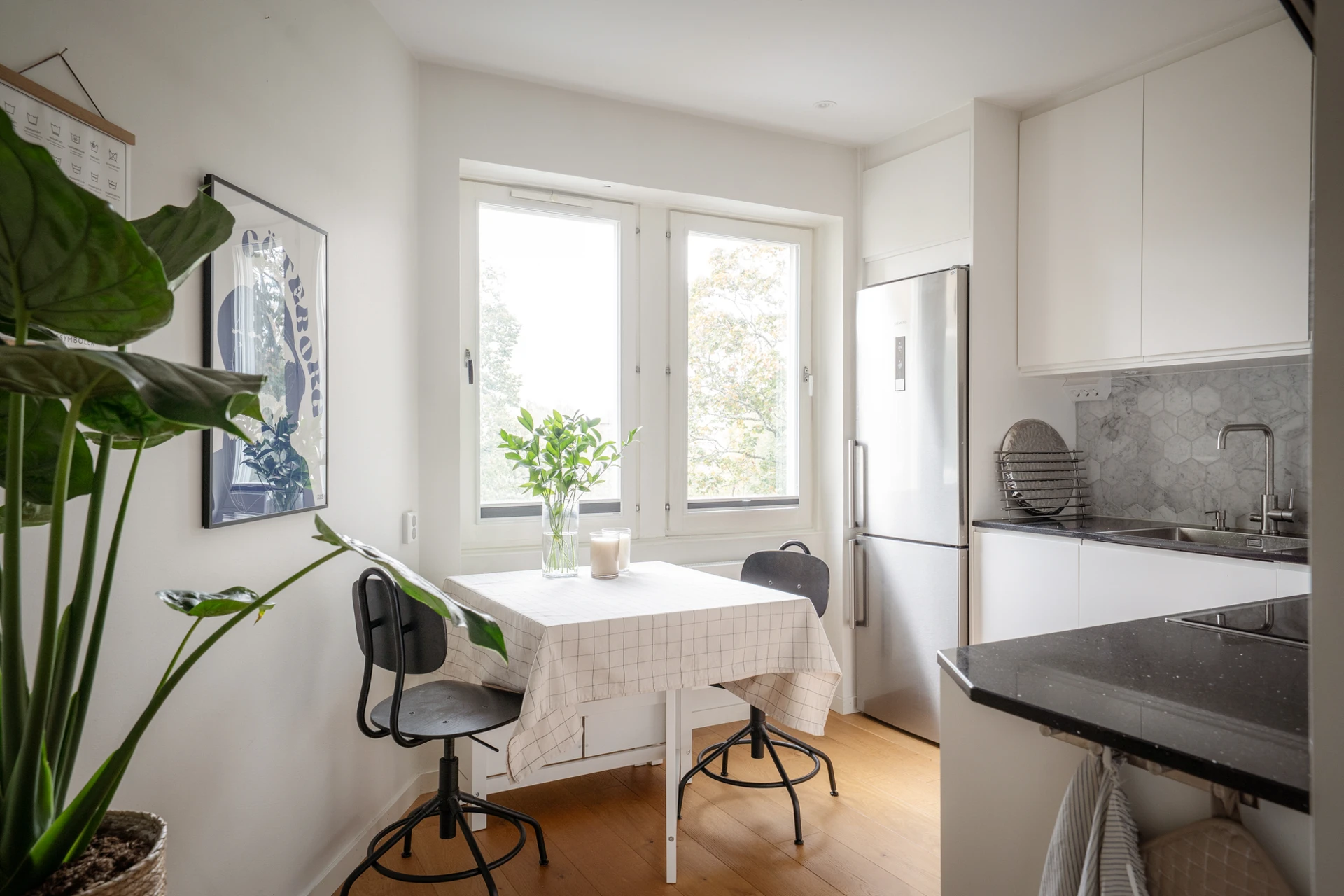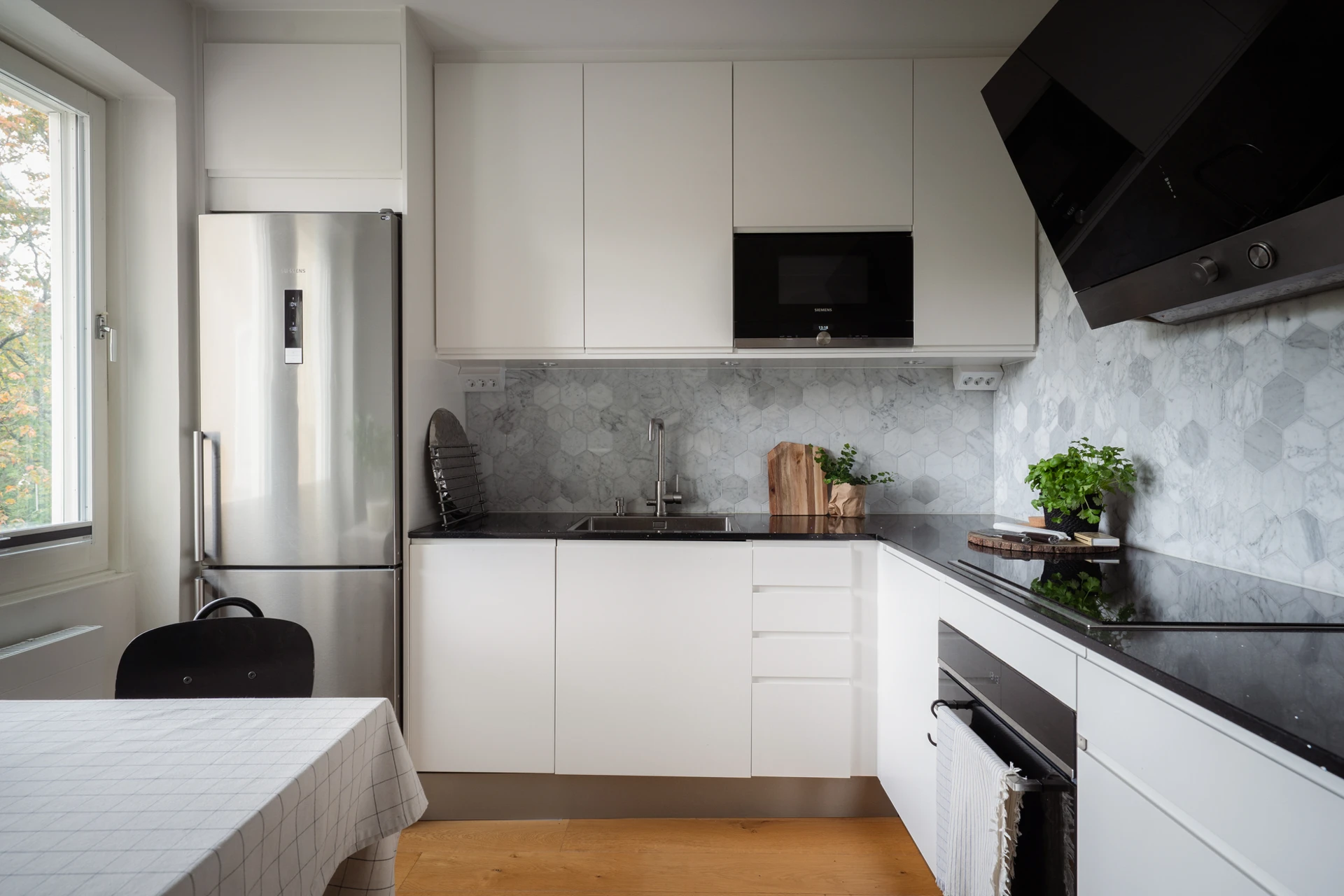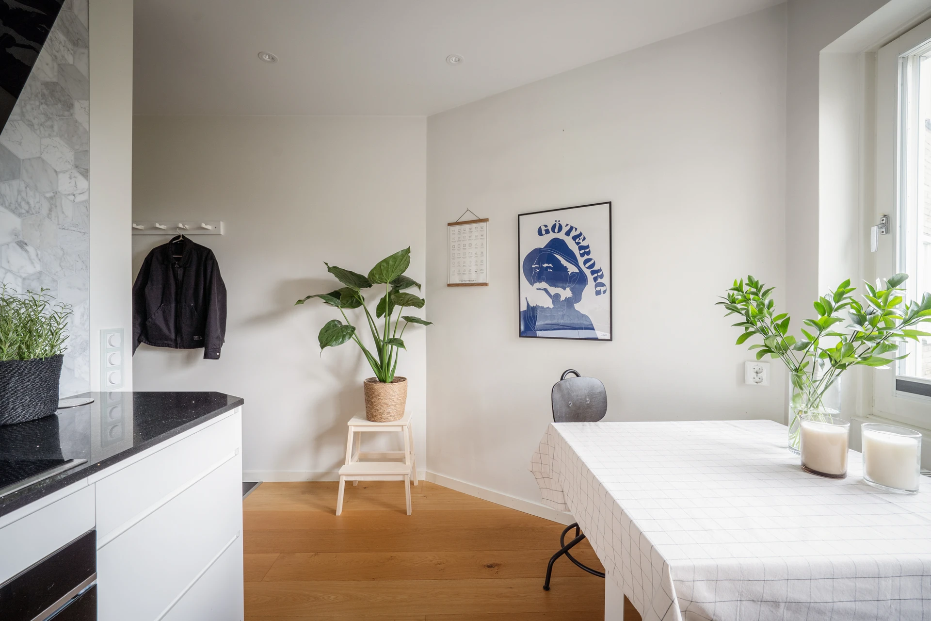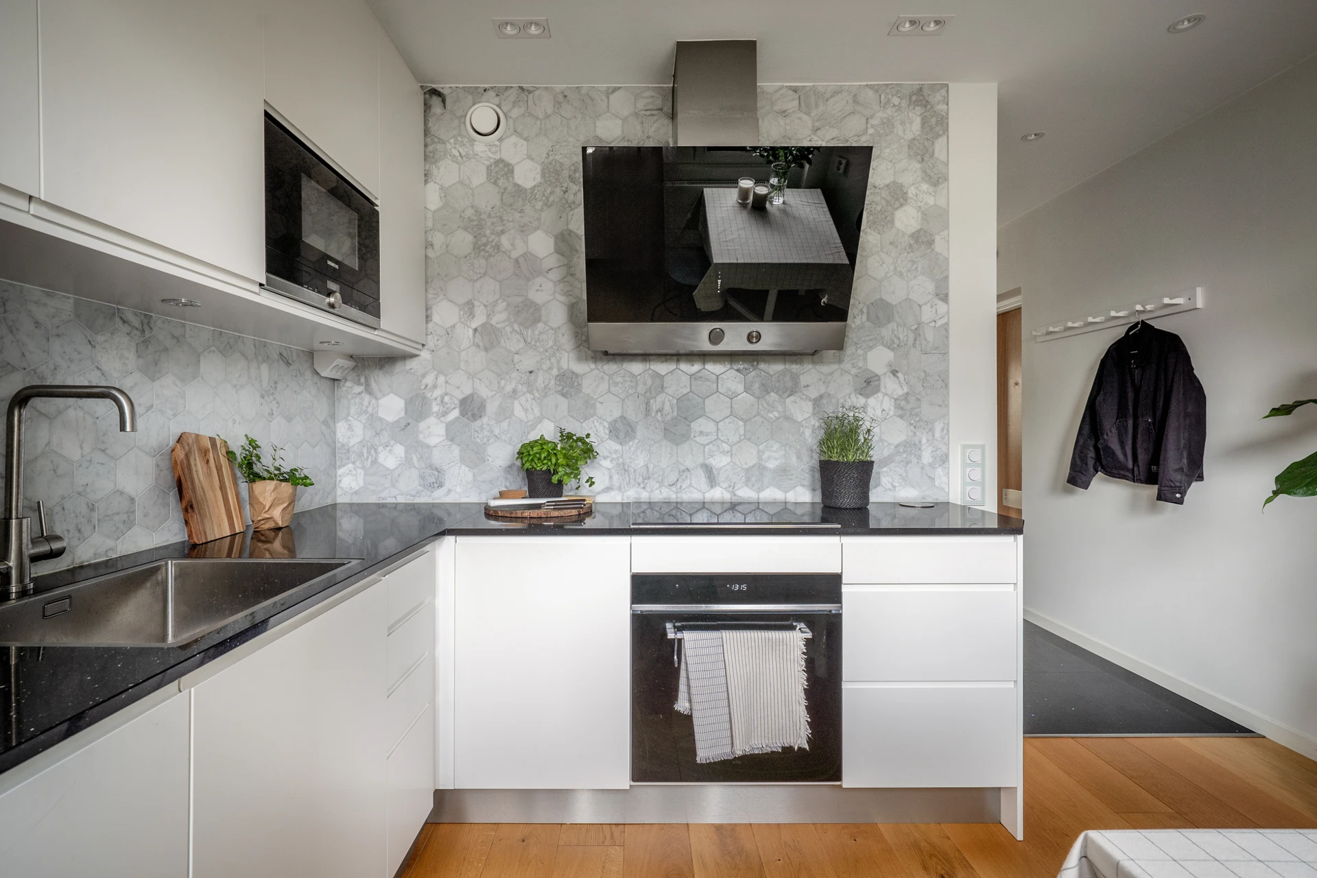 Trägolv och vita väggar. Köksinredning i vitt och ovan arbetsbänken i svart sitter hexagon-kakel. Den maskinella utrustningen består av kombinerad kyl/frys, inbyggd ugn och mikro, induktionshäll, diskmaskin och köksfläkt. Här finns plats för matbord.