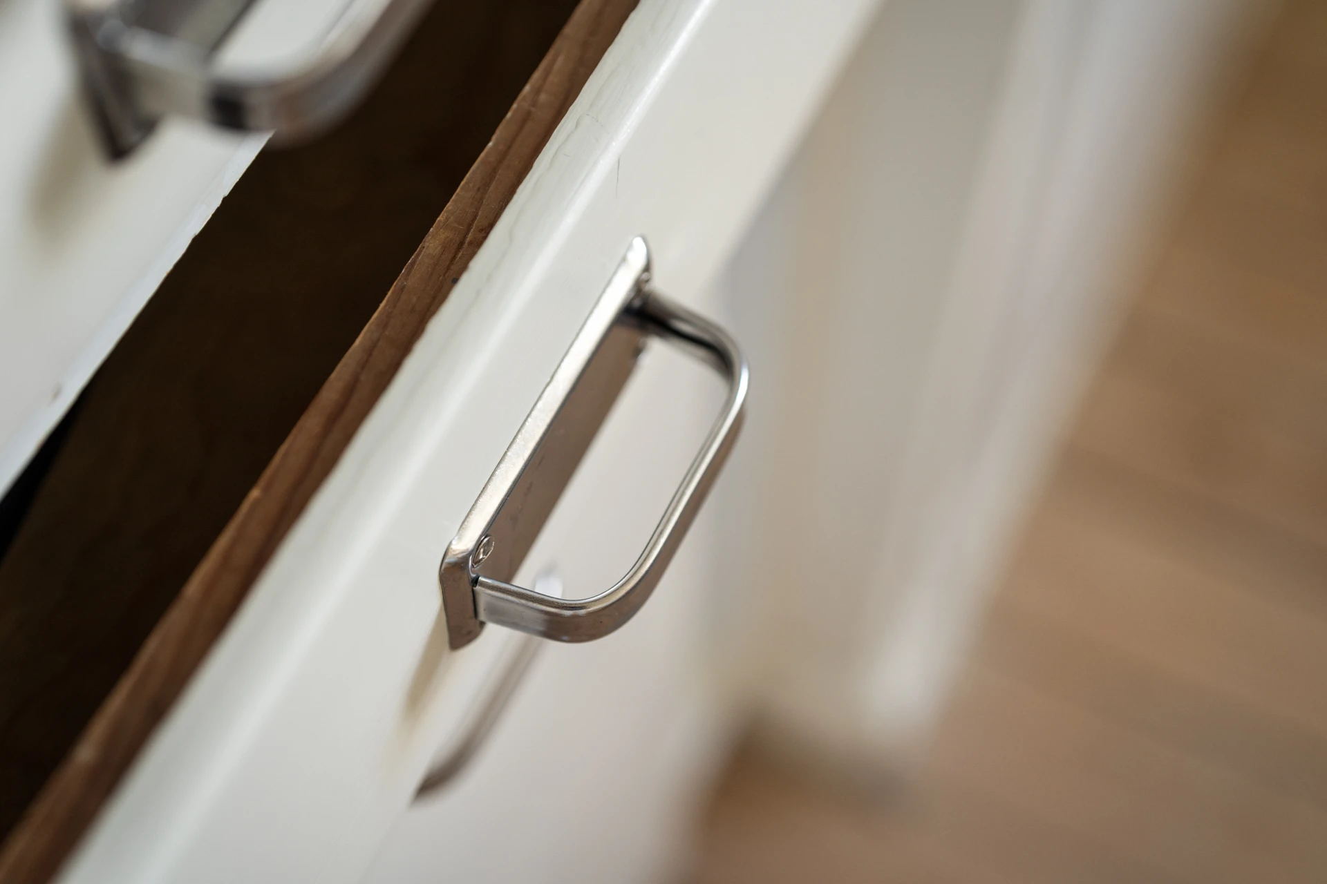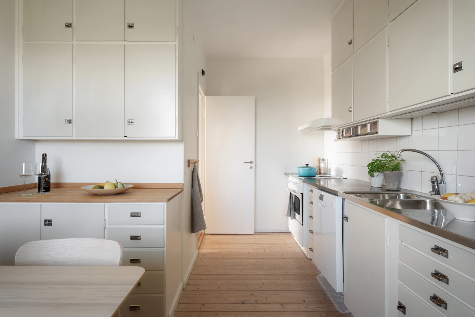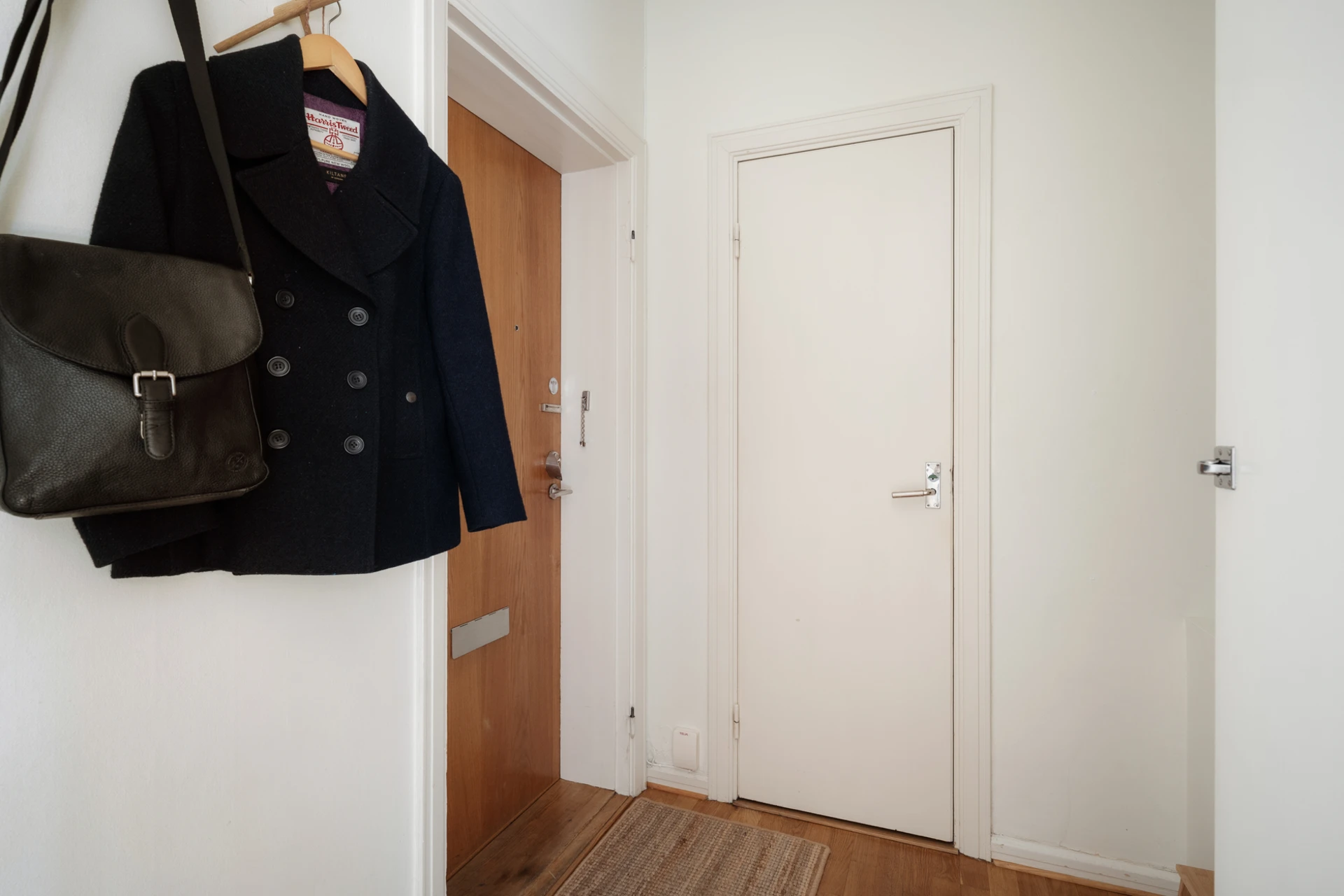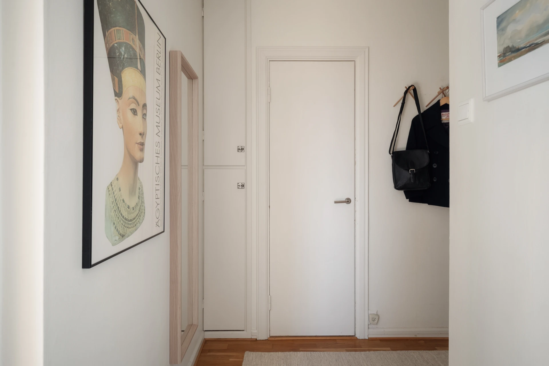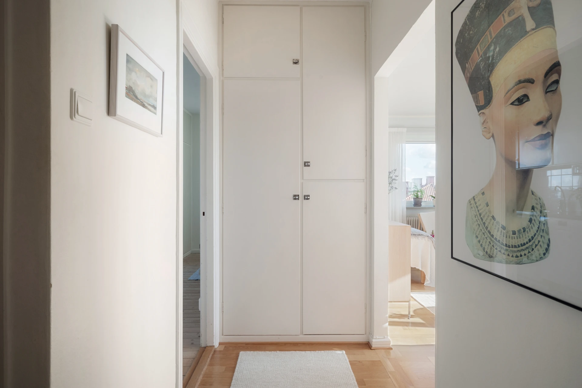Parkettgolv och vita väggar. Plats för avhängning och förvaring i tre inbyggda garderober samt i en klädkammare.