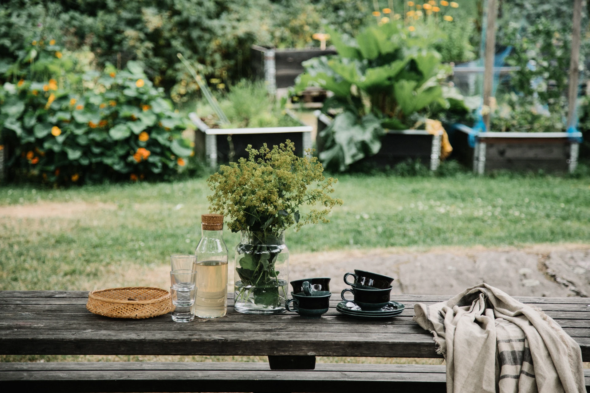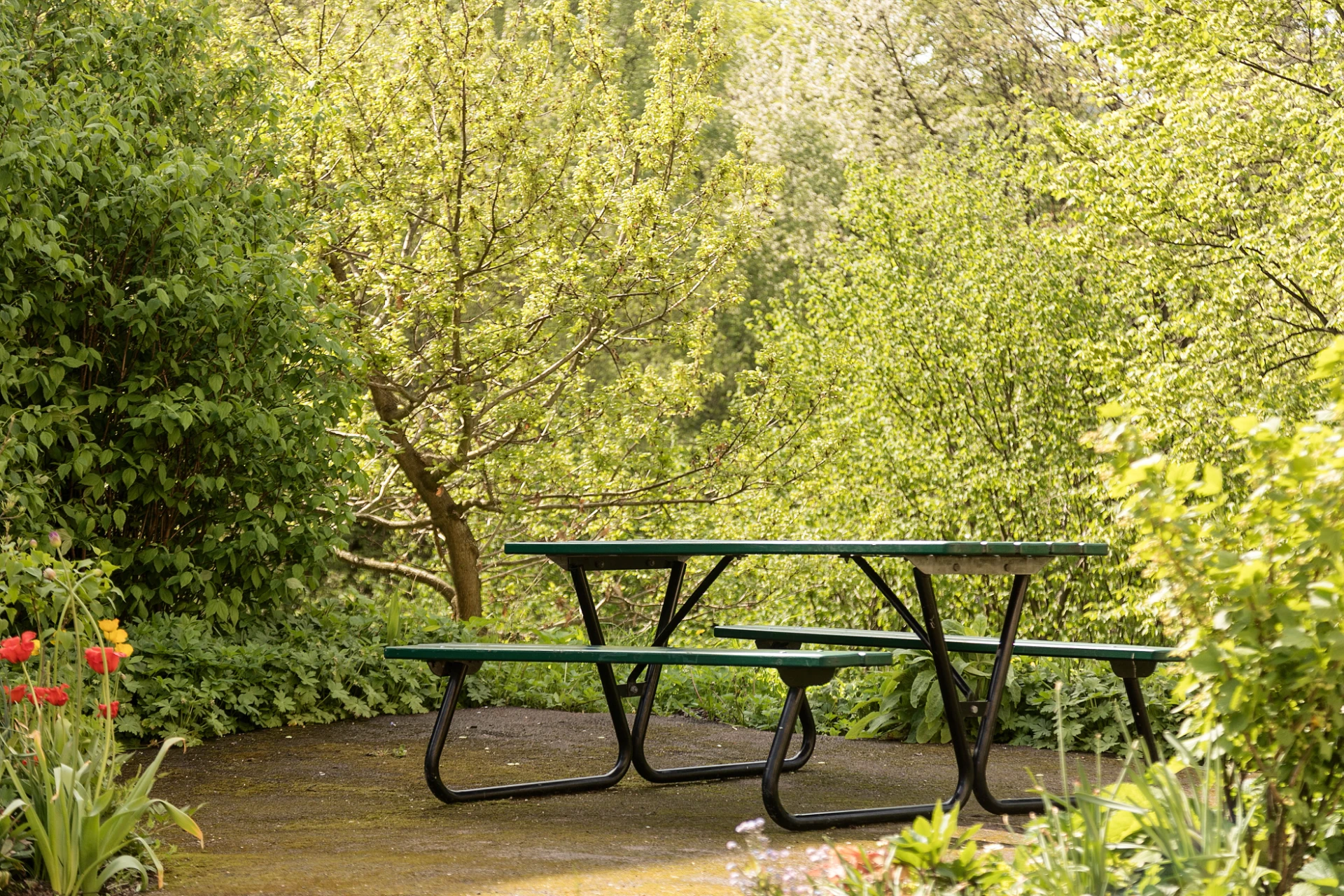Gemensamma gårdar med utemöbler, lekplats och fin växtlighet.