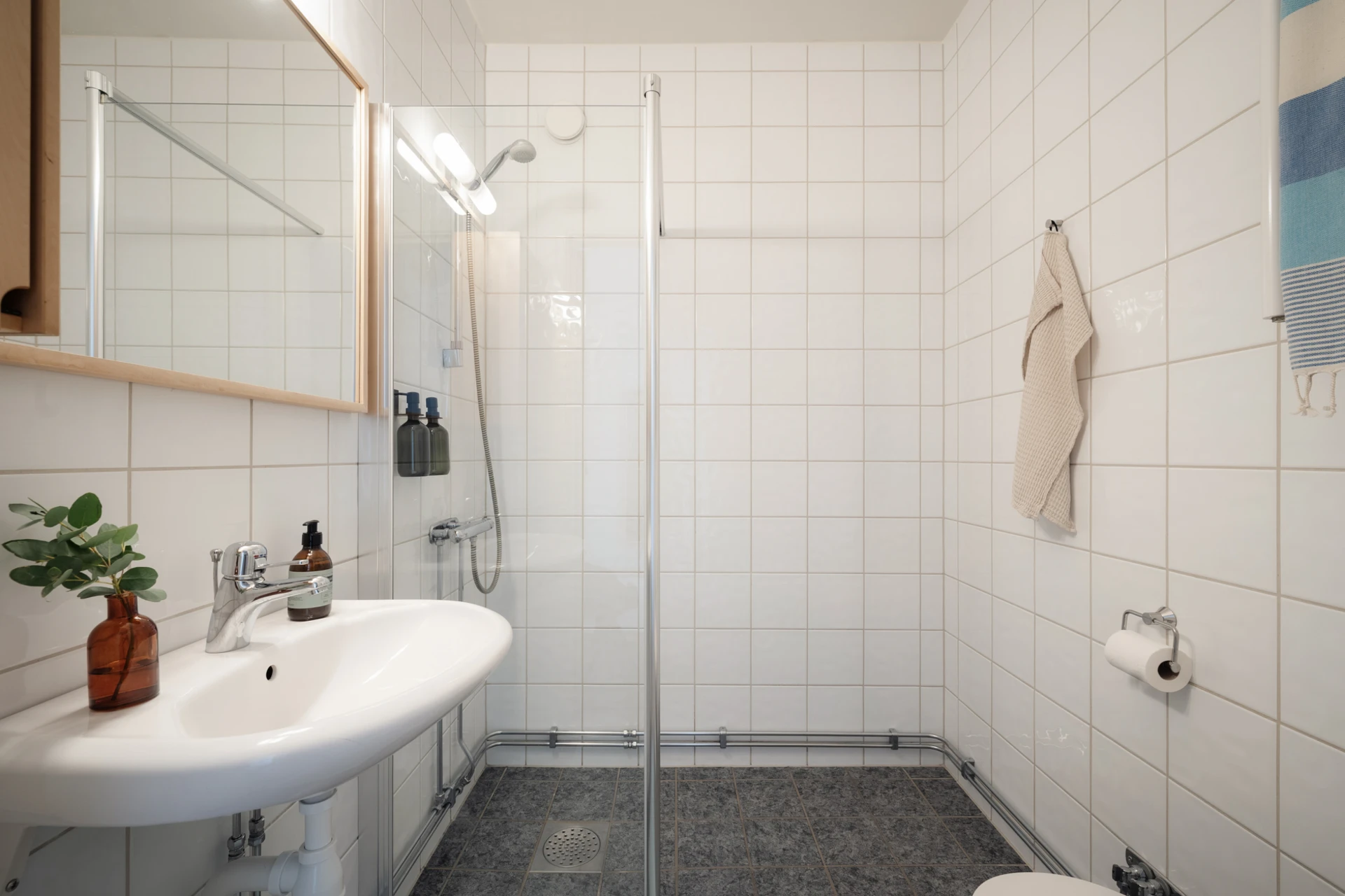 Grå-grönt klinkergolv och helkaklade väggar i vitt. Badrummet är utrustat med WC-stol, handfat, spegel med belysning och dusch med glasvägg.
