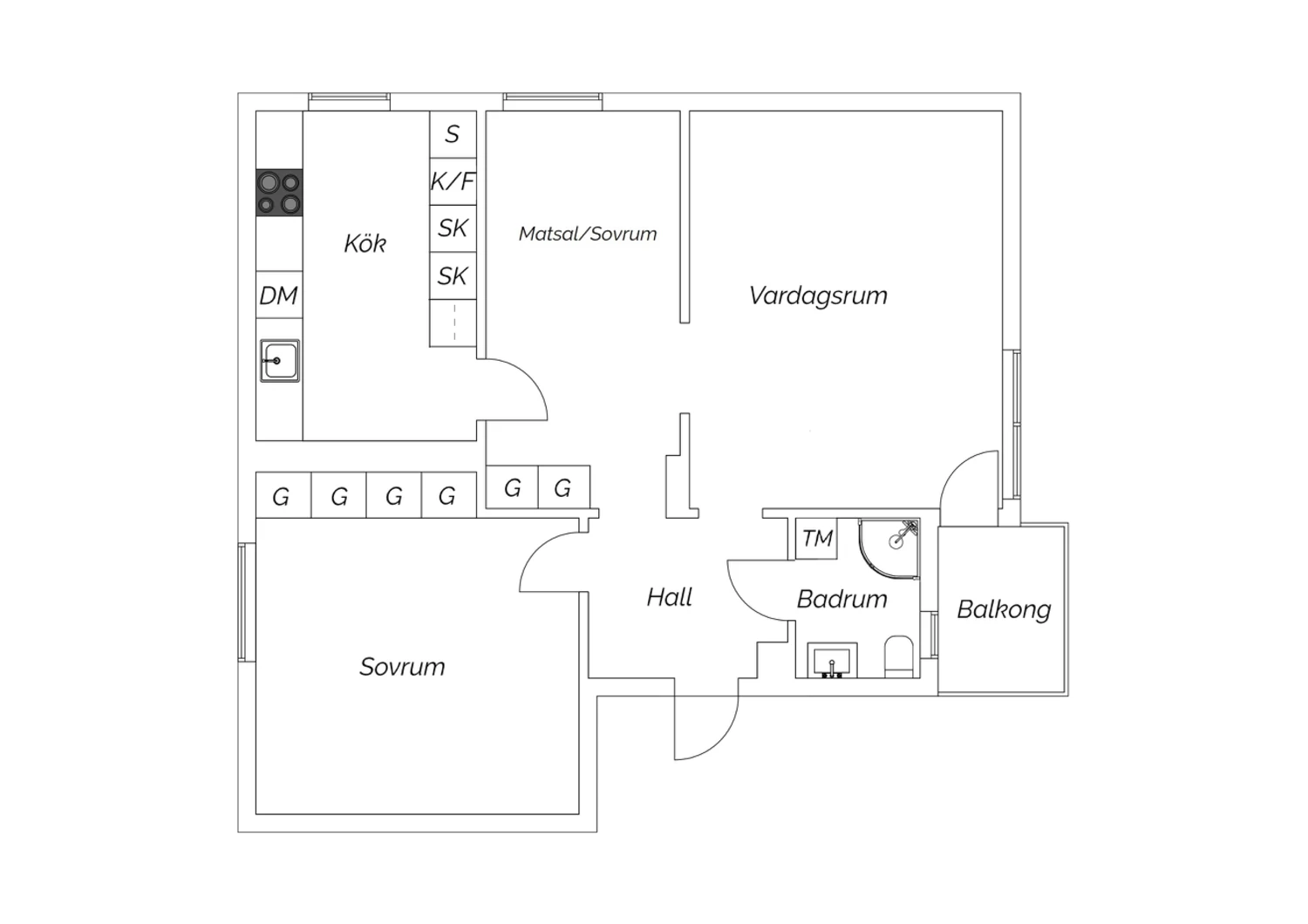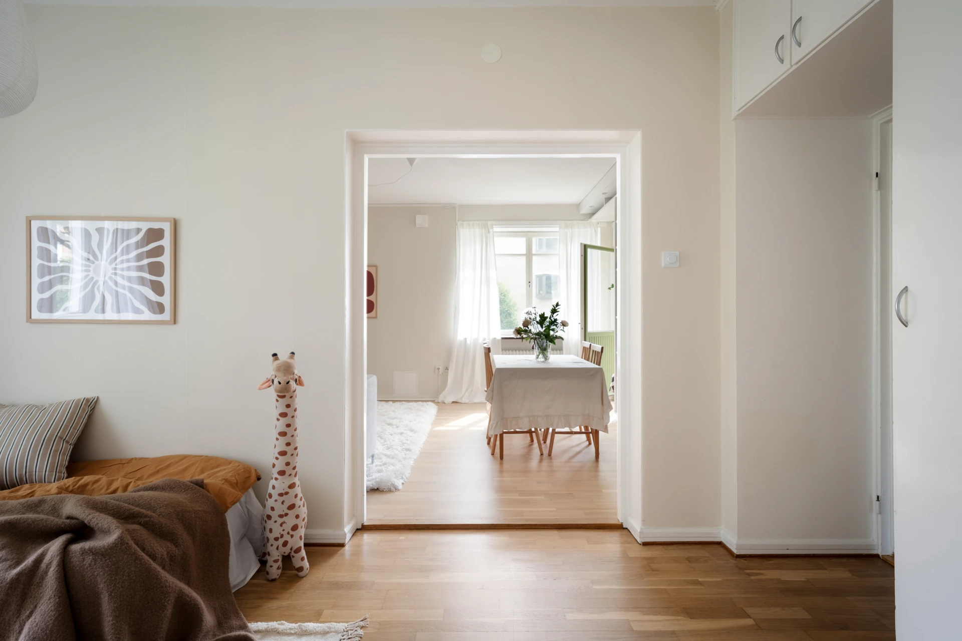 Parkettgolv och väggar målade i bruten vit nyans. Plats för matsalsmöbel eller arbetshörna. Möjligt att dela av för att skapa extra sovrum. Förvaring i två platsbyggda garderober samt fyra överskåp.
