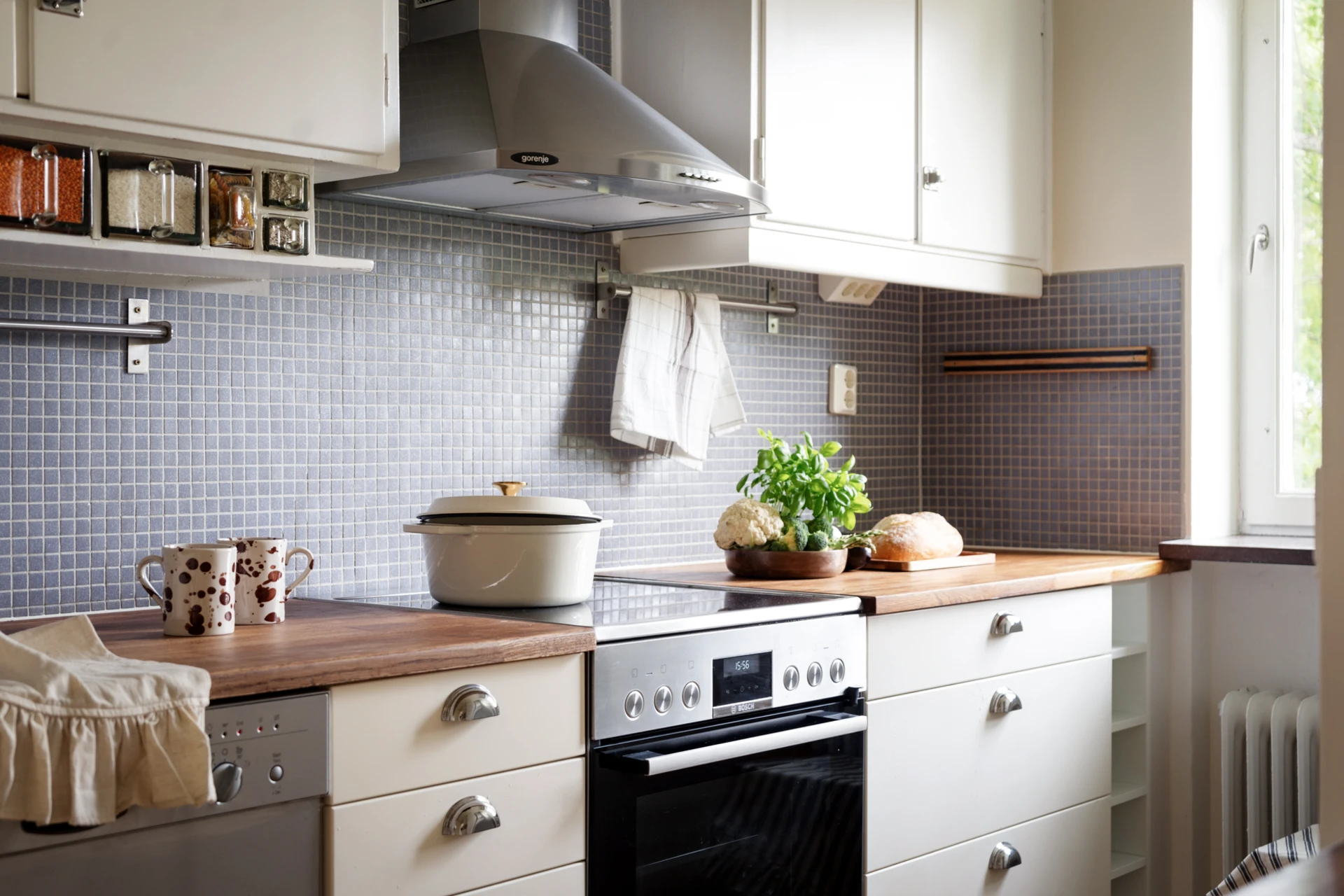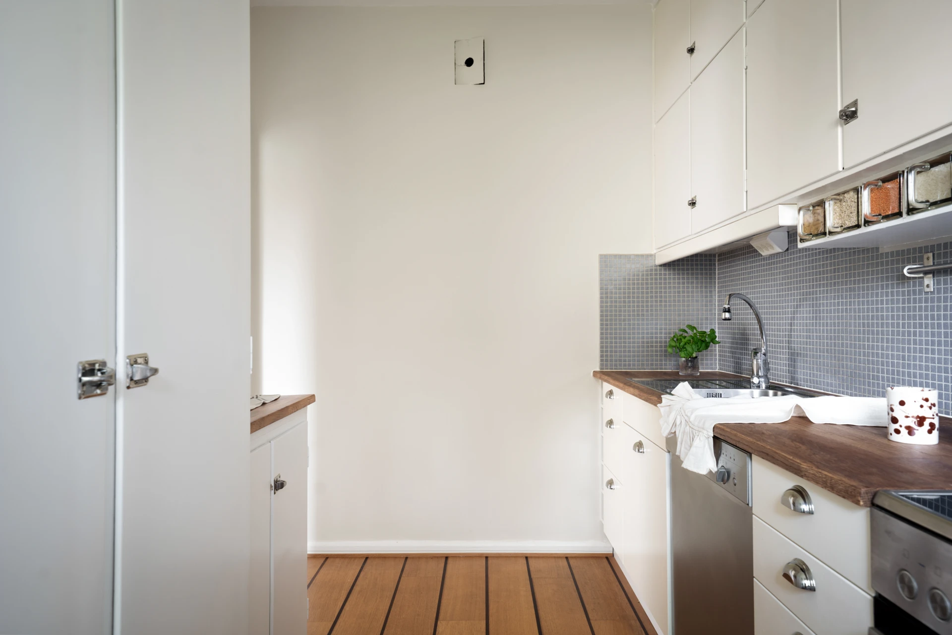 Skeppsgolv och vitmålade väggar. Köksinredning i vitt (delvis i original) med bänkskiva i trä. Ovan arbetsytor är väggen klädd i blå mosaik. Köket är utrustat med hällspis, fläkt, kyl/frys och diskmaskin. Gott om skåpsförvaring.