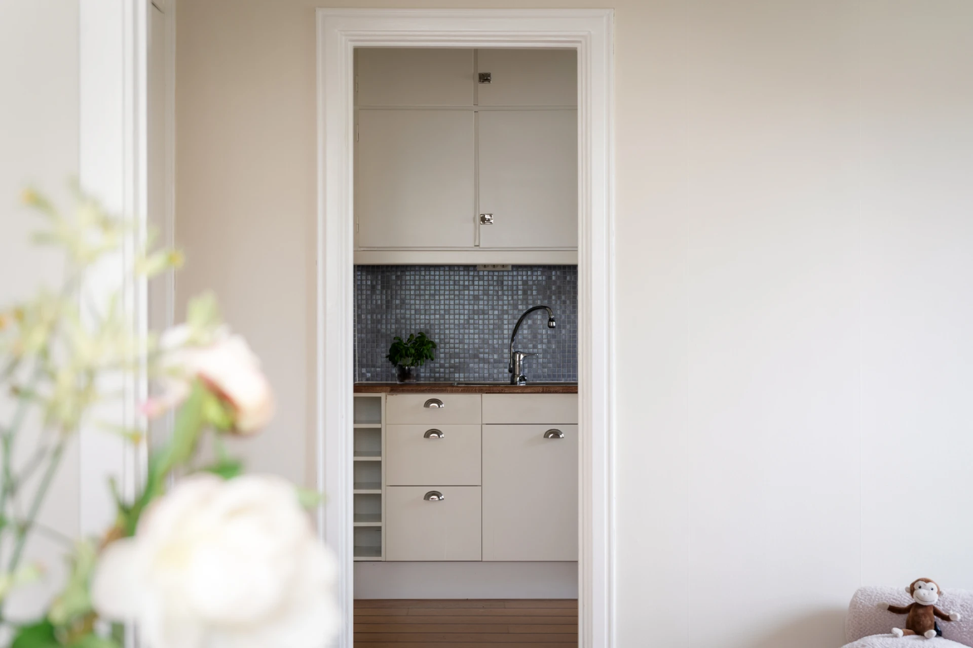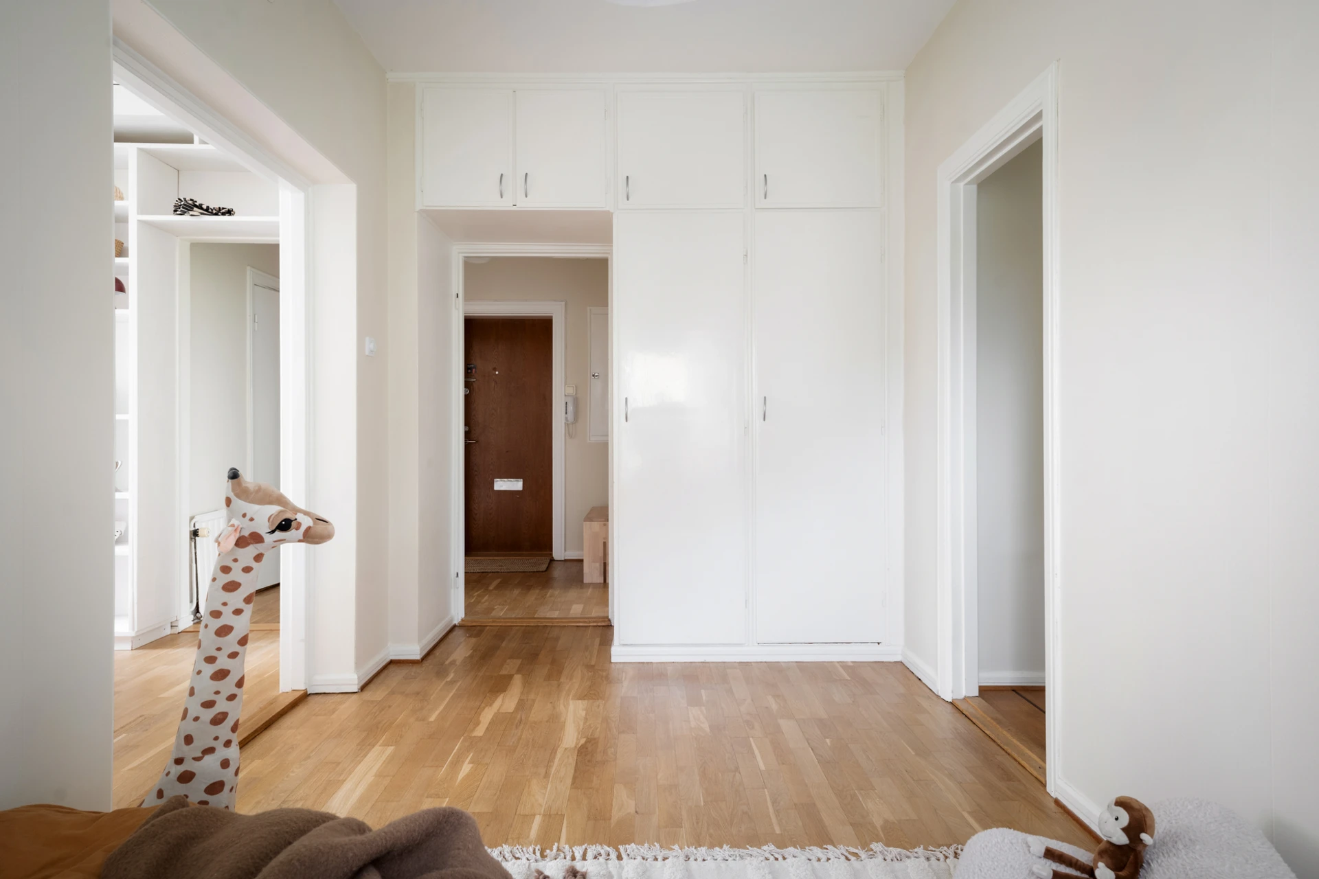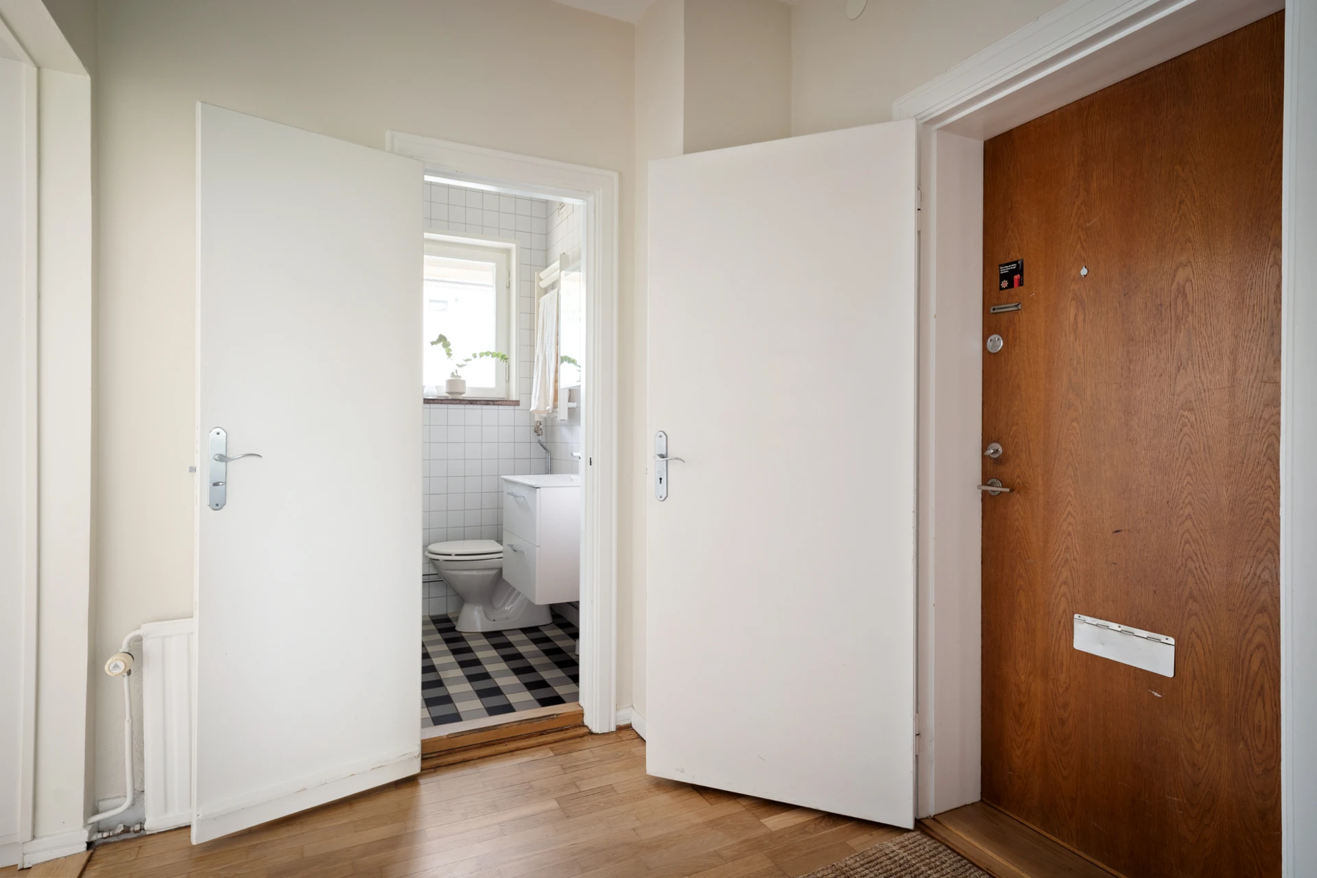 Parkettgolv och väggar målade i bruten vit nyans. Plats för hatthylla.