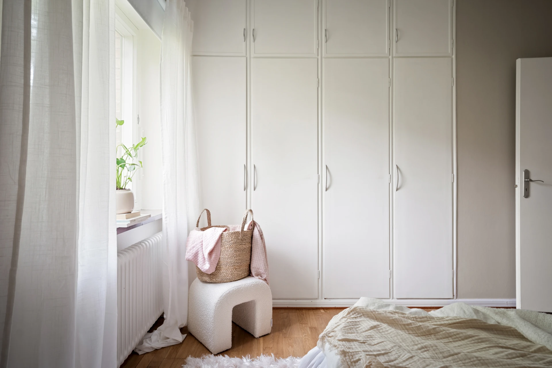 Parkettgolv och väggar målad i beige nyans. Plats för dubbelsäng. Förvaring i fyra inbyggda garderober med överskåp.