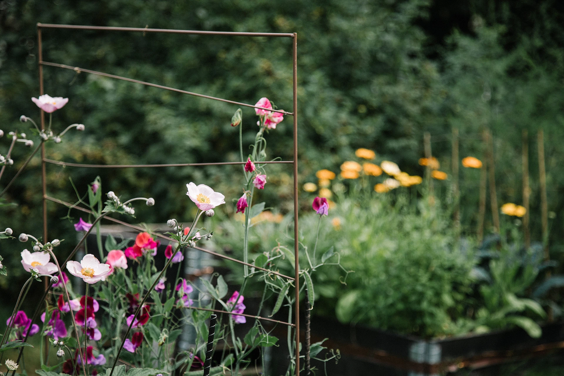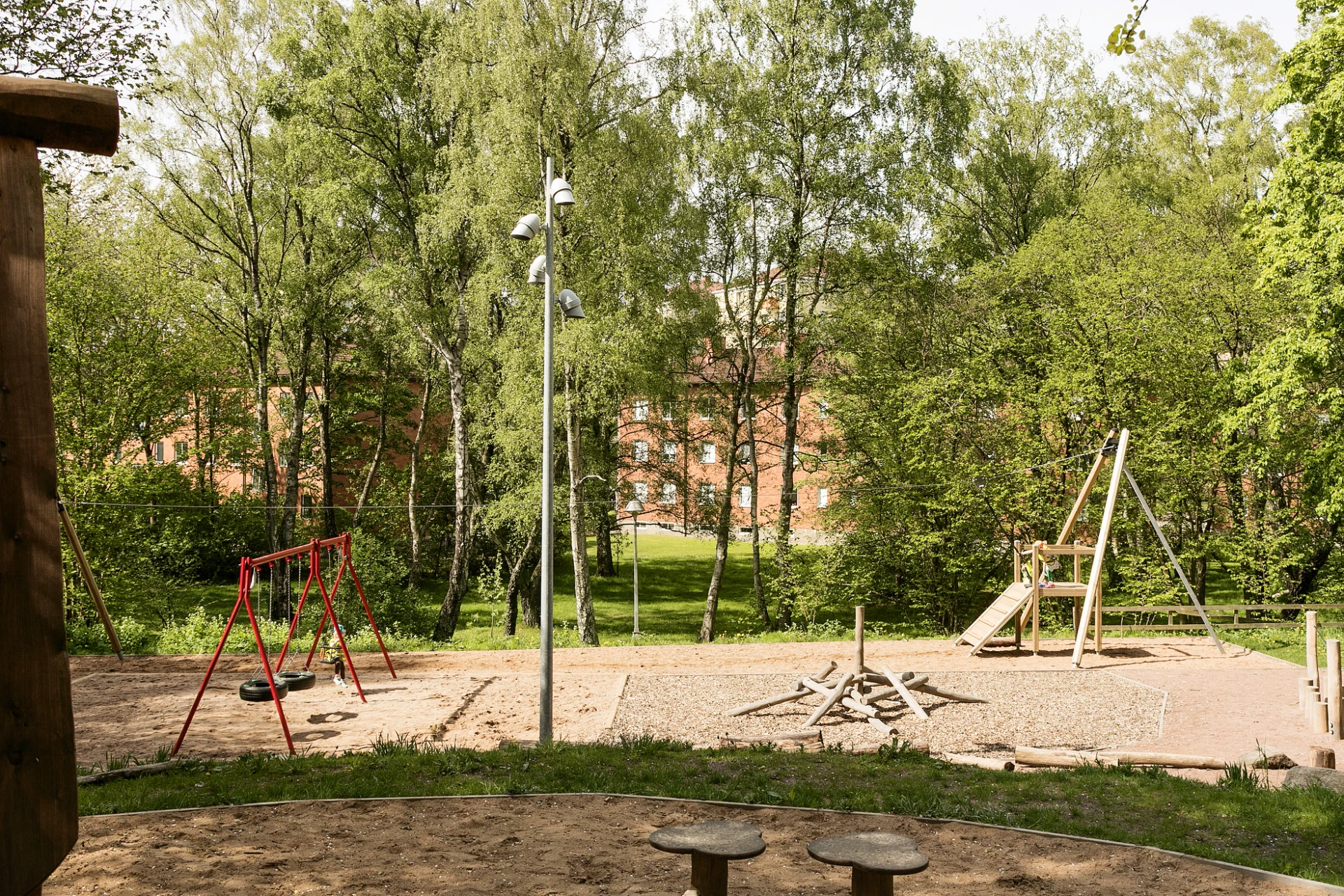 Gemensamma gårdar med utemöbler, lekplats och fin växtlighet.