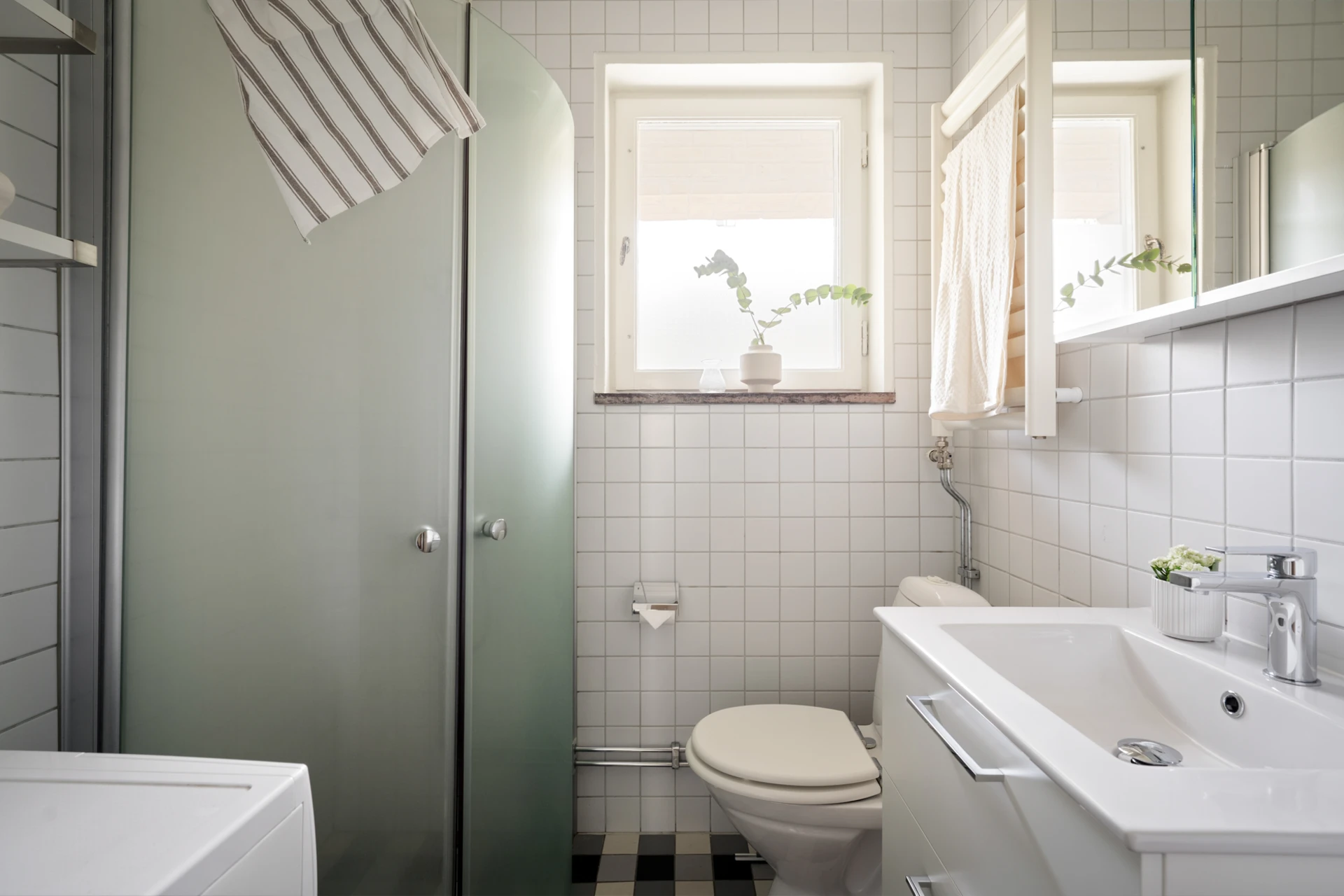 Flerfärgat klinkergolv och väggar klädda i vitt kakel. Här finns handfat med kommod, spegelskåp, dusch med vikbara glasdörrar, handdukstork, tvättmaskin, hyllor, fönster och toalett.