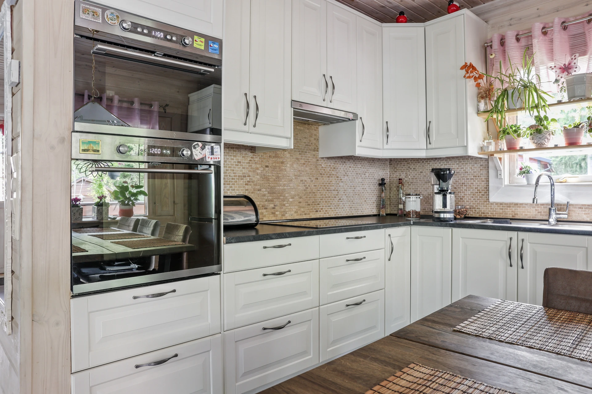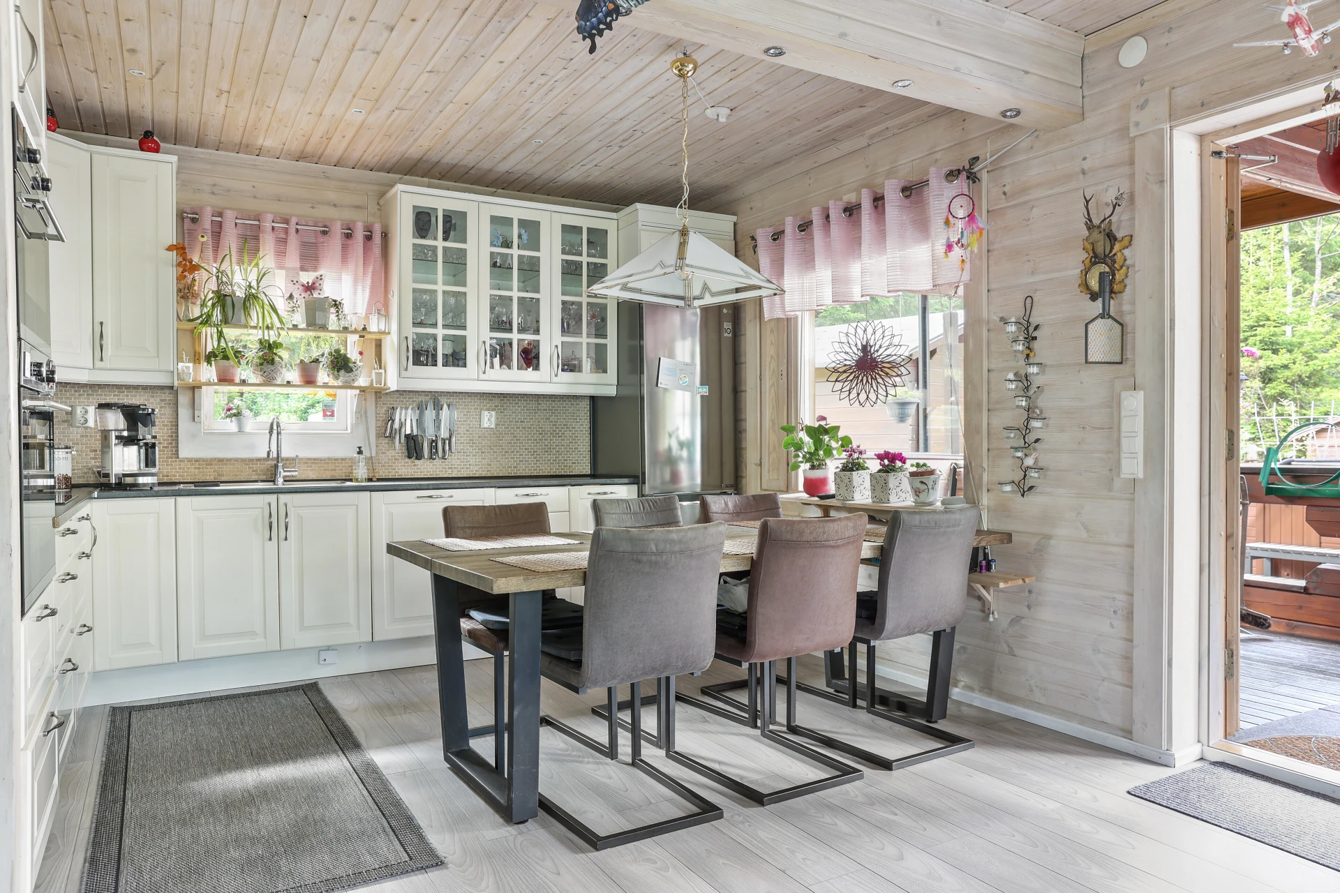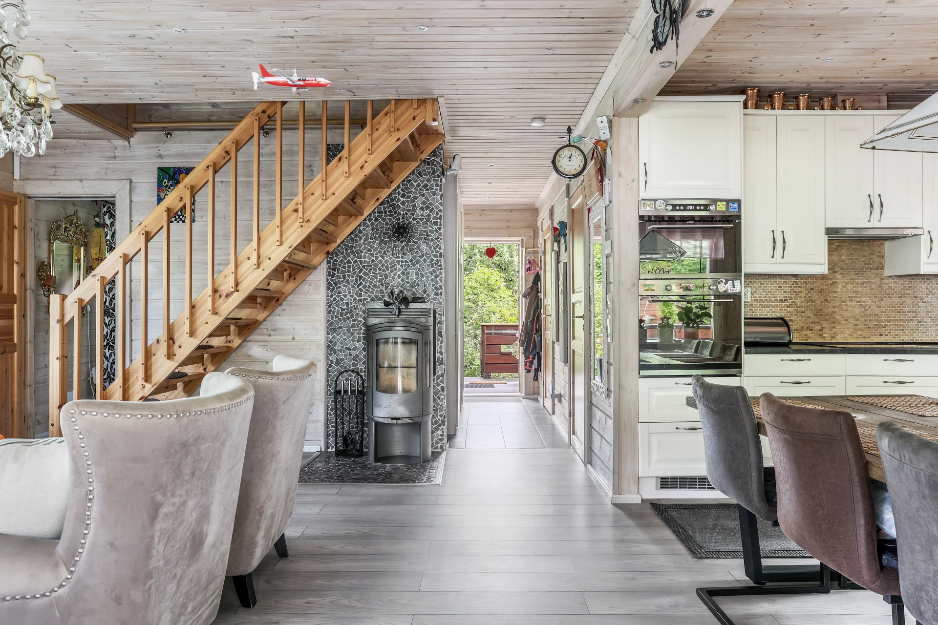 Charmigt kök med en öppen planlösning mot vardagsrum och utgång till terrassen. Vita skåpluckor och mosaik ovan mörk arbetsbänk. Den maskinella utrustningen består av spishäll, fläkt, två ugnar i bekväm arbetshöjd, diskho med blandare, integrerad diskmaskin och kyl/frys. Parkettgolv och träpanel på väggar och i tak, med infällda spotlights i tak.
