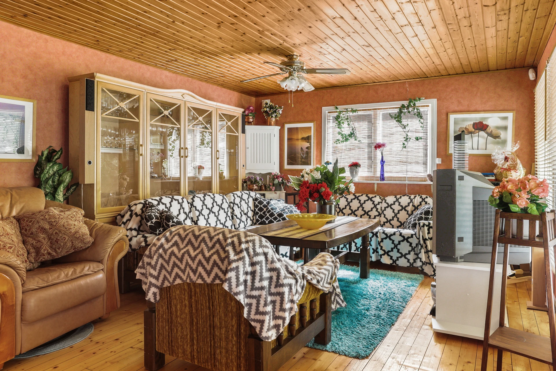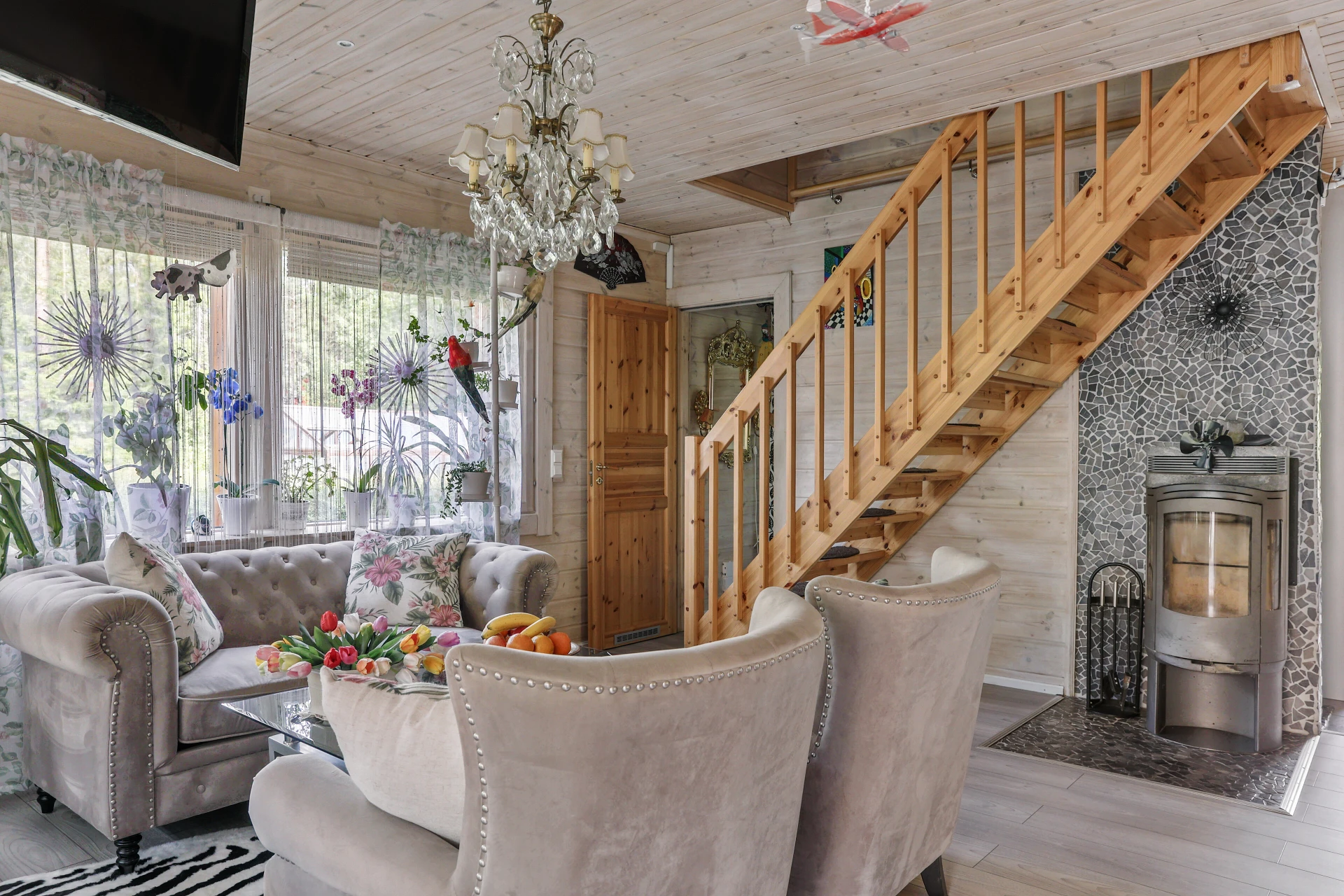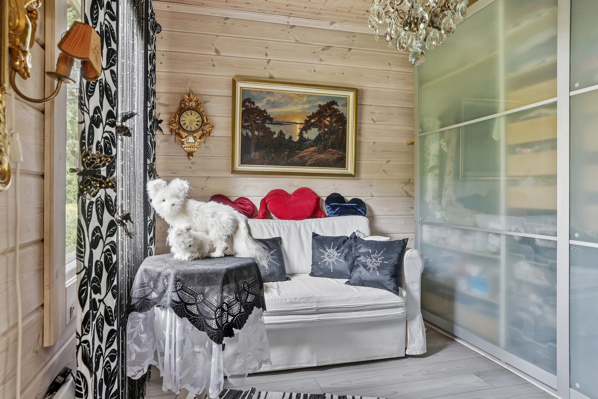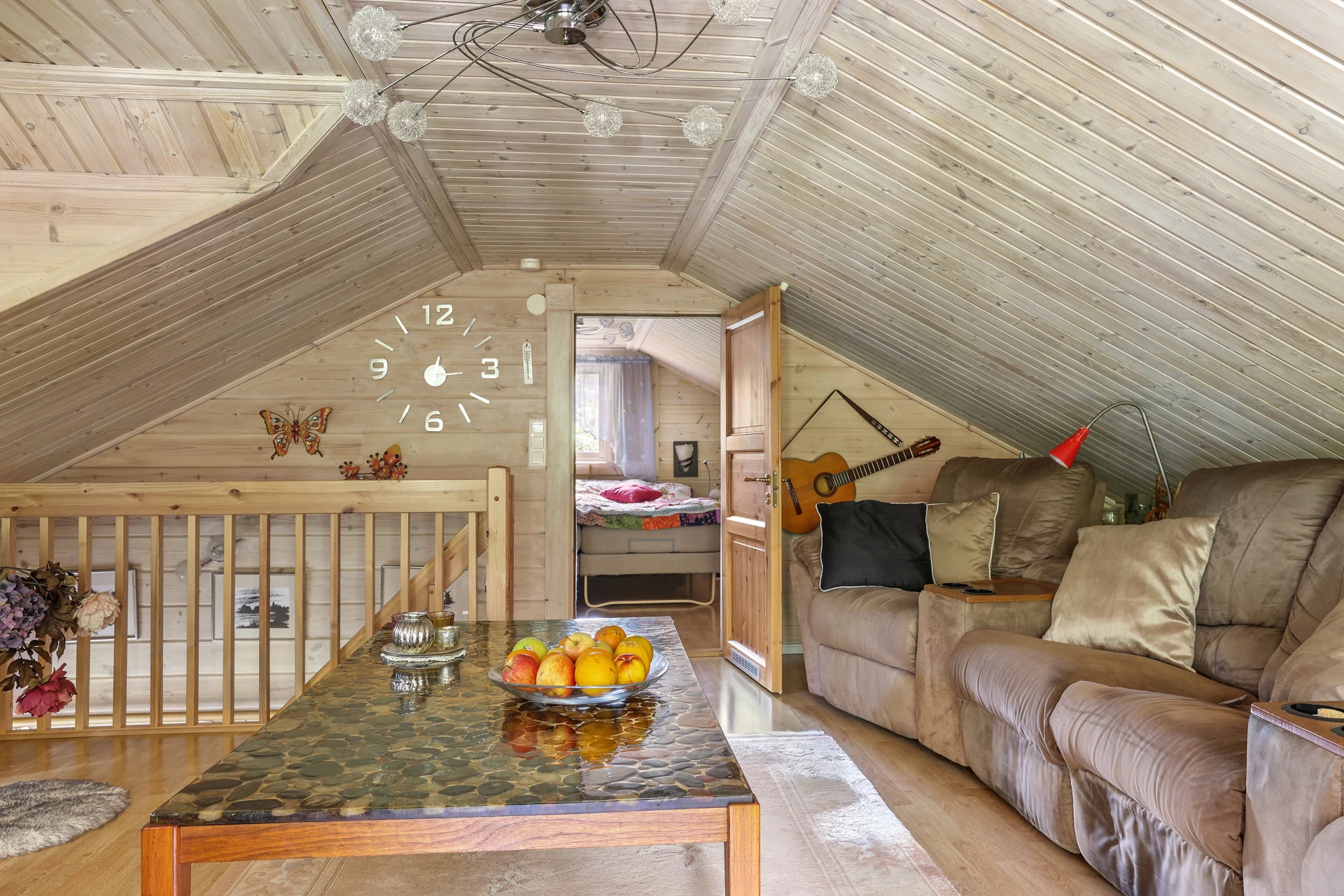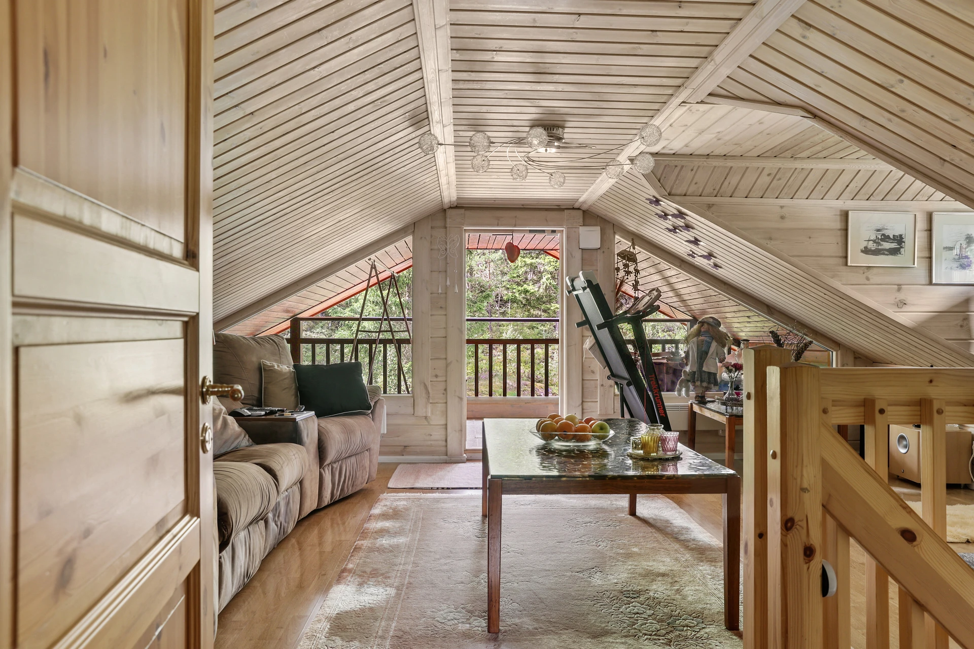 Luftigt och ljust allrum med utgång till en mysig balkong. Här finns plats för soffmöblemang, soffbord samt mediamöbel. I anslutning till allrummet finns ett sovrum. Snedtak och väggar i laserat furu med parkett på golv.