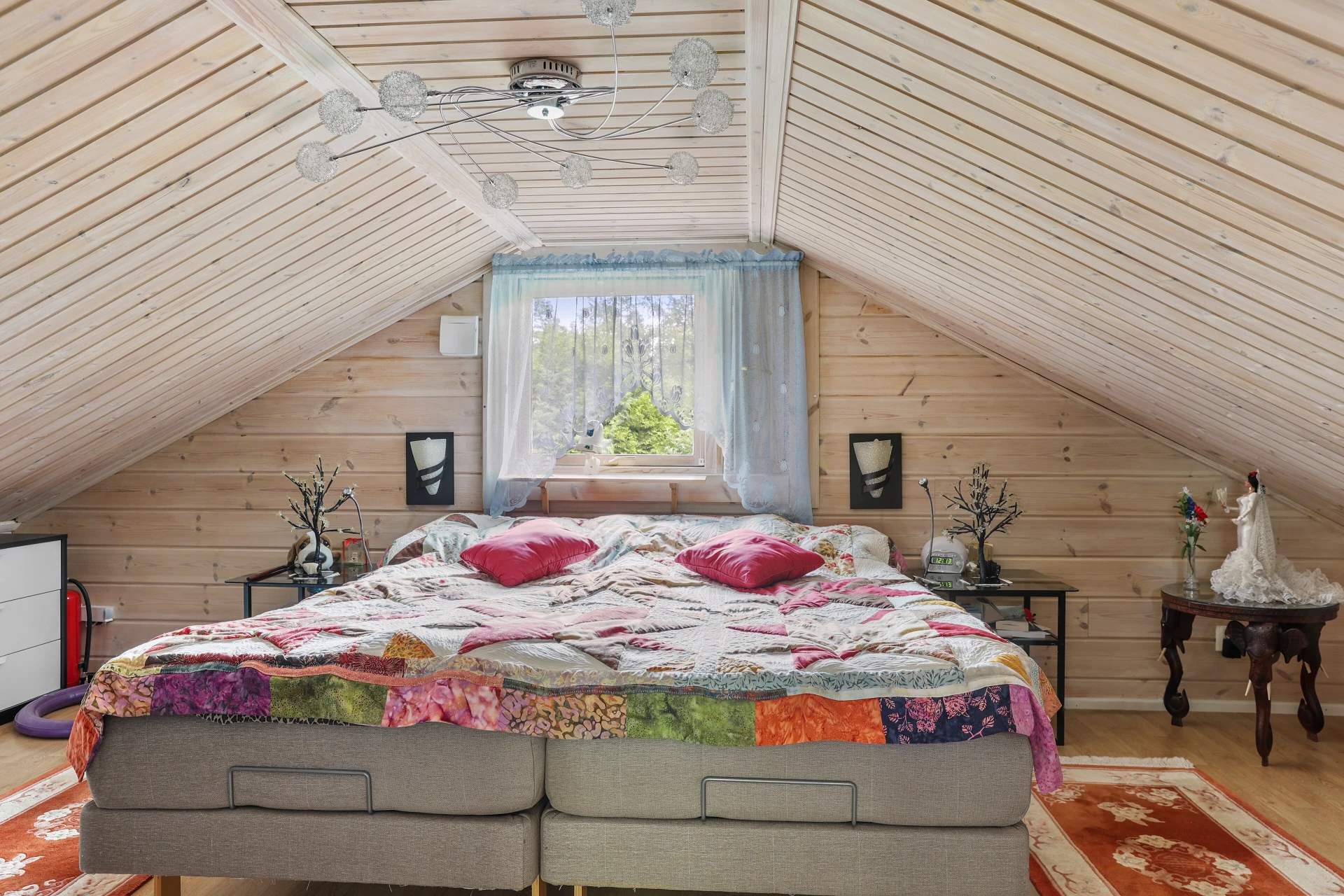 Stort och trivsam sovrum med ett fint ljusflöde från fönsterparti. Här ryms dubbelsäng med sängbord samt byrå. Snedtak och väggar i laserat furu med parkett på golv.