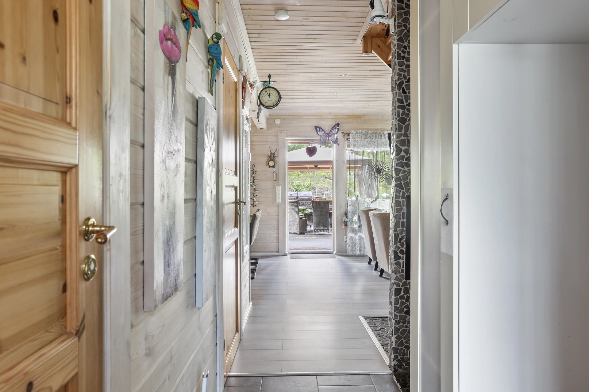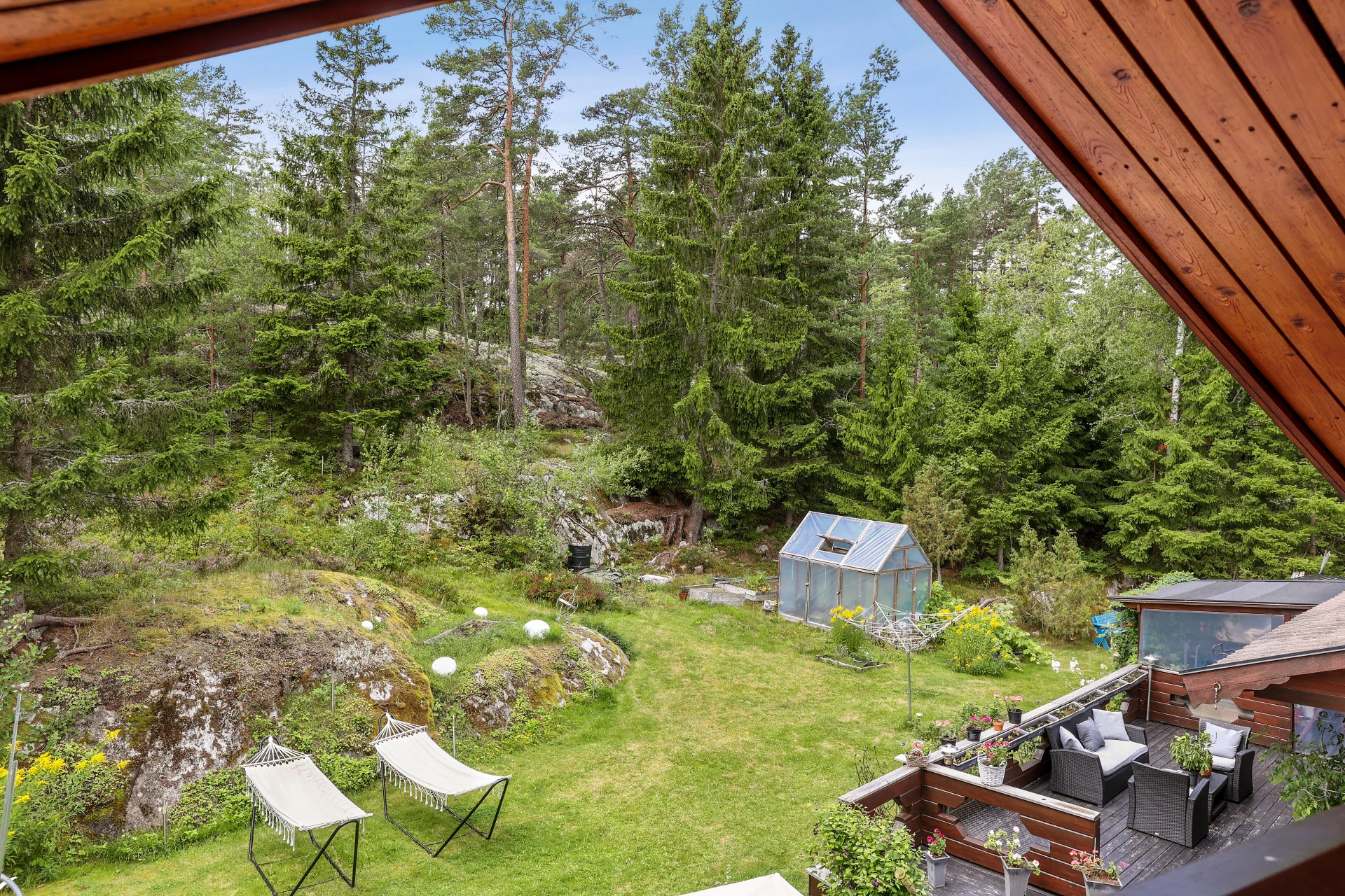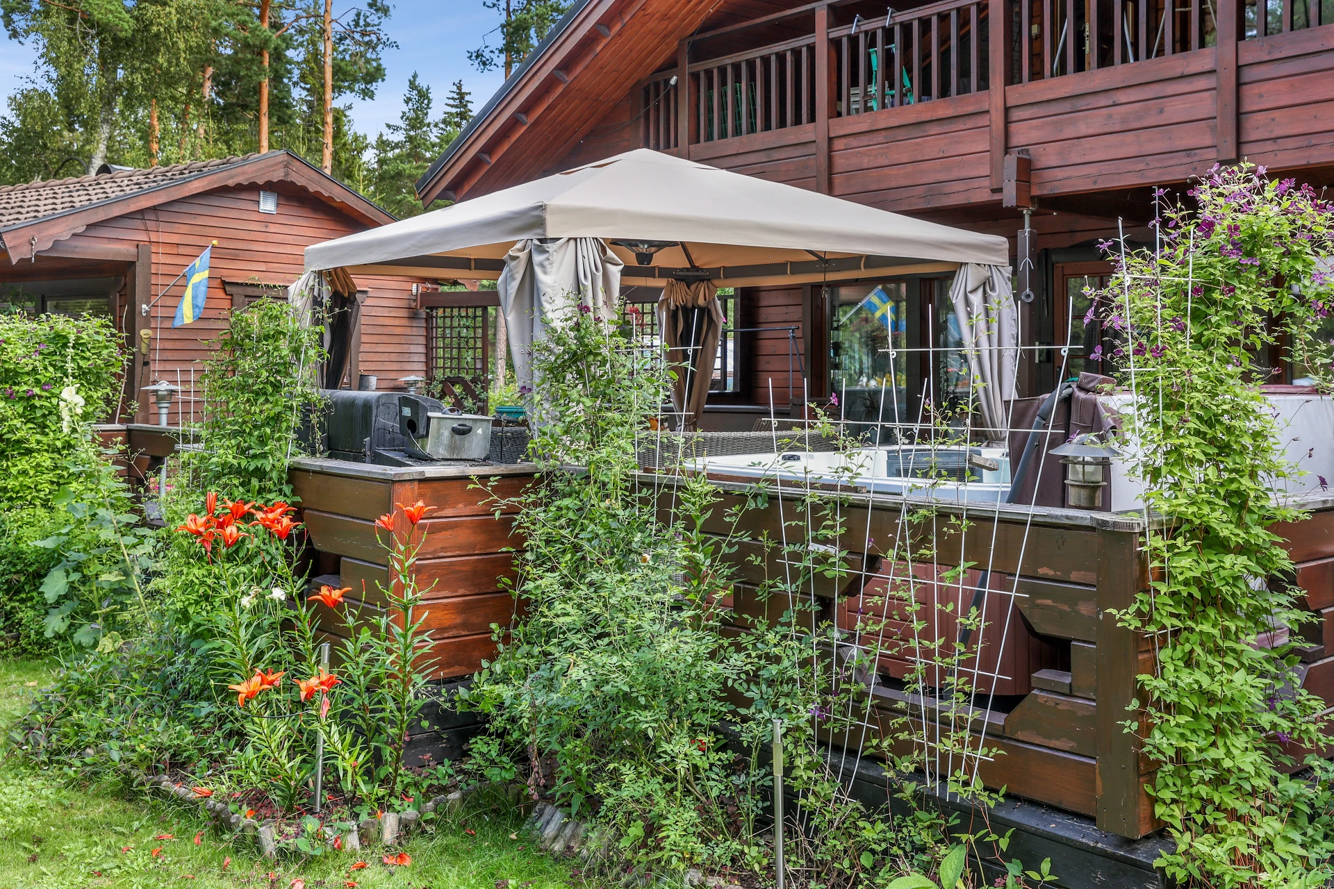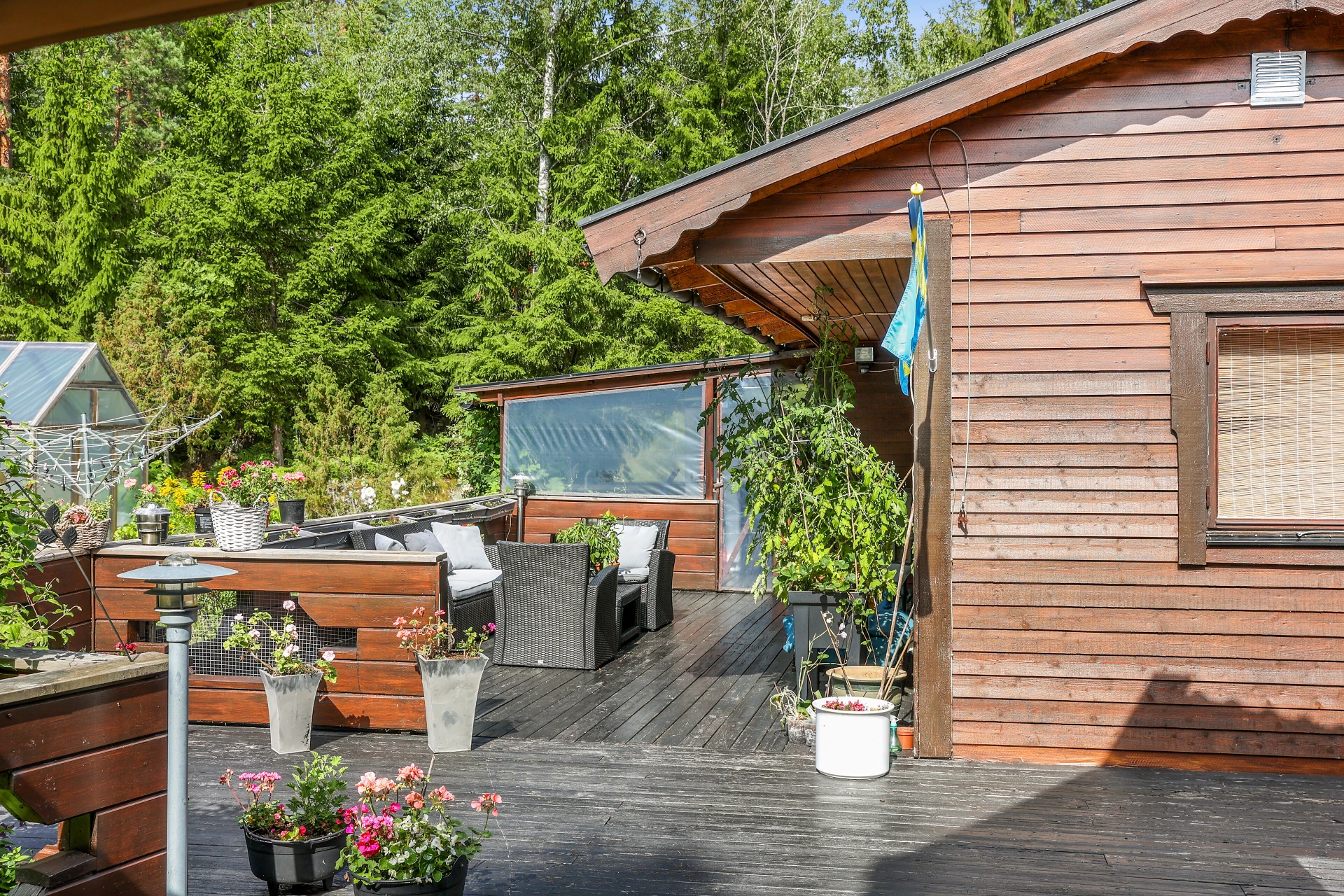 Fantastisk veranda som går ihop med det andra husets uteplats. En rogivande plats med en fin vy mot den grönskande trädgården, som blir en naturlig och trivsam plats att spendera sommaren på. Ett litet uterum finns på en del av verandan som passar perfekt för regniga dagar, med plats för möblemang. På den andra delen av verandan finns plats för loungegrupp och växter.