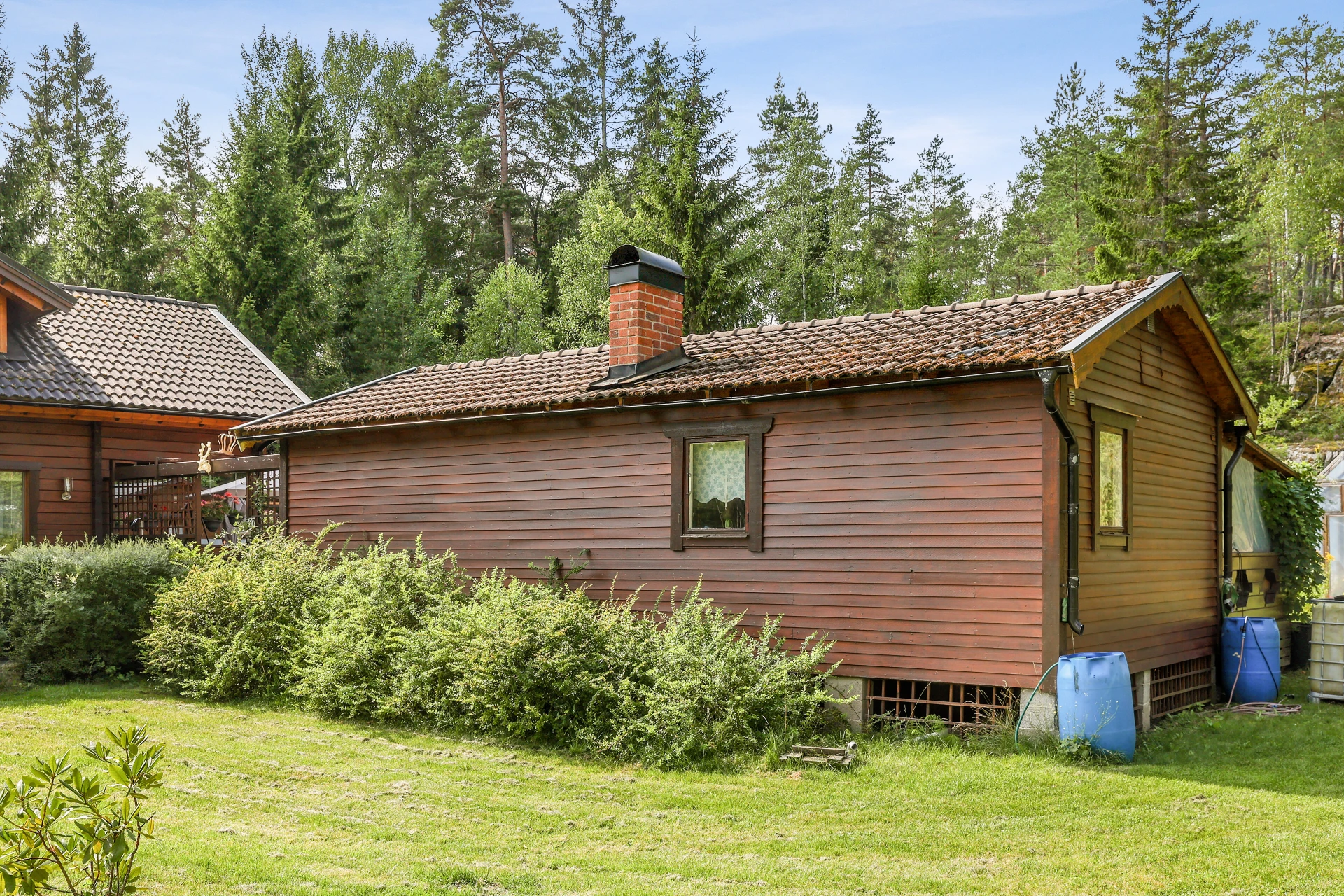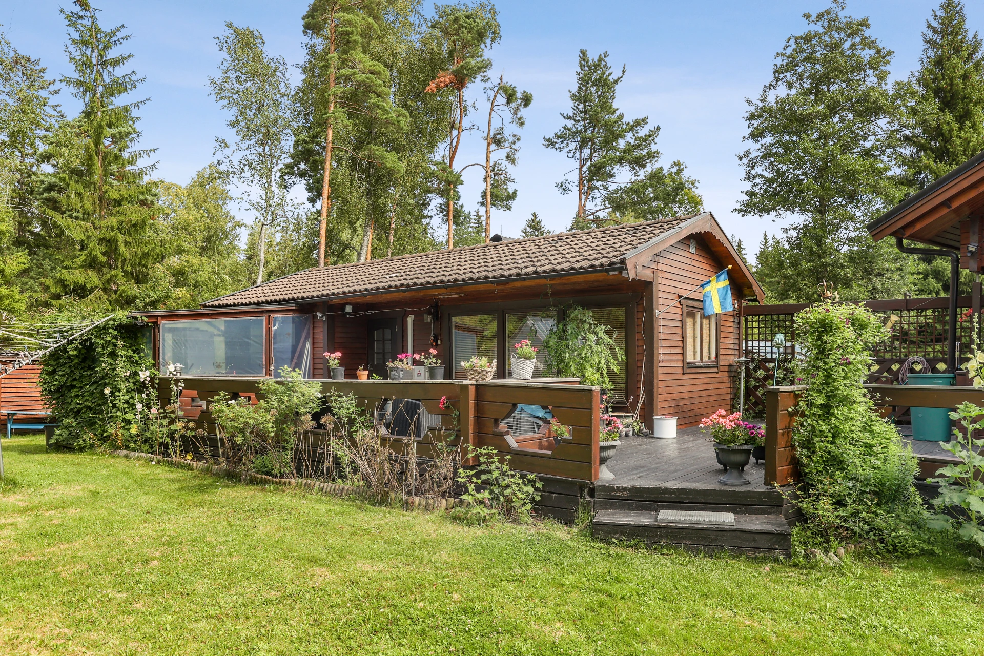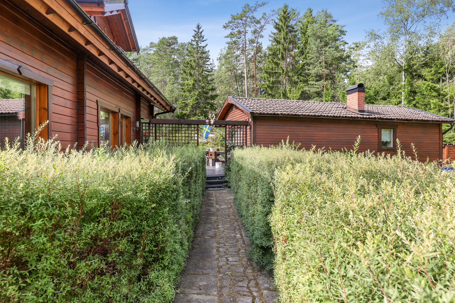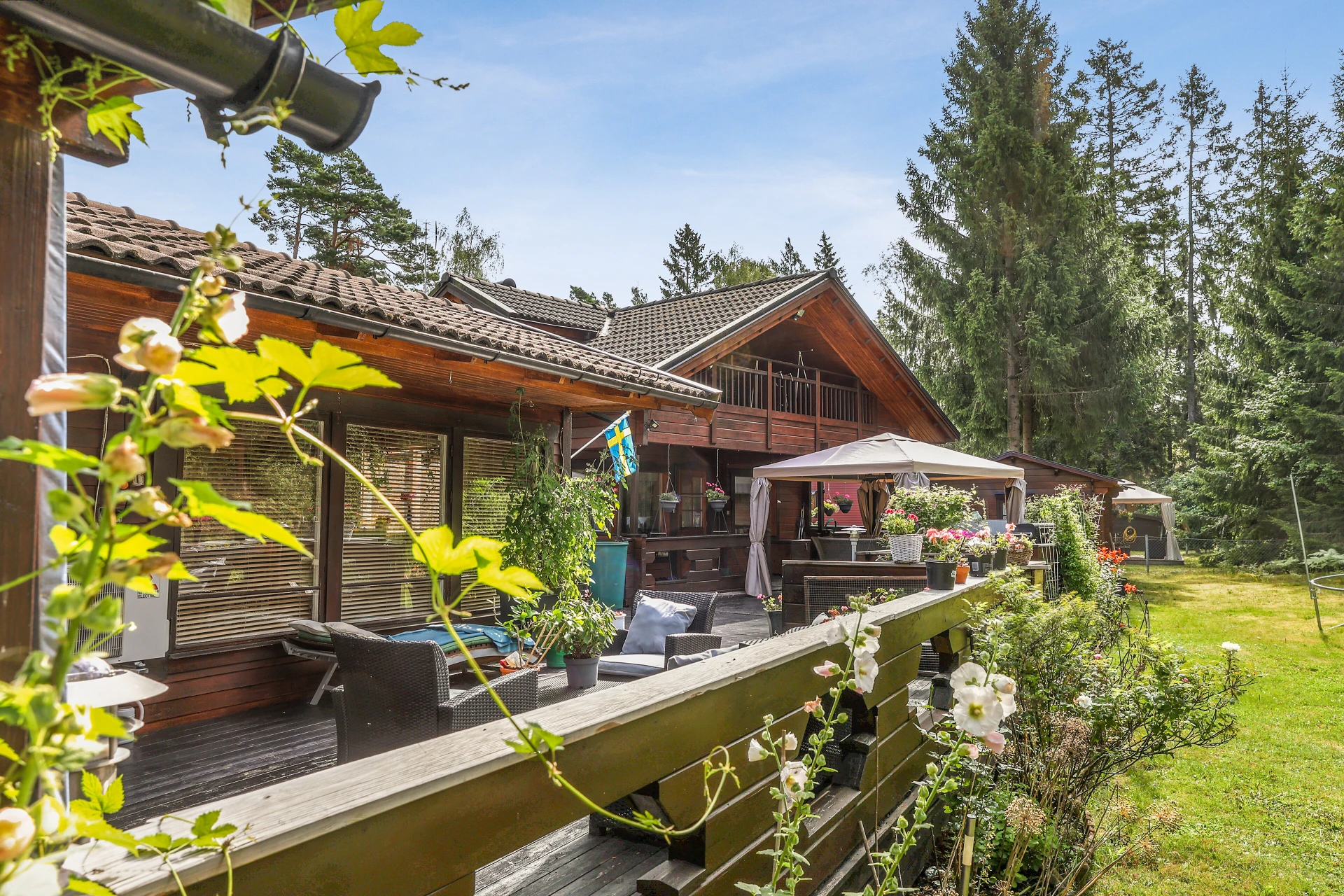 Fantastisk veranda som går ihop med det andra husets uteplats. En rogivande plats med en fin vy mot den grönskande trädgården, som blir en naturlig och trivsam plats att spendera sommaren på. Ett litet uterum finns på en del av verandan som passar perfekt för regniga dagar, med plats för möblemang. På den andra delen av verandan finns plats för loungegrupp och växter.