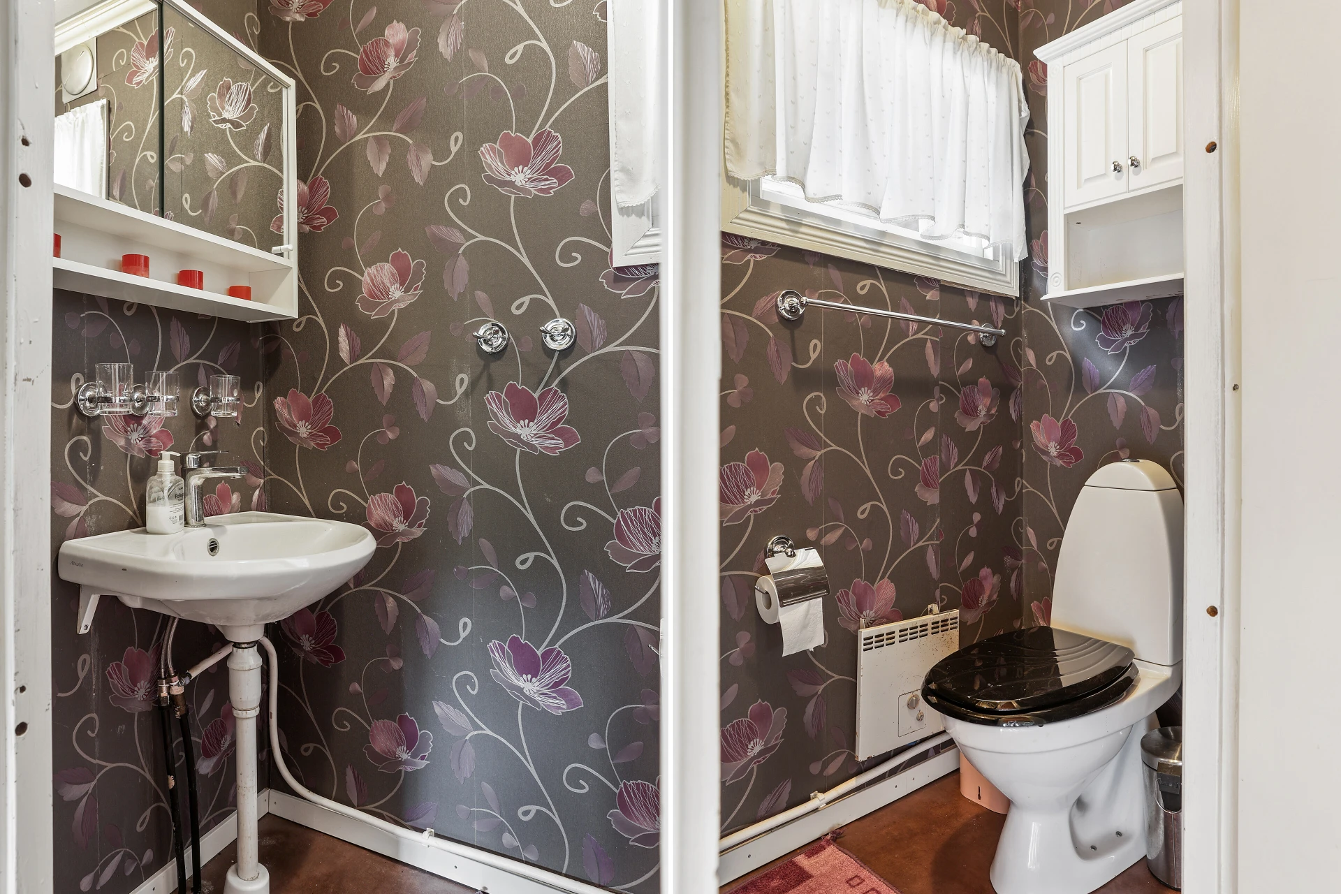 Våtrumsmatta och tapetserade väggar med tryck av blommor. Inrett med WC, handfat och spegelskåp. Litet fönster för ljusinsläpp och vädring.