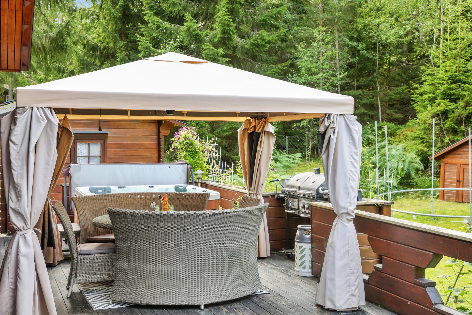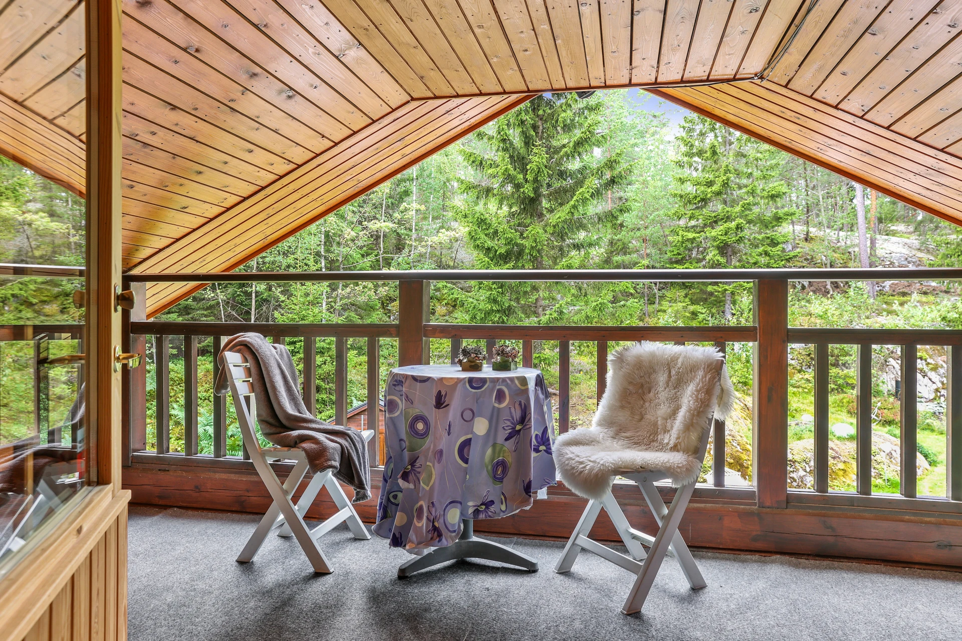 Från allrummet nås denna underbara och mysiga balkong med charmigt snedtak i trä som skyddar mot regn och blåst. En fantastisk plats att kunna njuta på i trevligt sällskap, med en kopp kaffe eller en svalkande dryck med utsikt över trädgården.