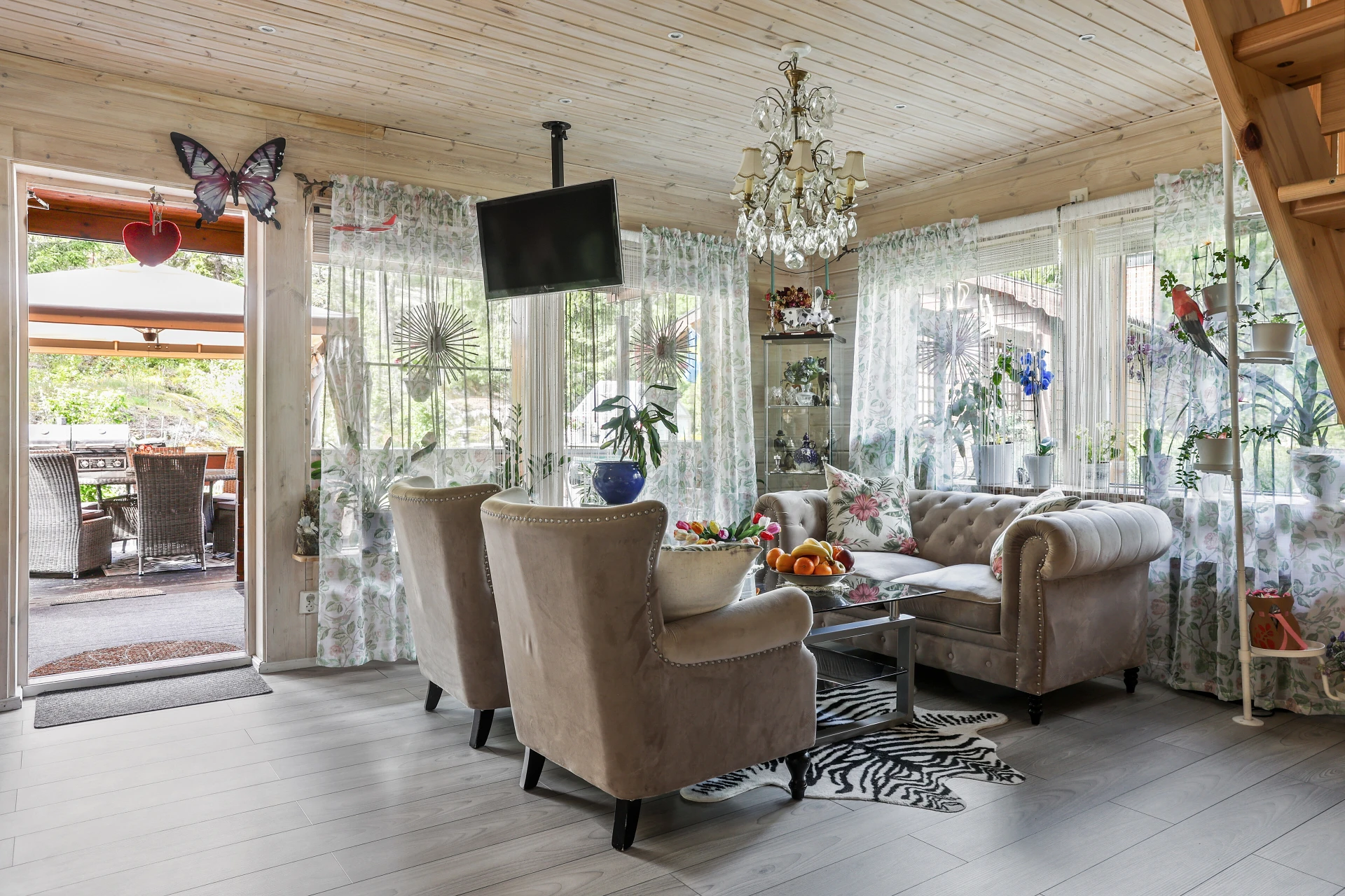 Trivsamt sällskapsrum med plats för hela familjen. Här har ni en trivsam vy från fönsterpartier som vetter i flera väderstreck med utsikt mot den grönskande trädgården. God plats för soffgrupp, fåtölj, soffbord, vitrinskåp samt mediamöbel. Trägolv och tapetserade väggar med träpanel i tak.