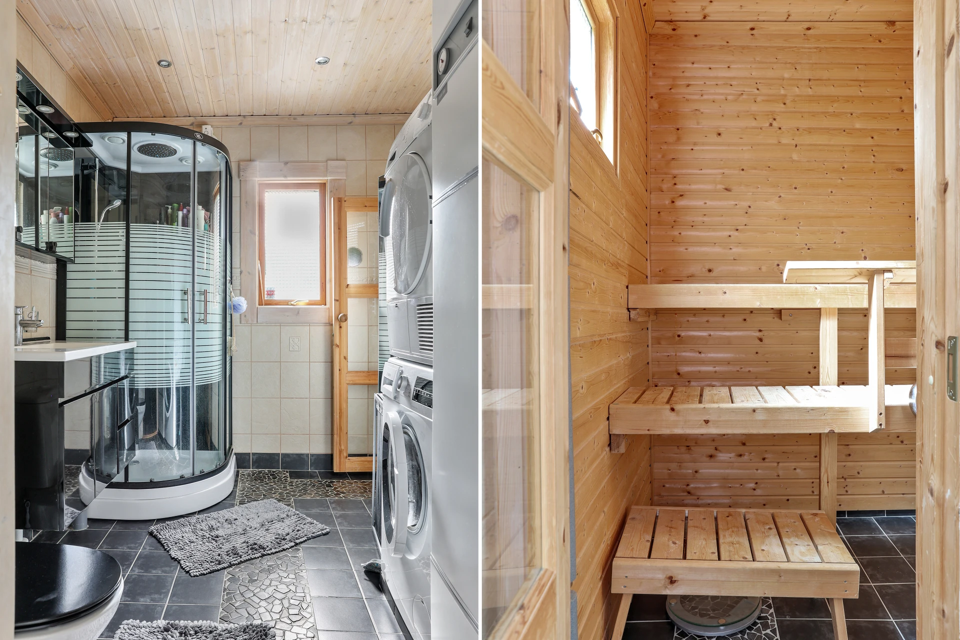 Stort badrum med mörkt klinkergolv och beiga kaklade väggar. Inrett med WC, handfat med svart kommod och spegelskåp med belysning ovan, duschkabin och tvättpelare. I anslutning till badrummet finns även en trevlig bastu. Infällda spotlights i tak som är i trä.