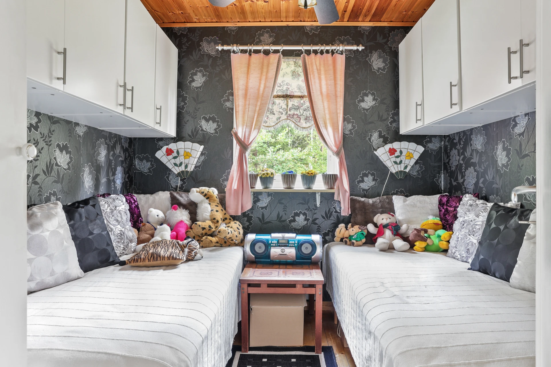 Mindre sovrum med plats för bäddsoffa och bord, samt bra förvaring i garderob med skjutdörrar. Parkettgolv och träpanel på väggar och i tak.