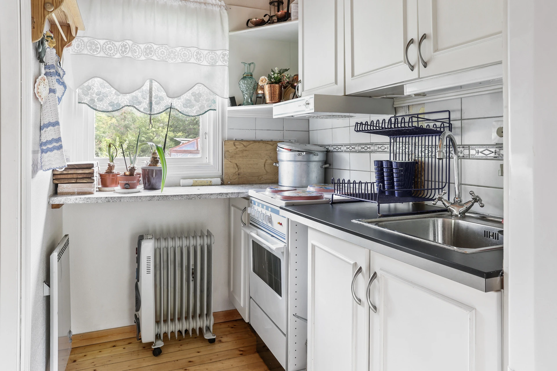 Mysigt kök med trivsam vy från fönsterparti som vetter ut mot trädgården och dess härliga grönska. Vita skåpluckor och vitt kakel med bård ovan arbetsbänk. Den maskinella utrustningen består av spis, ugn, kolfilter, diskho i rostfritt med blandare i krom och kyl/frys. Trägolv och ljusa väggar.