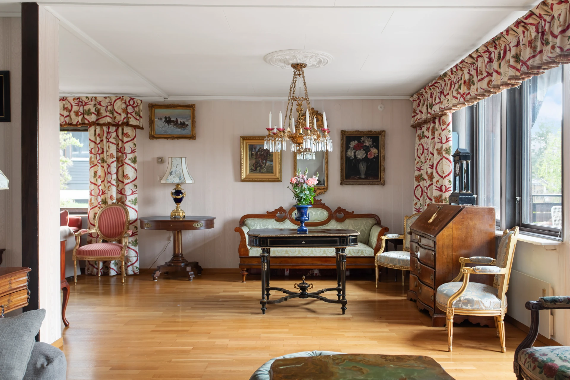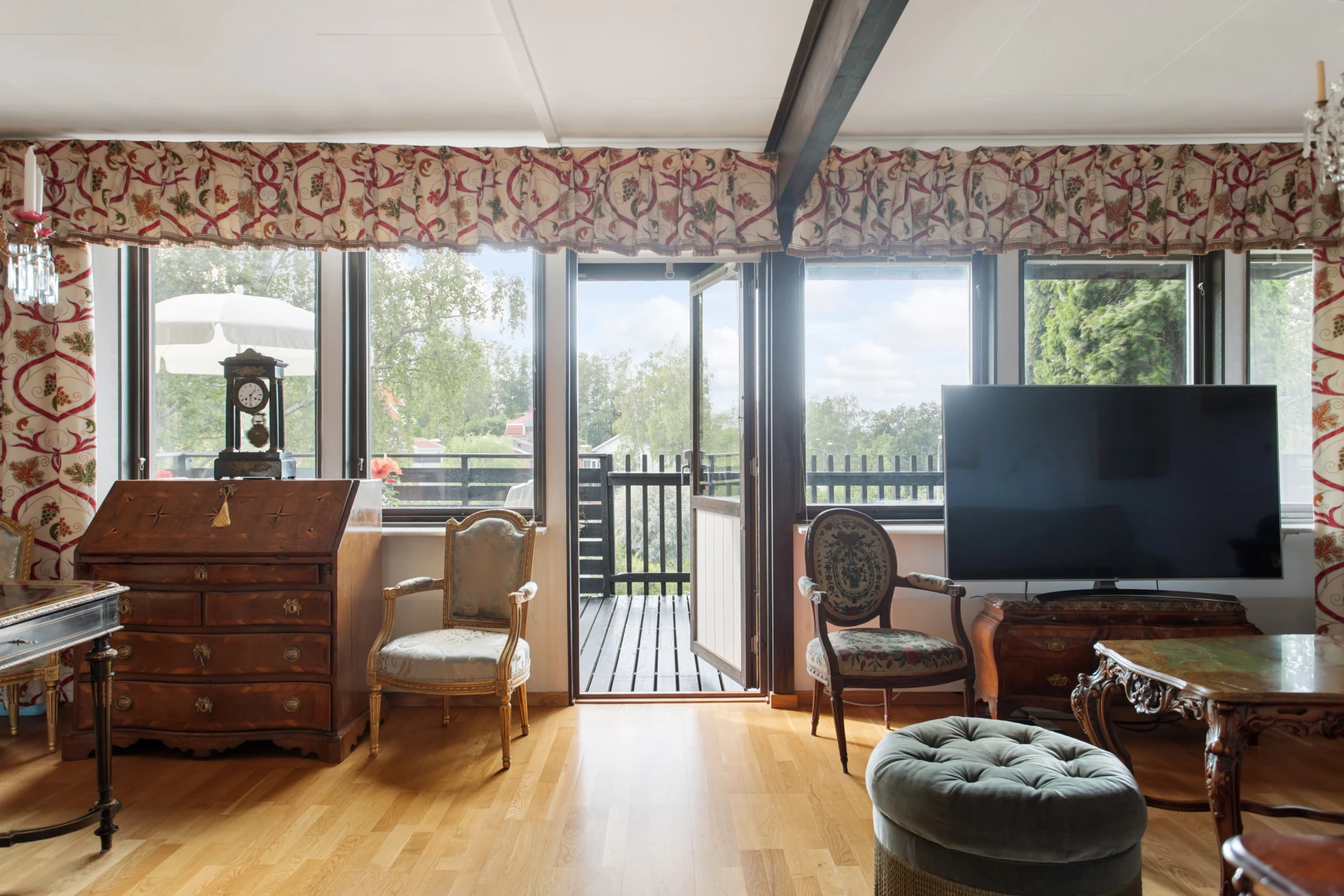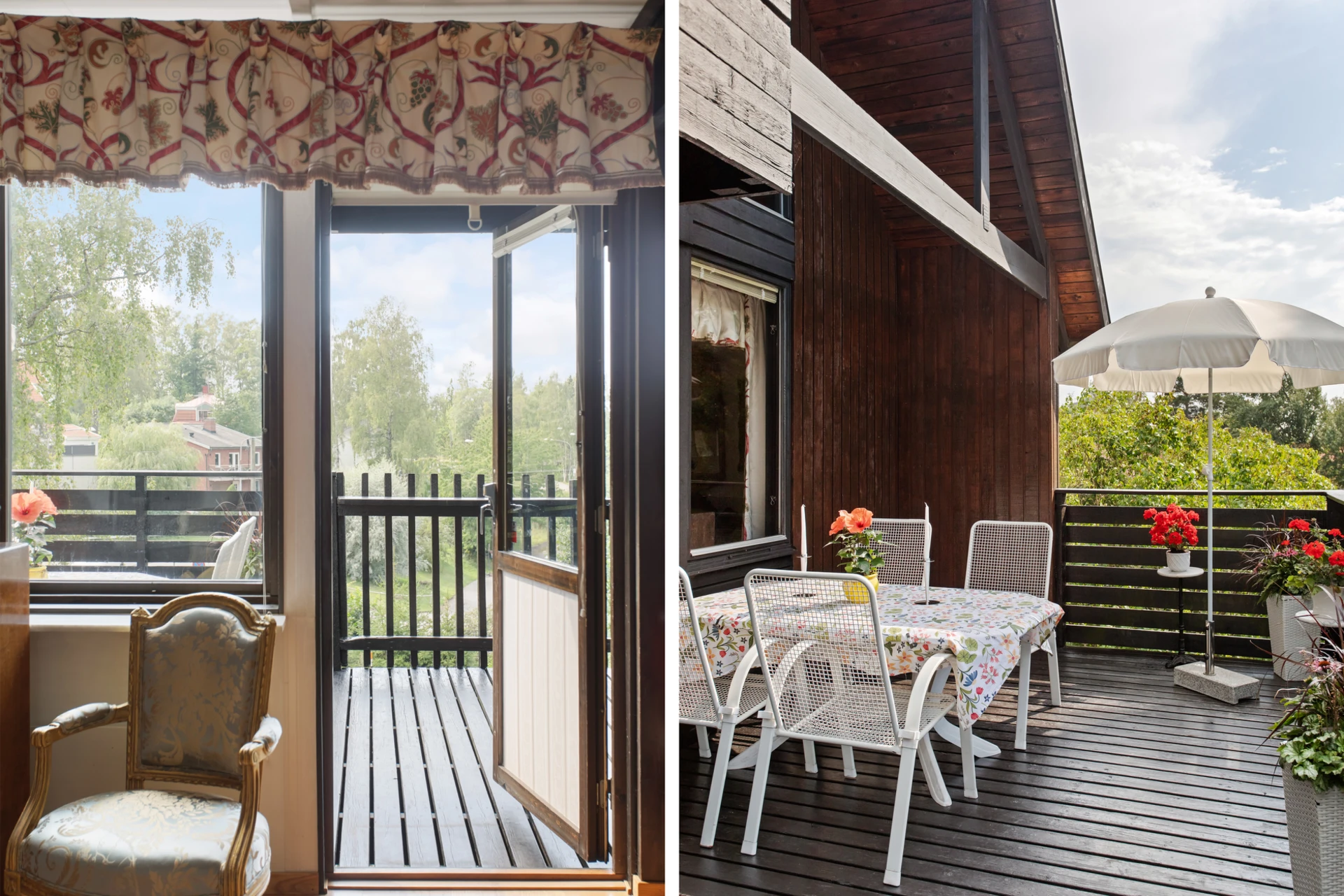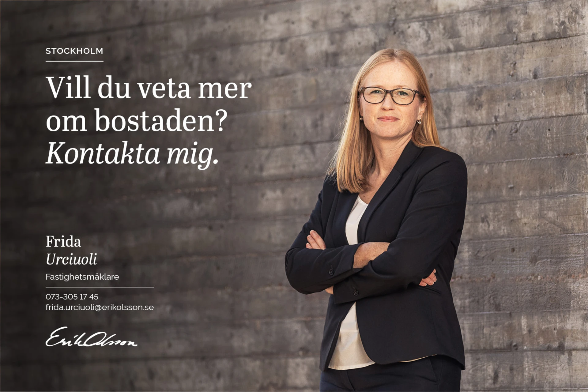 Parkettgolv och tapetserade ljusa väggar. Rummet går att dela av till ytterligare ett sovrum. Fönsterpartier och utgång till altan.