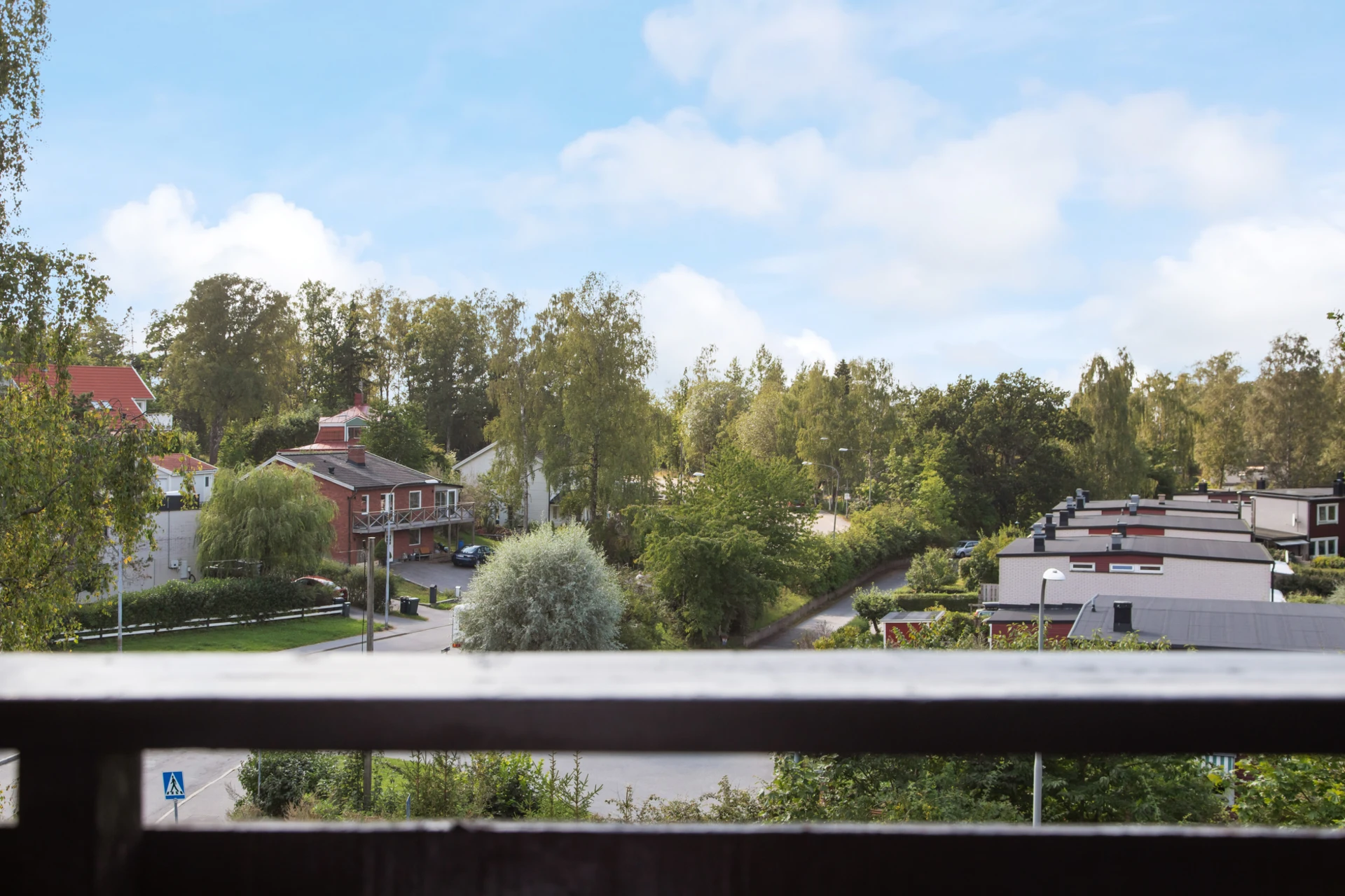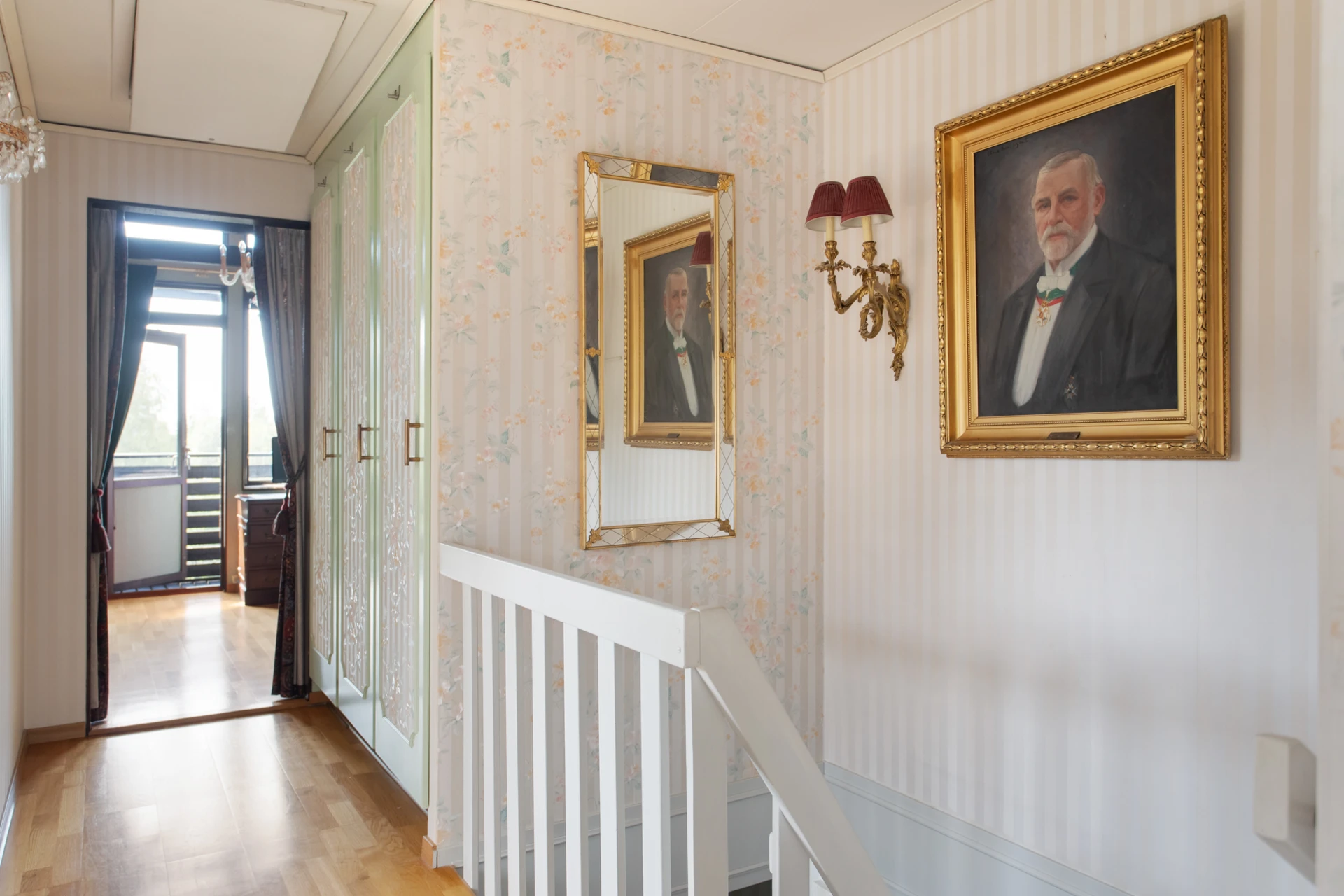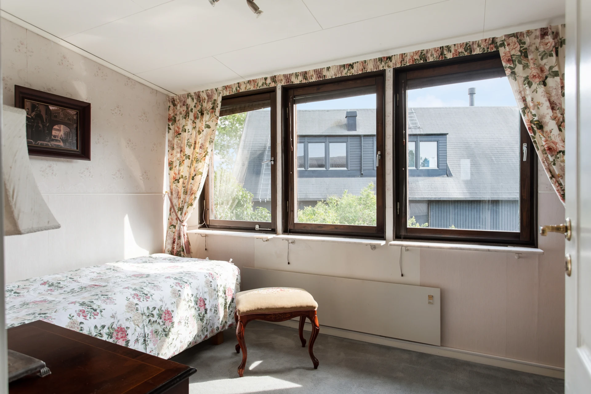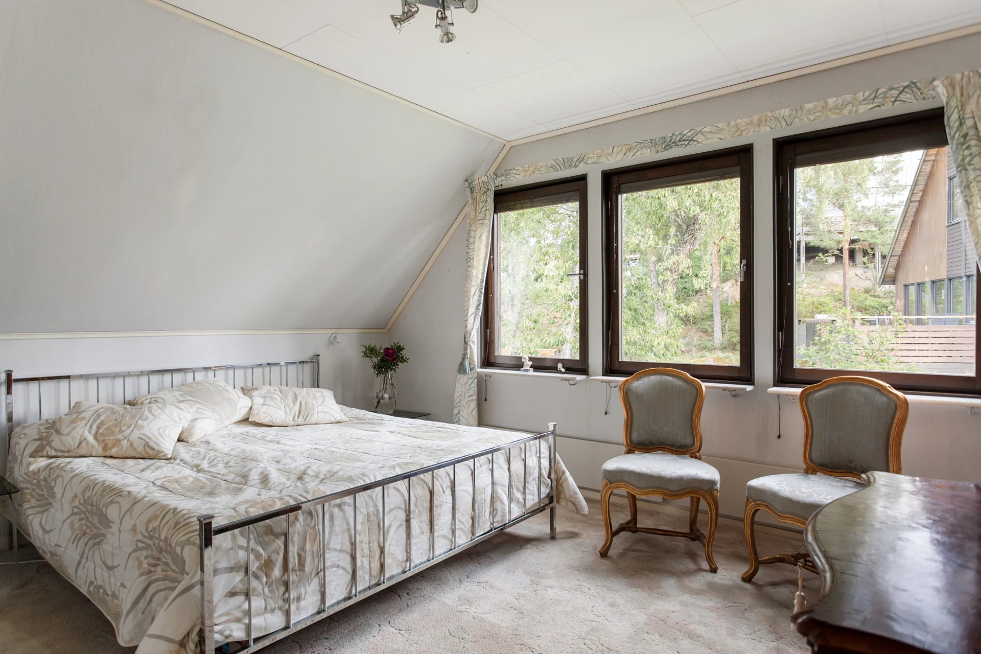Parkettgolv och ljusa väggar samt snedtak. Stort fönsterparti och utgång till balkong. Tre inbyggda garderober intill trappen. Takvärme.