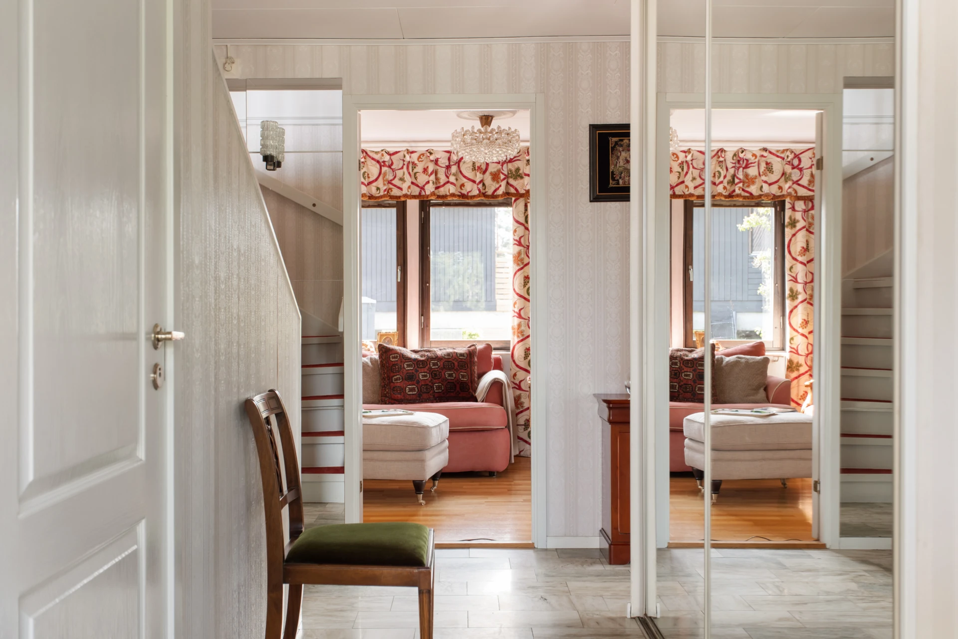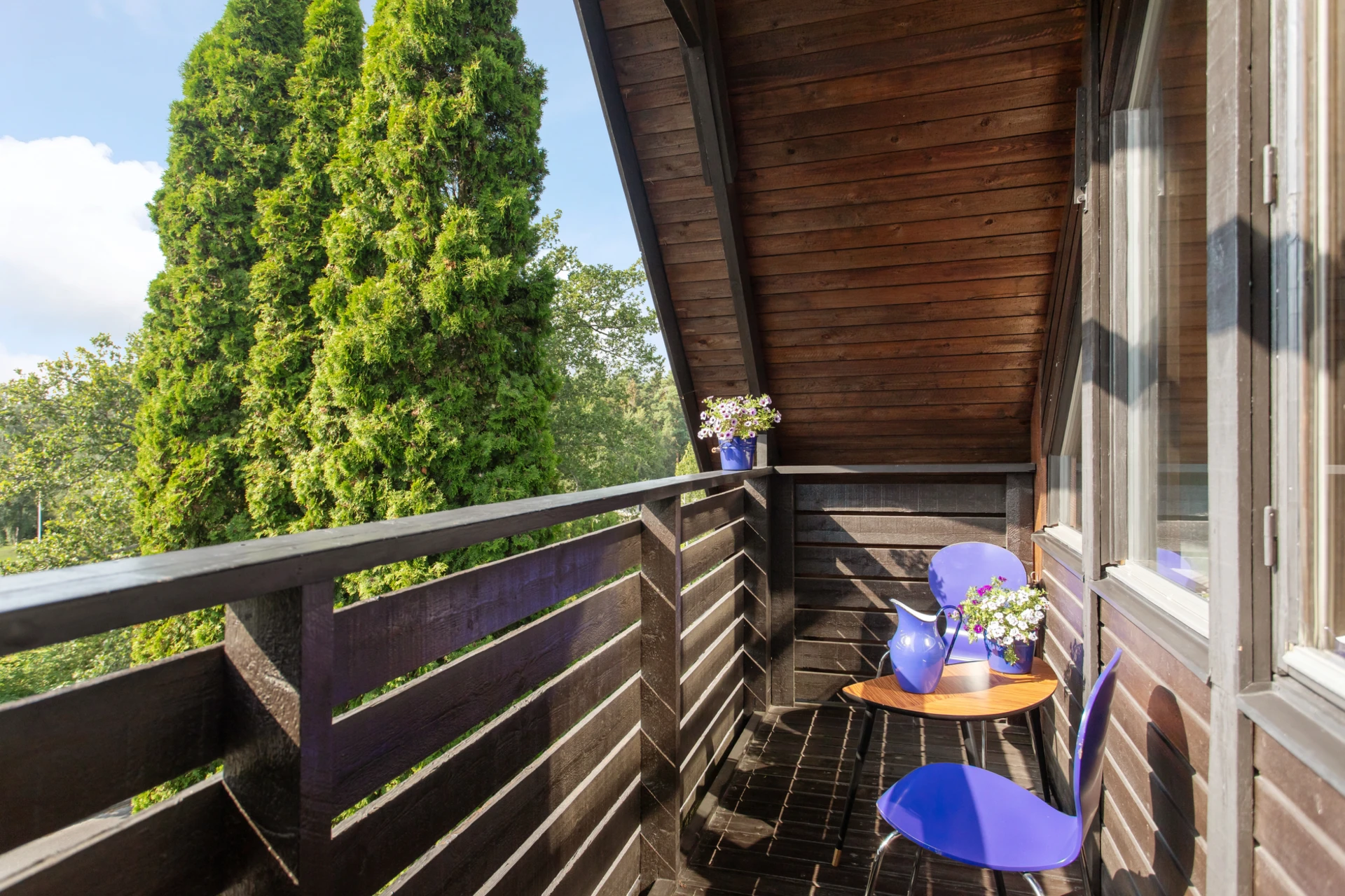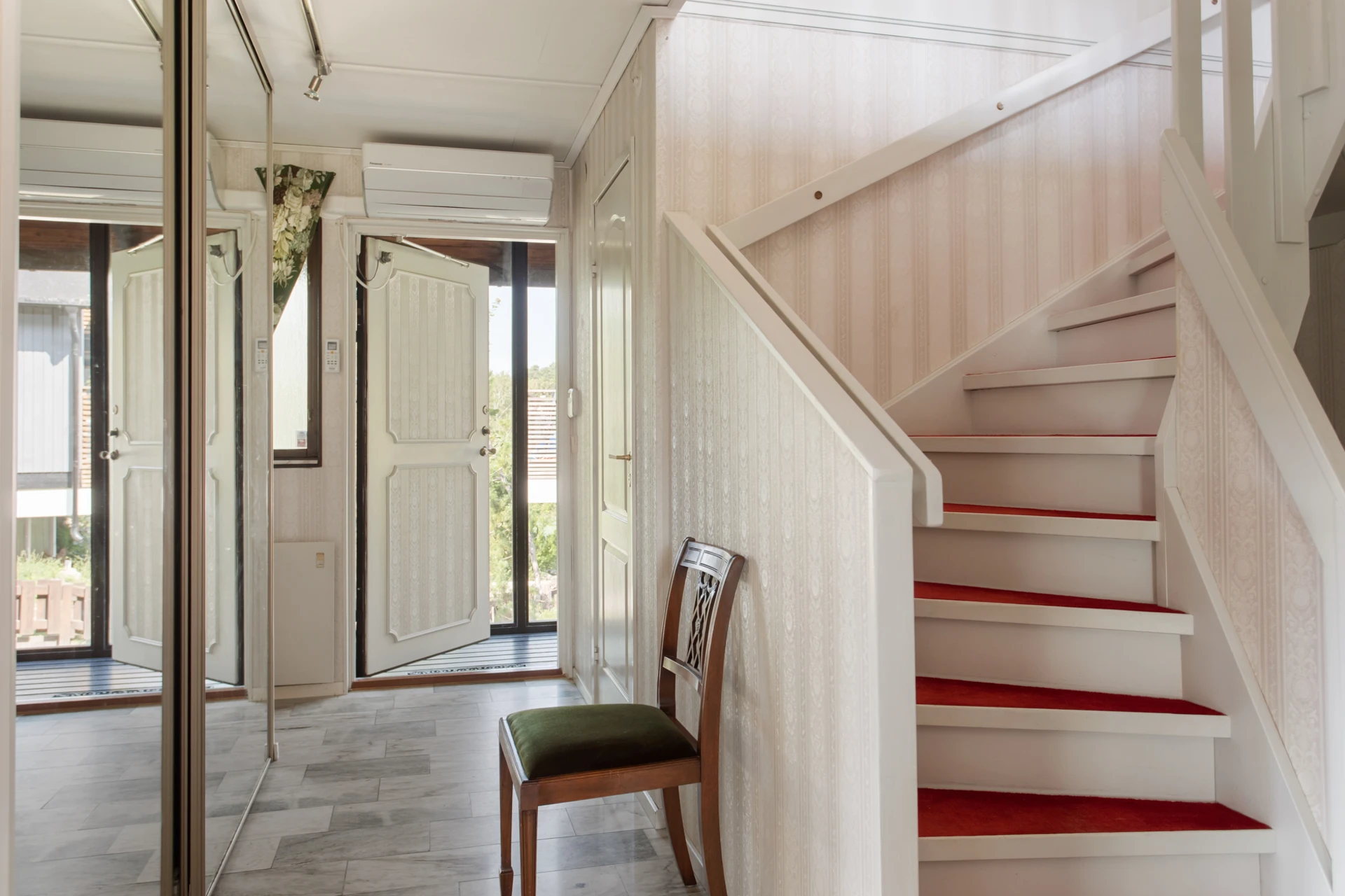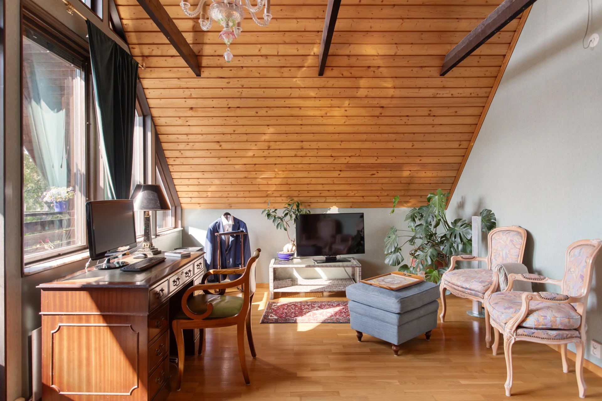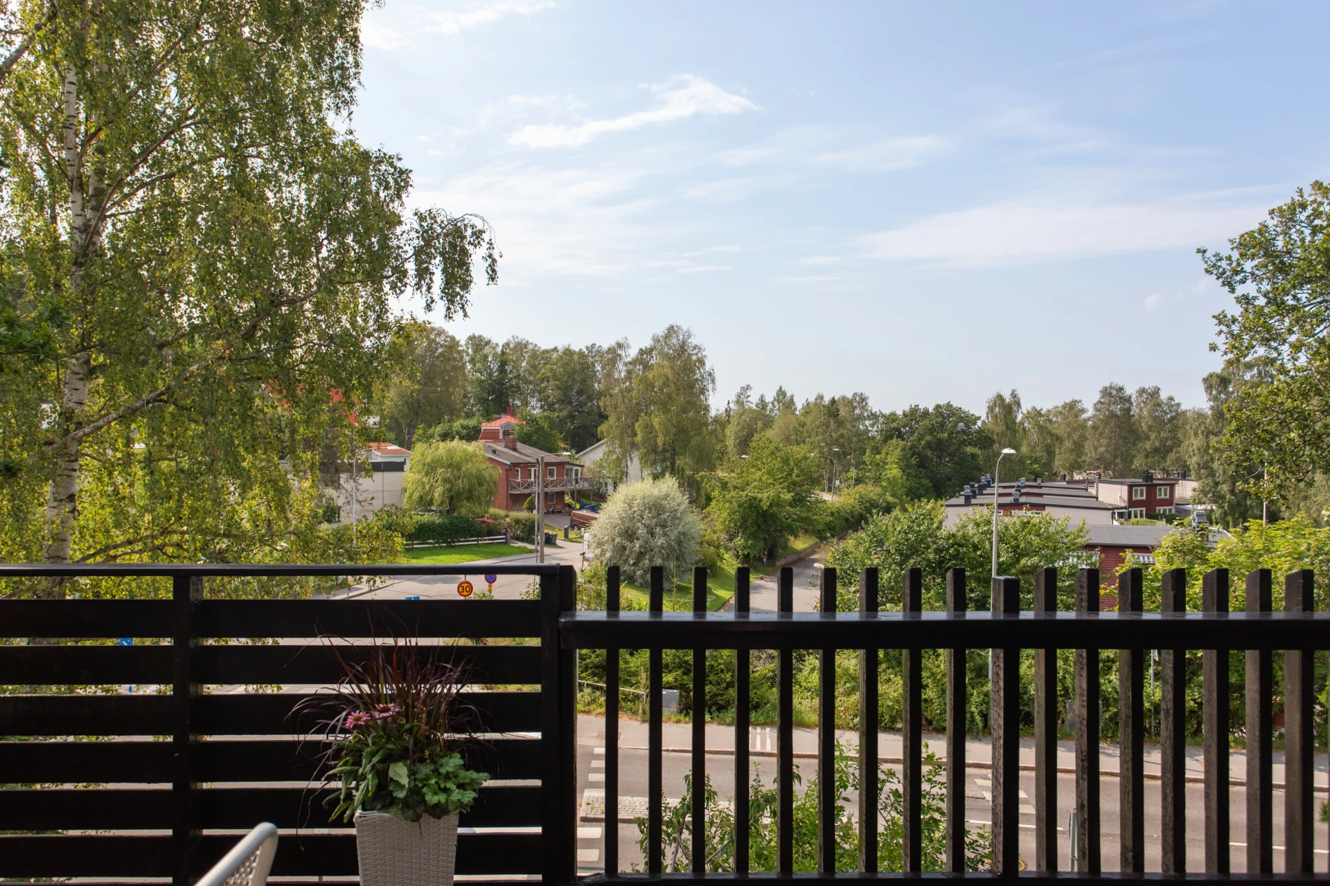 Parkettgolv och ljusa väggar samt snedtak. Stort fönsterparti och utgång till balkong. Tre inbyggda garderober intill trappen. Takvärme.