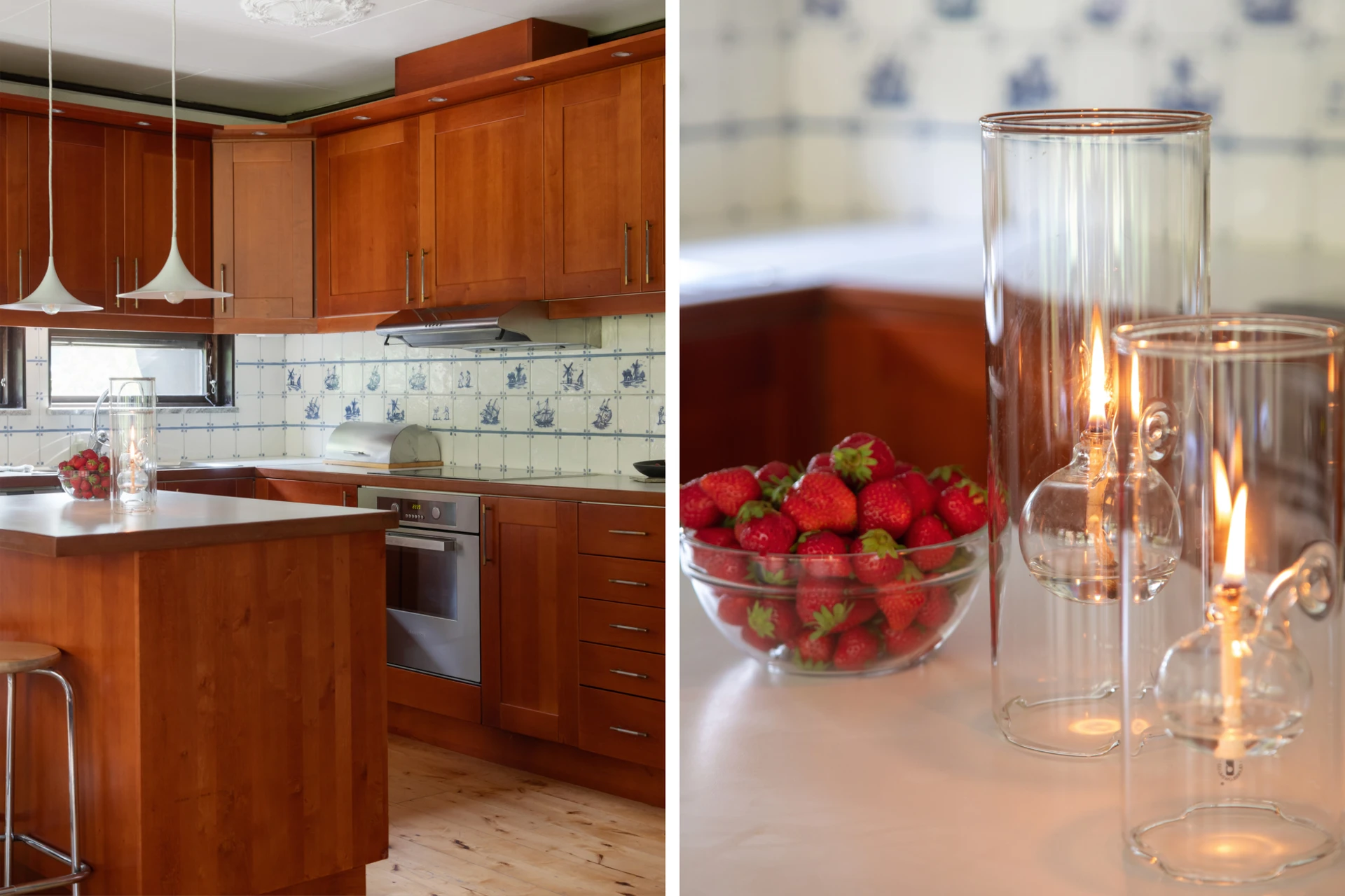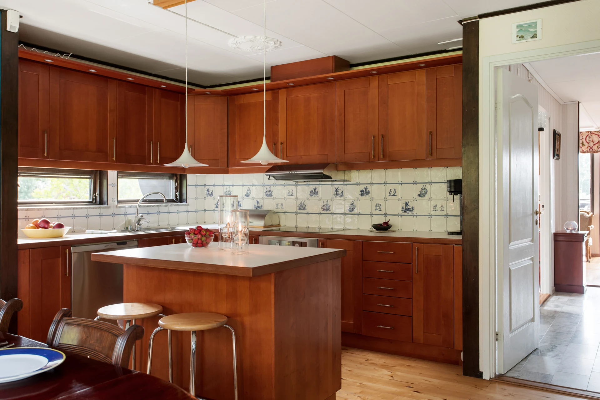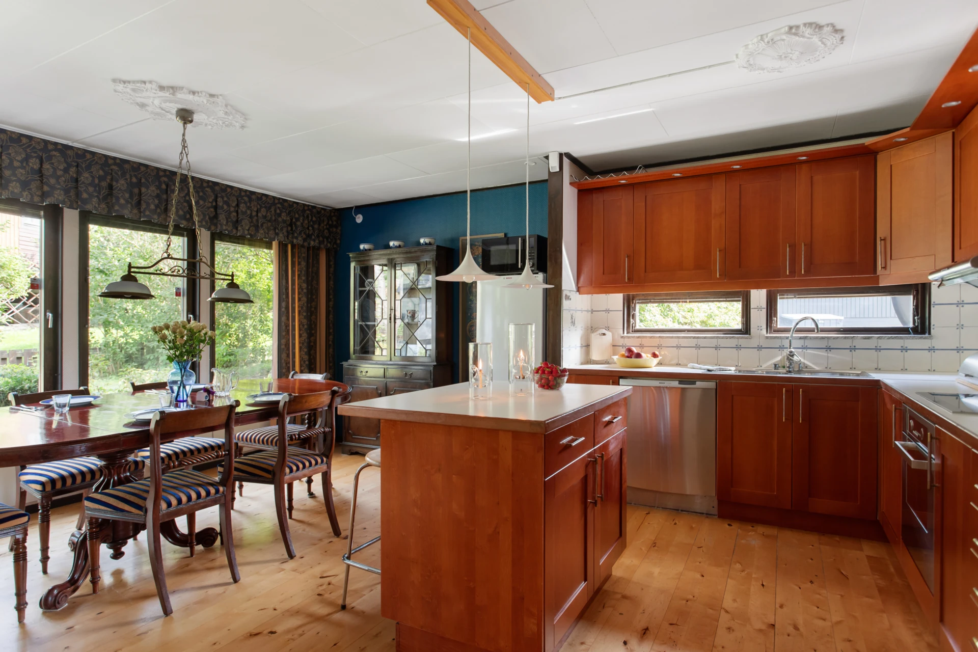 Parkettgolv, skåpsluckor i körsbärsträ och ljust kakel ovan arbetsytor. Köksö, kyl/frys, diskmaskin, ugn, häll och fläkt. Infälld belysning och två fönster ovan arbetsytor.