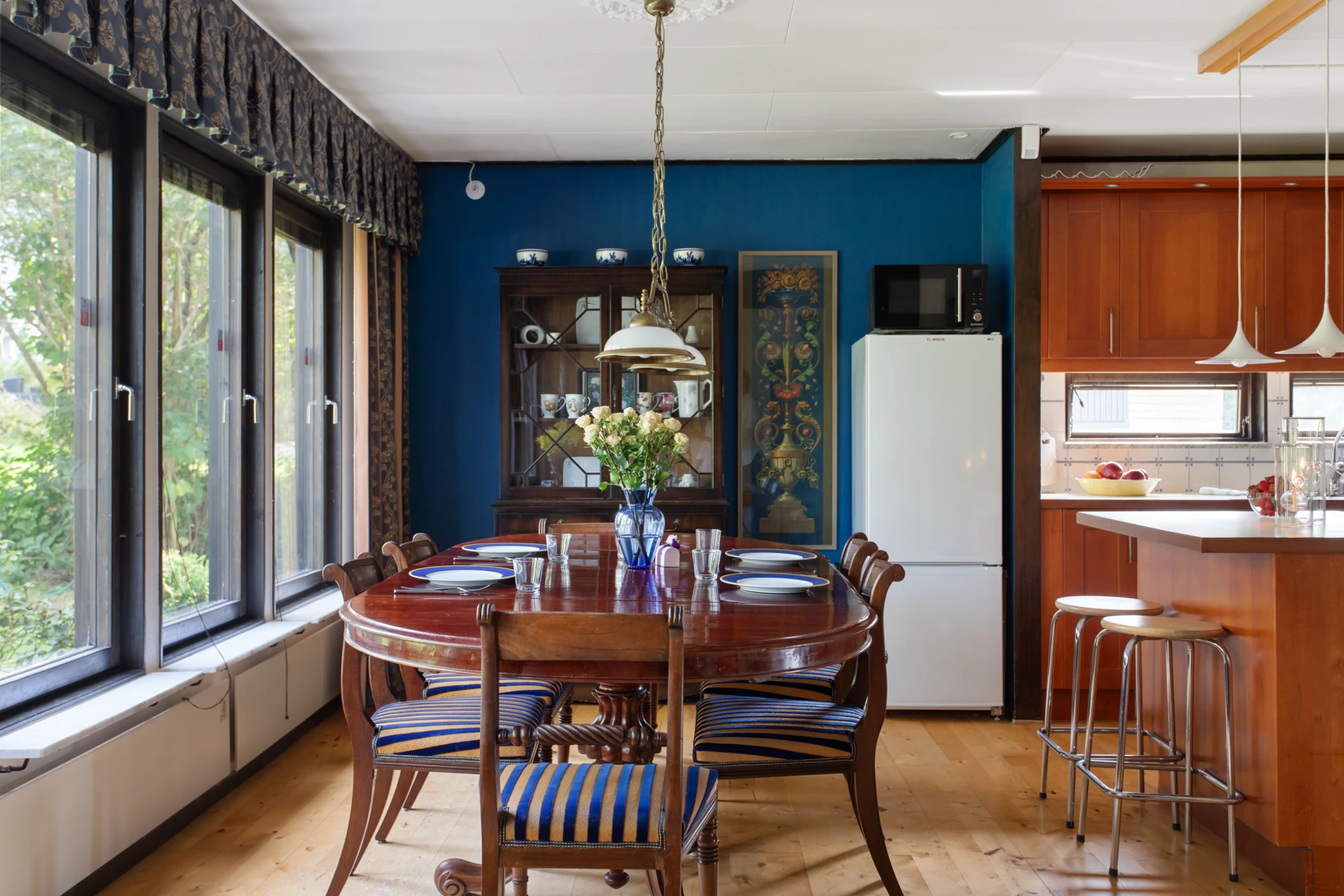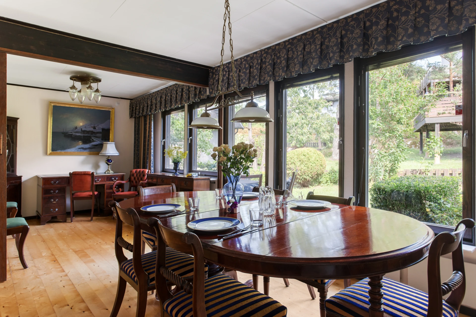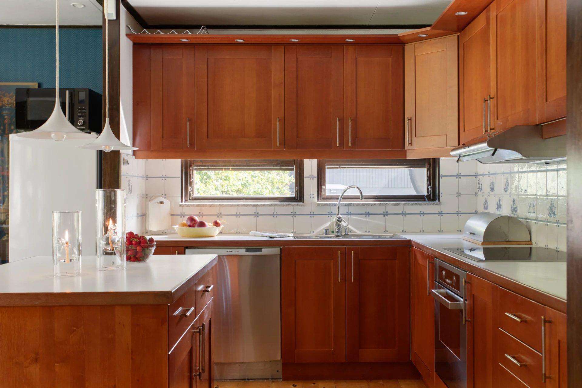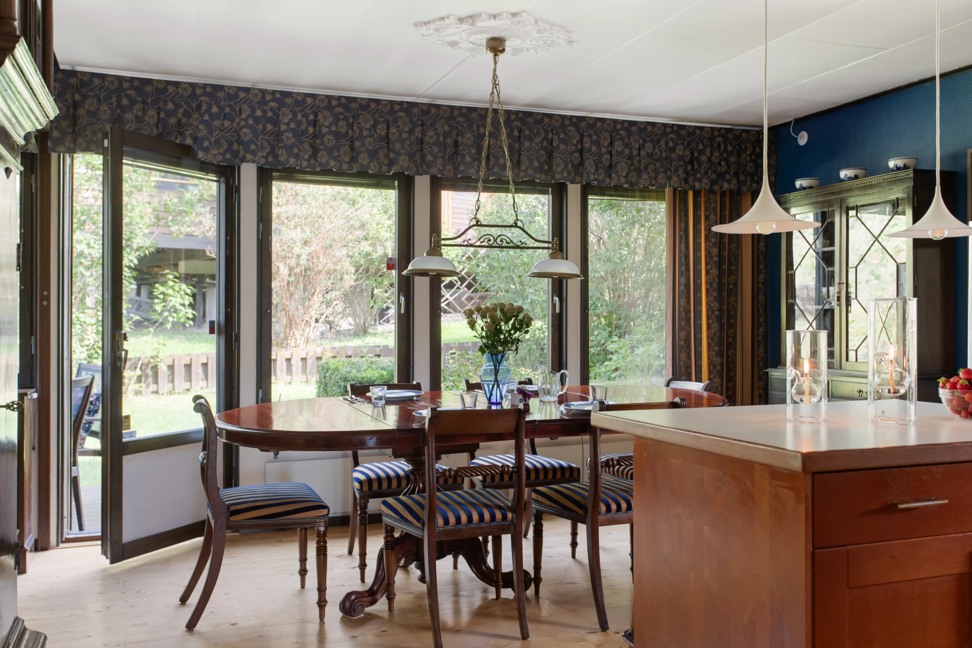 Parkettgolv, skåpsluckor i körsbärsträ och ljust kakel ovan arbetsytor. Köksö, kyl/frys, diskmaskin, ugn, häll och fläkt. Infälld belysning och två fönster ovan arbetsytor.